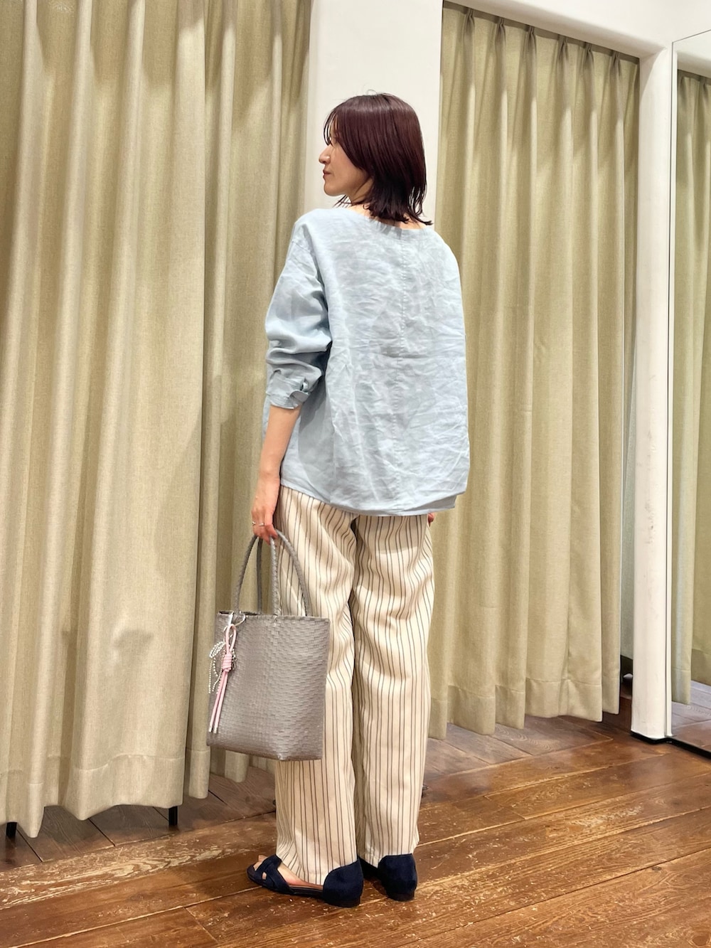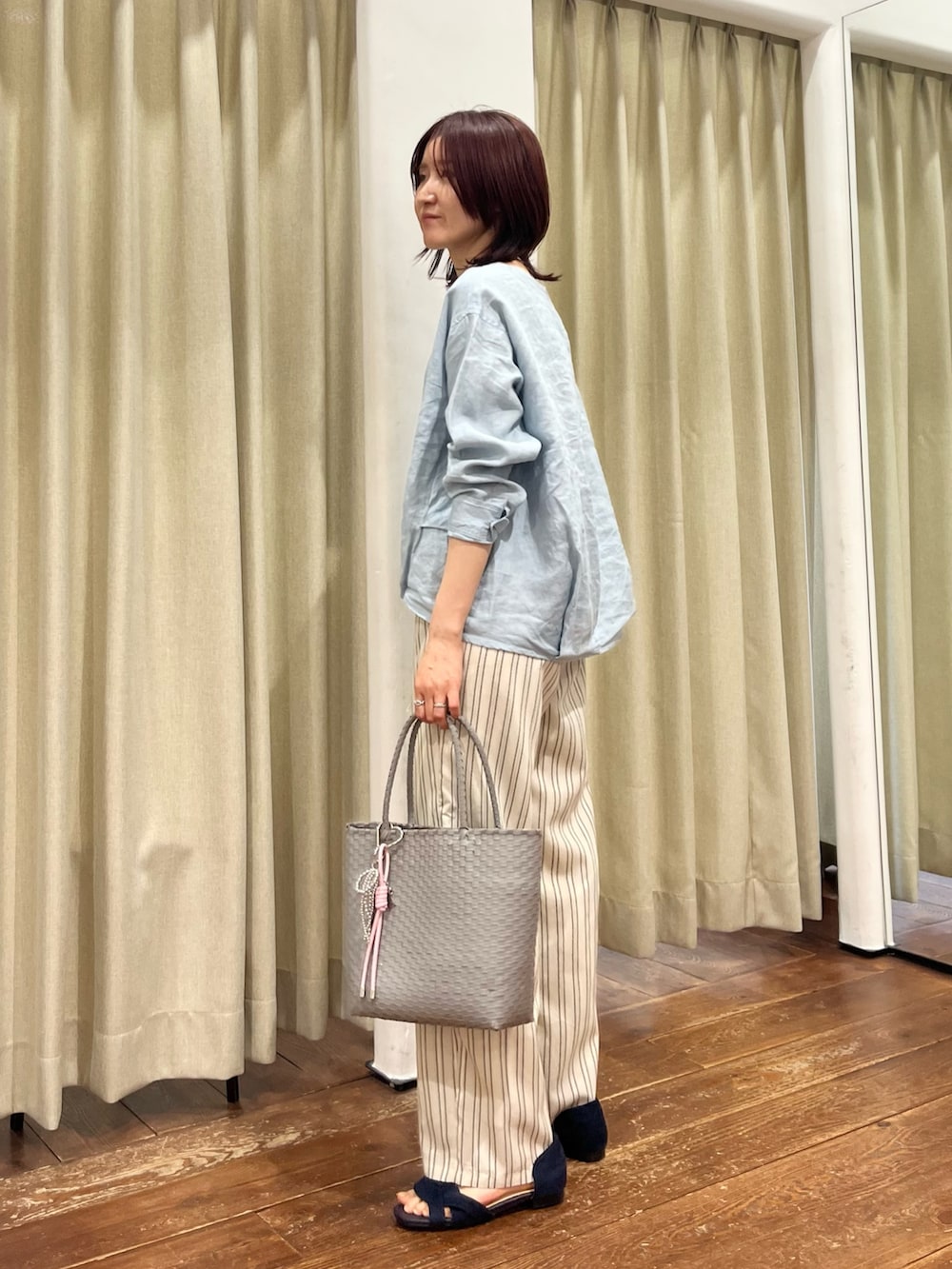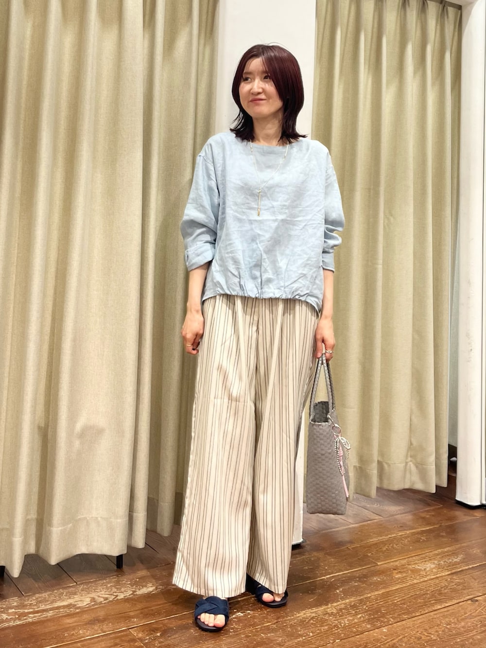 合わせたパンツはストライプが印象的で、生地はサラッとしているので履き心地も良いです。フリーサイズでウエストが少し大きめだったのて一折りして履いています。