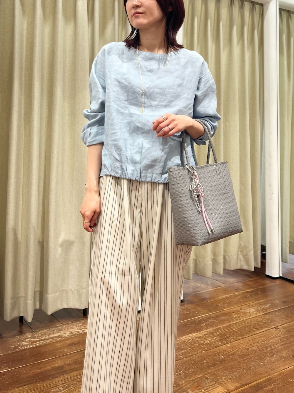 ブラウスは前側が短めで後ろは少し長さがありタックのデザインになっているのでどんなボトムスにも合わせやすいです。