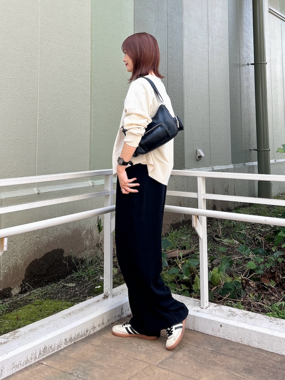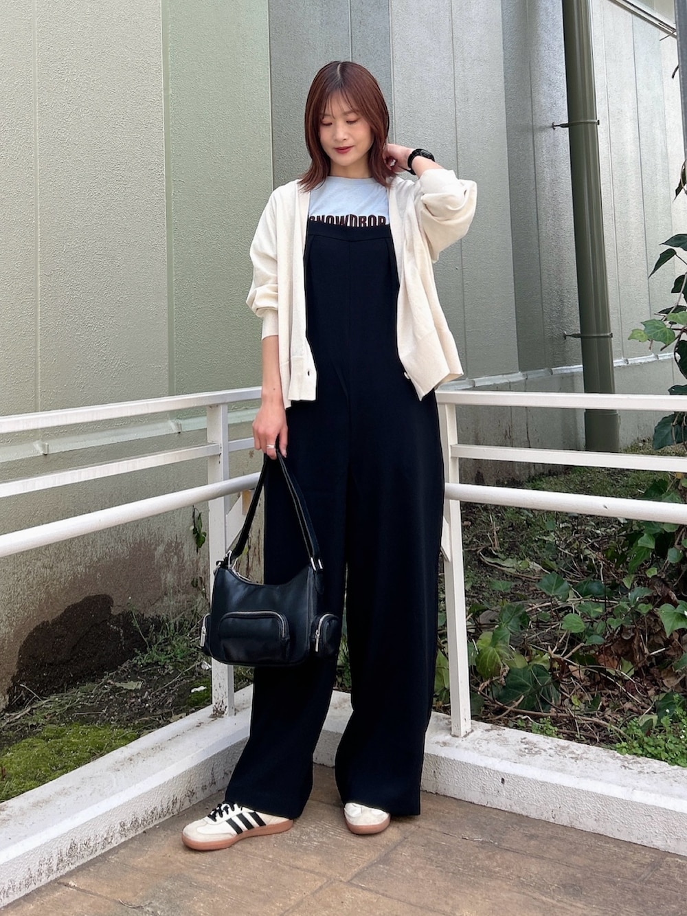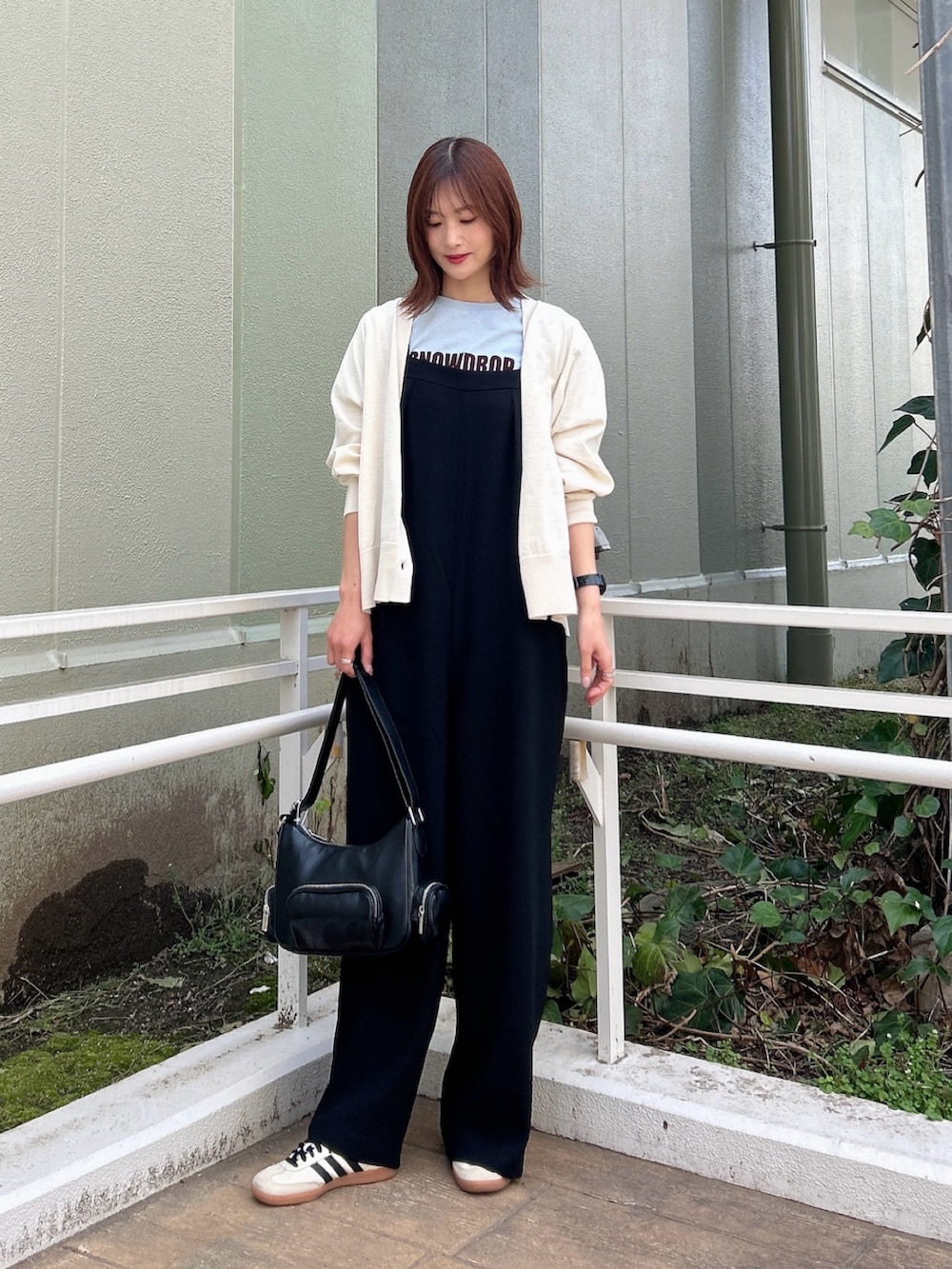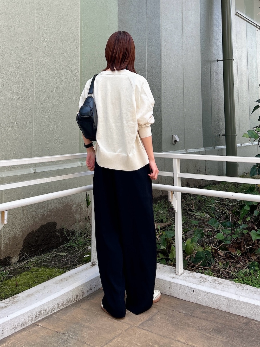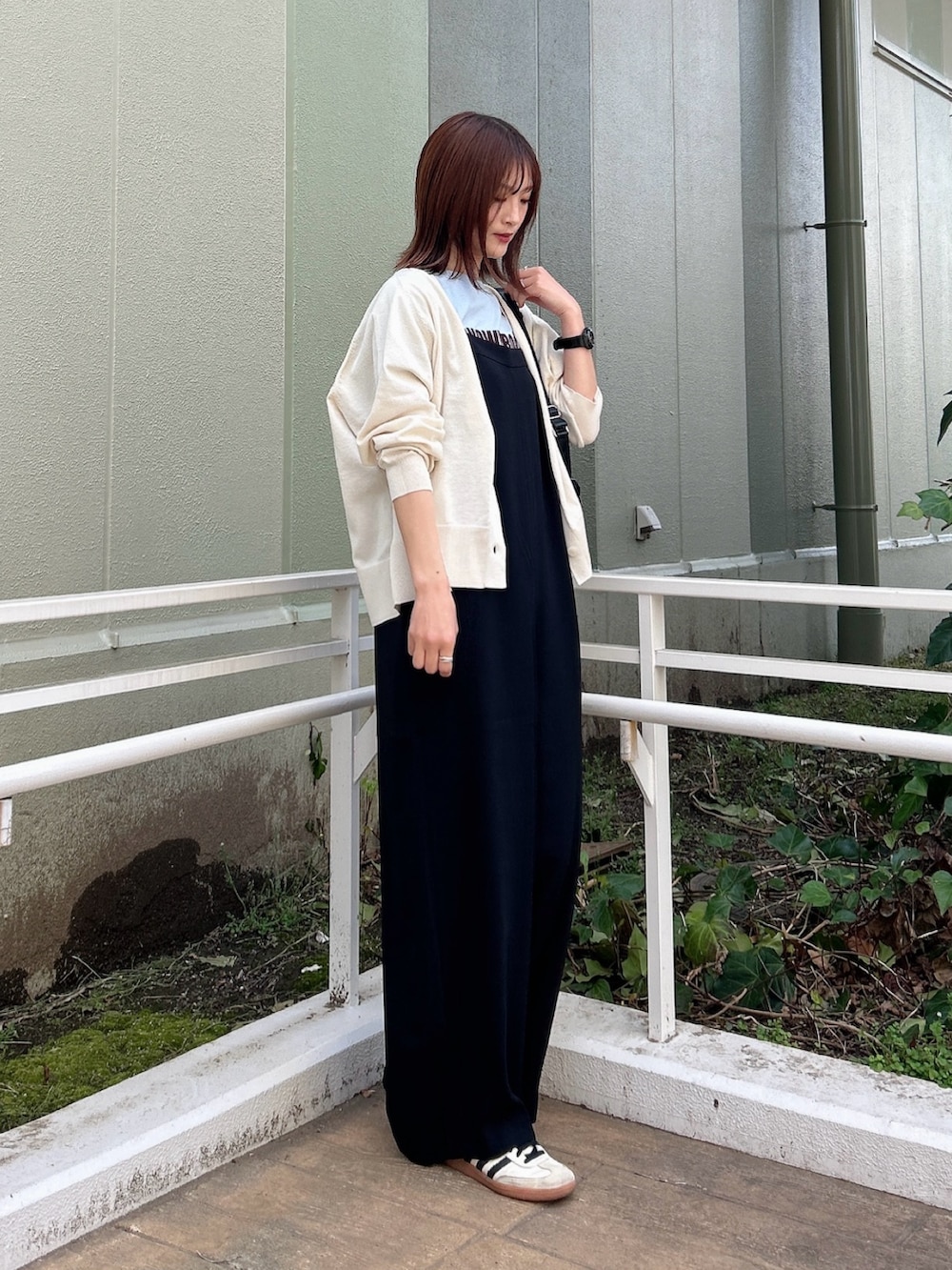 さらに、お尻周りをカバーしてくれる丈感のカーディガンを羽織ることで、後ろ姿もスッキリ見えします。