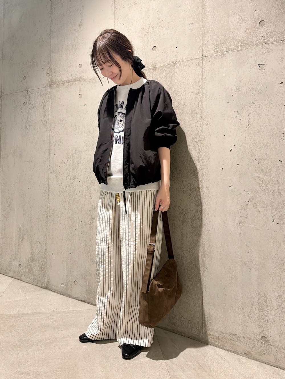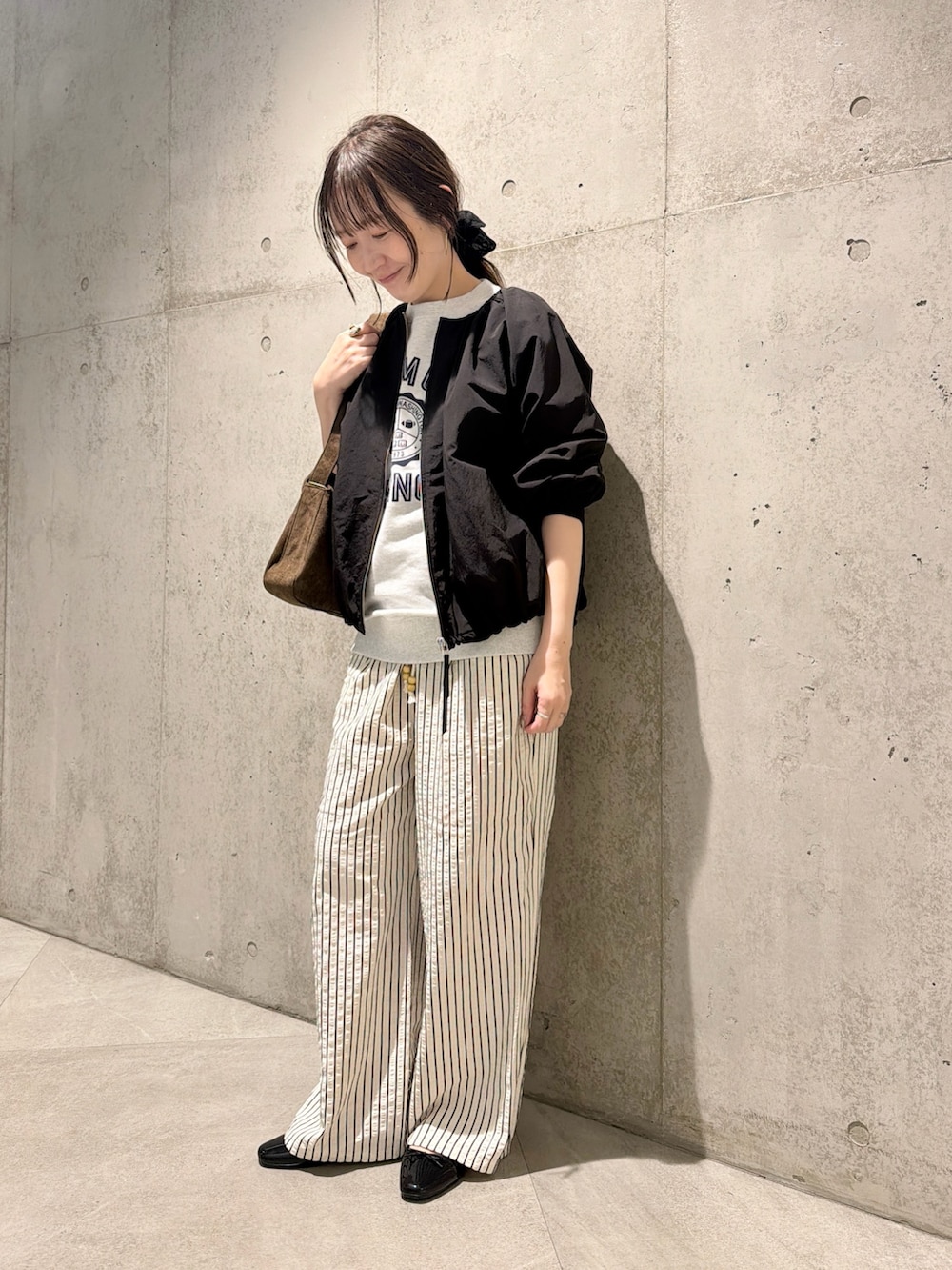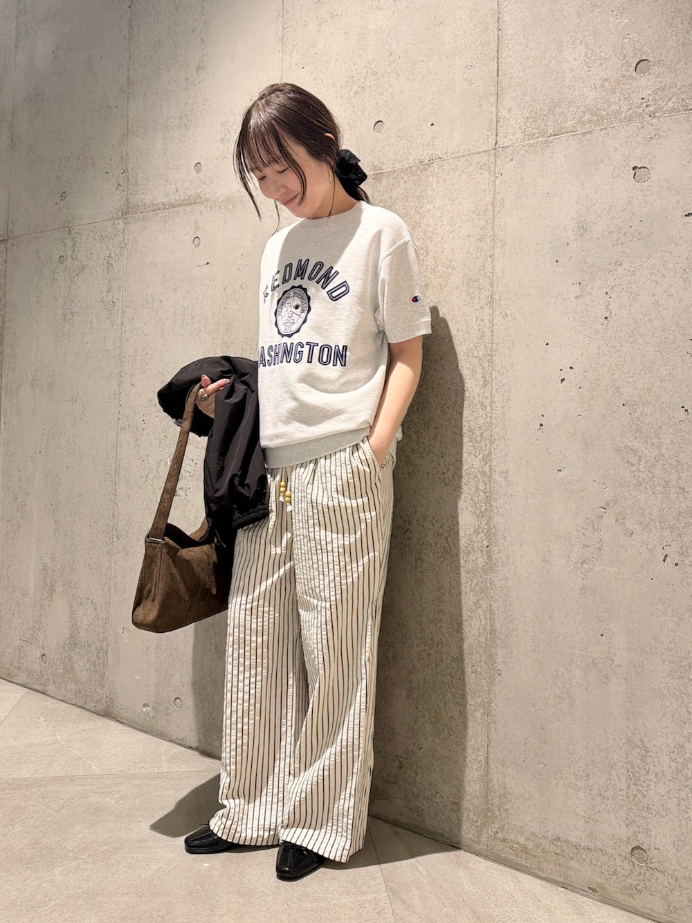 今回は、championのスウェットをアクセントに、ストライプ柄パンツと合わせたリラックススタイル。