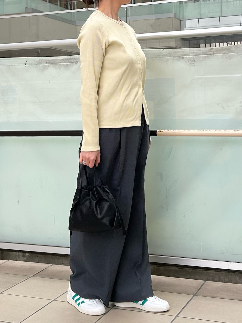 カーディガンはリブになっていて楽な着心地です。ピタッとしすぎず程よいゆとりがあります。