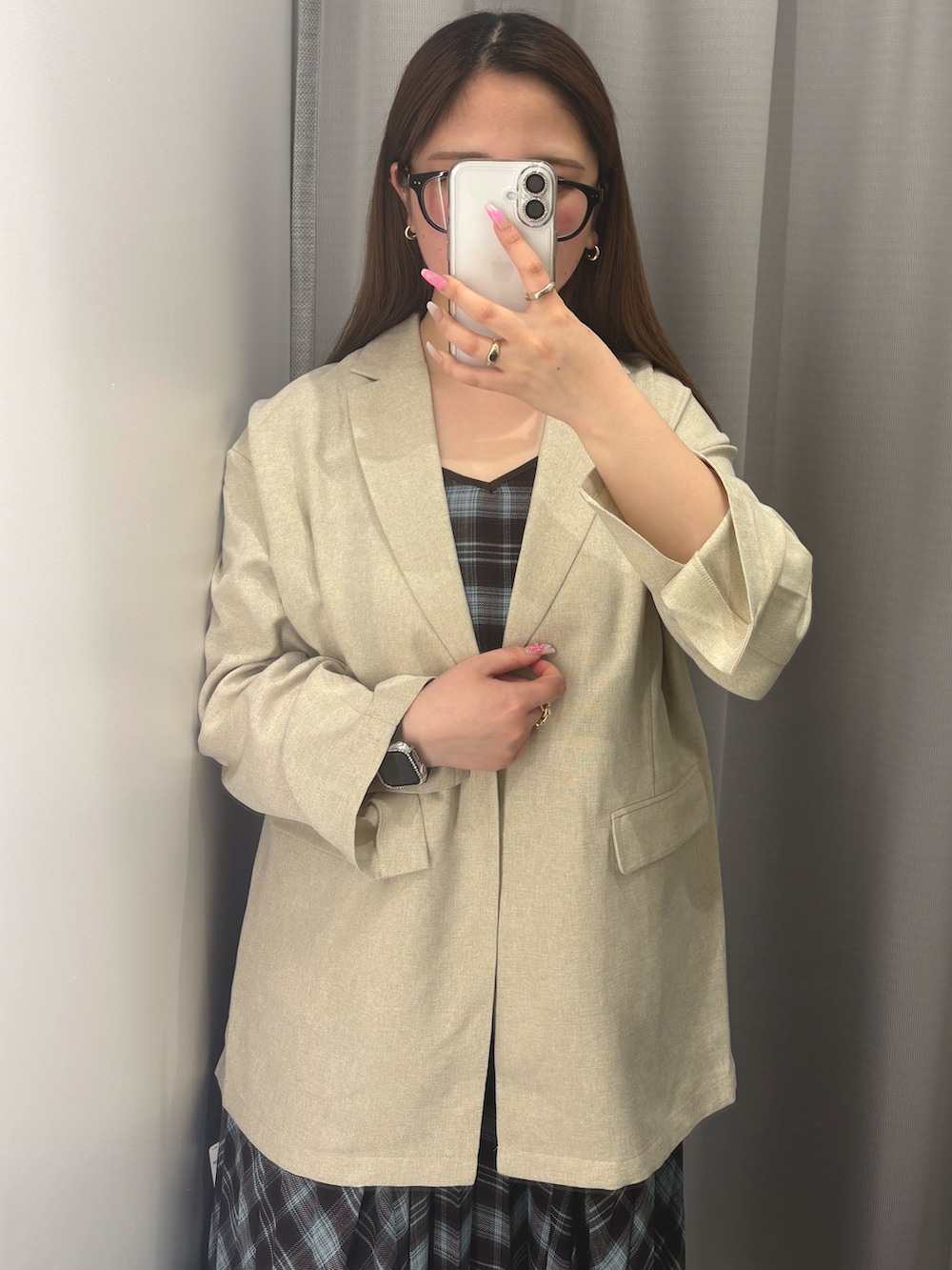 ジャケットはフロントホックの留める位置で表情を変えることもできます。1枚持っておくと着回せるアイテムです。