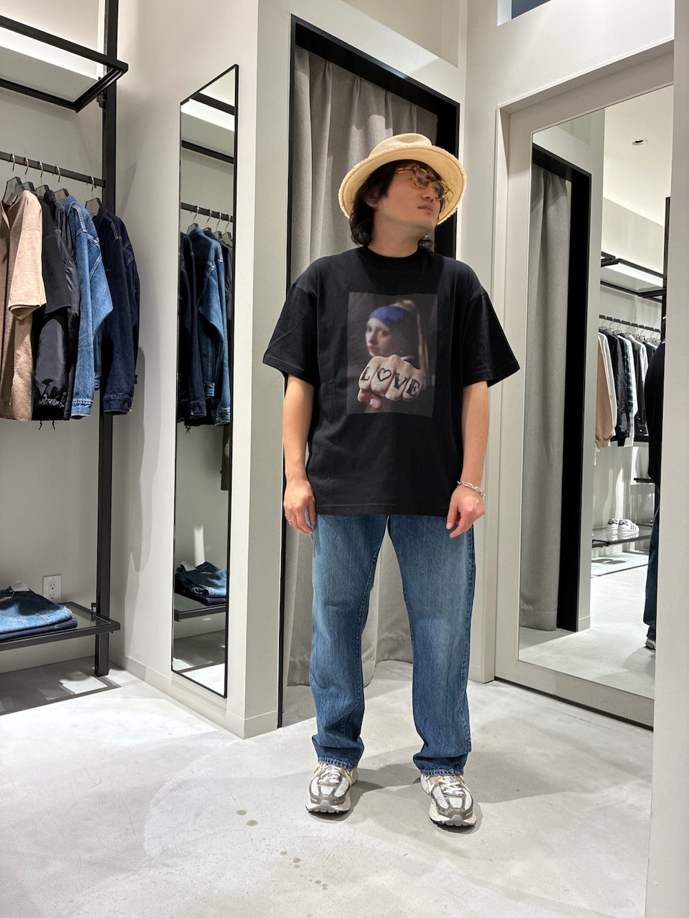 今回はインパクトのあるグラフィックTシャツを主役に、デニムとスニーカーで王道カジュアルにまとめました。