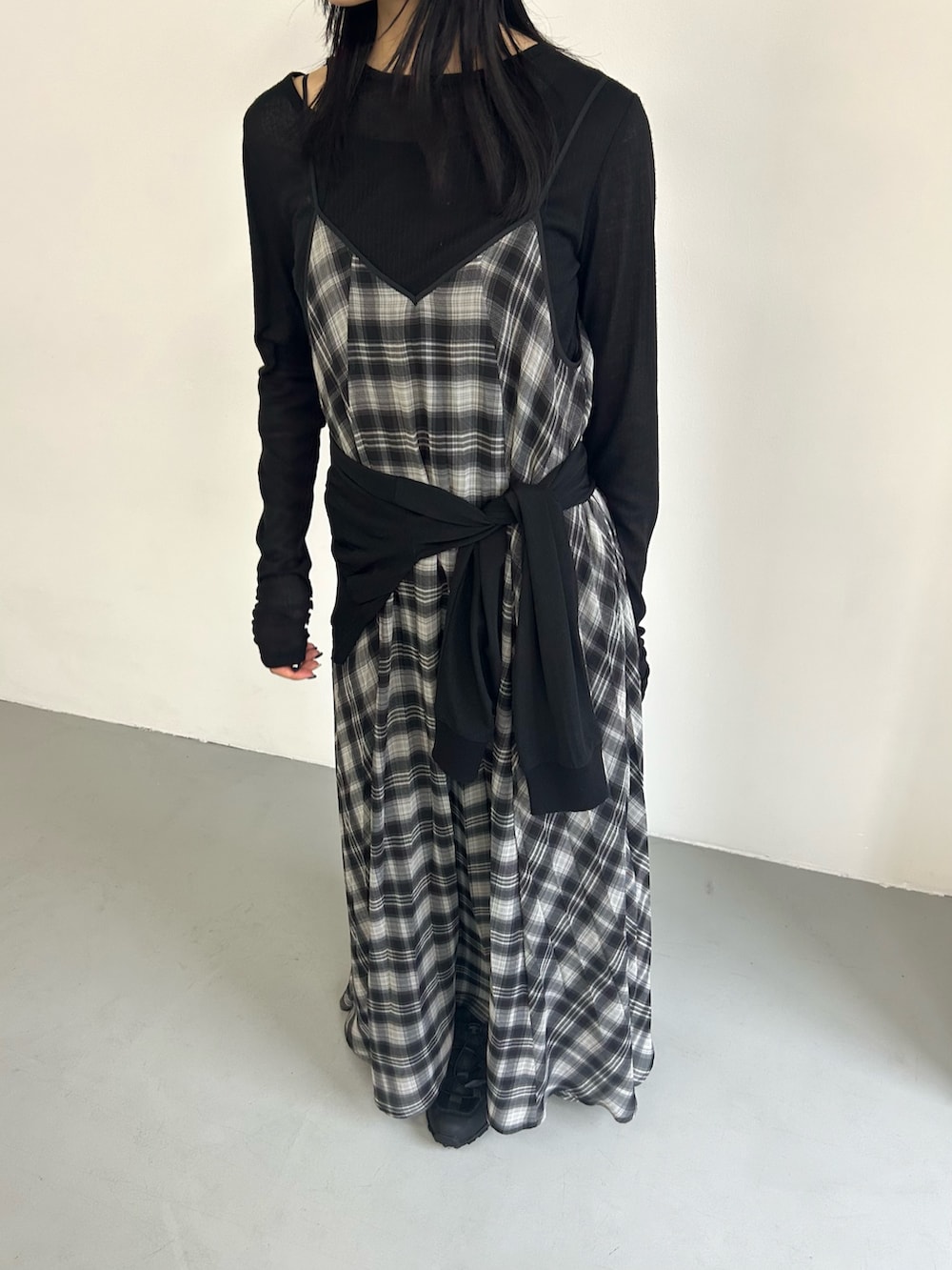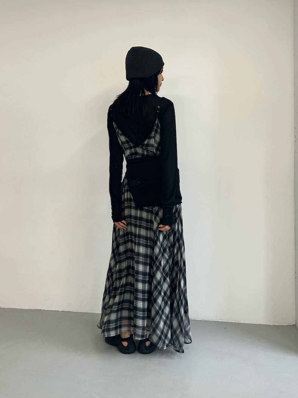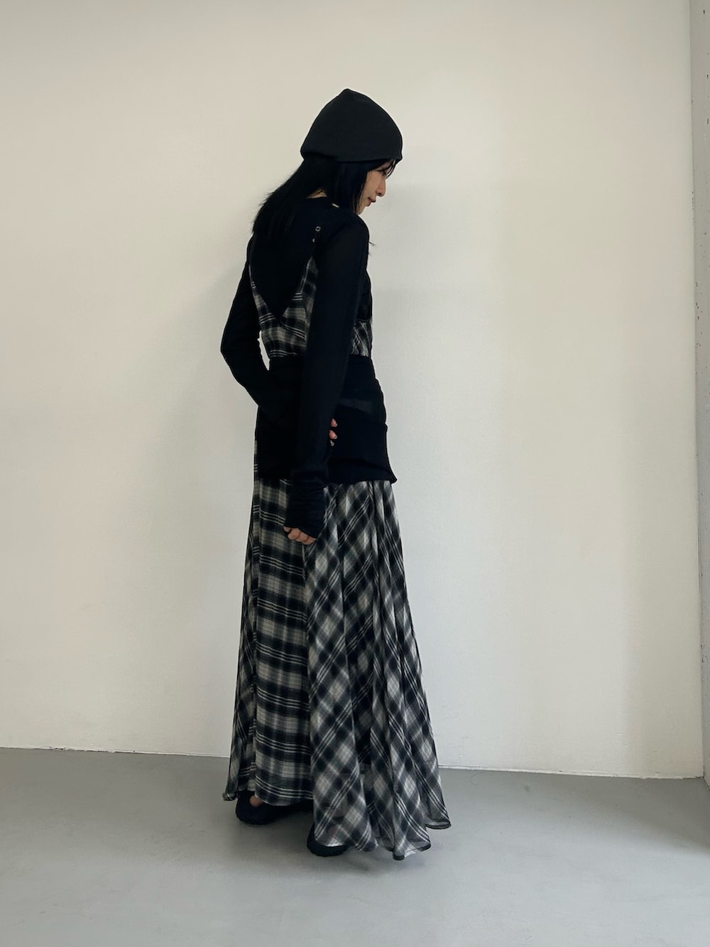 チェックワンピースに、ブラックのレイヤードカットソー、ニット帽を合わせて着てみました。