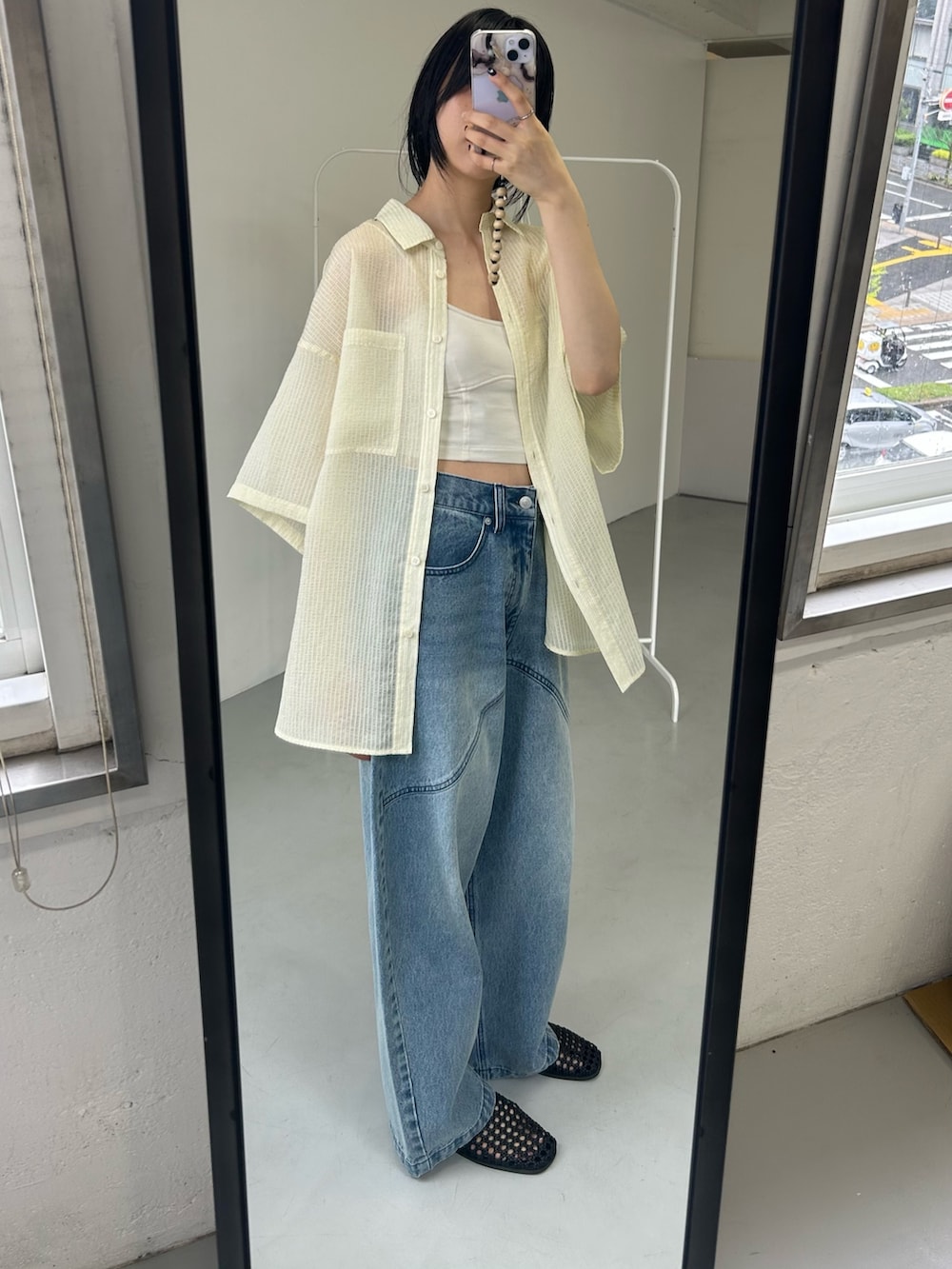 ゆるっとサイズのシャツは前開けで着ても◎