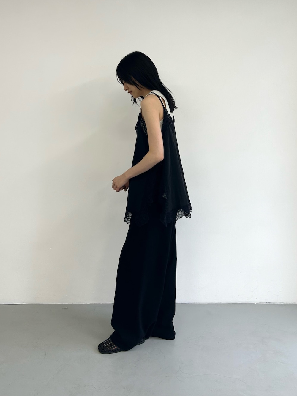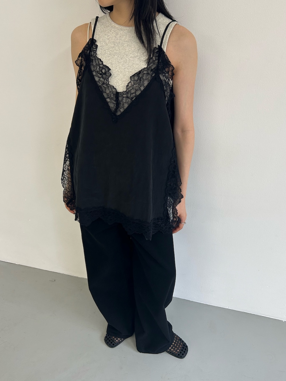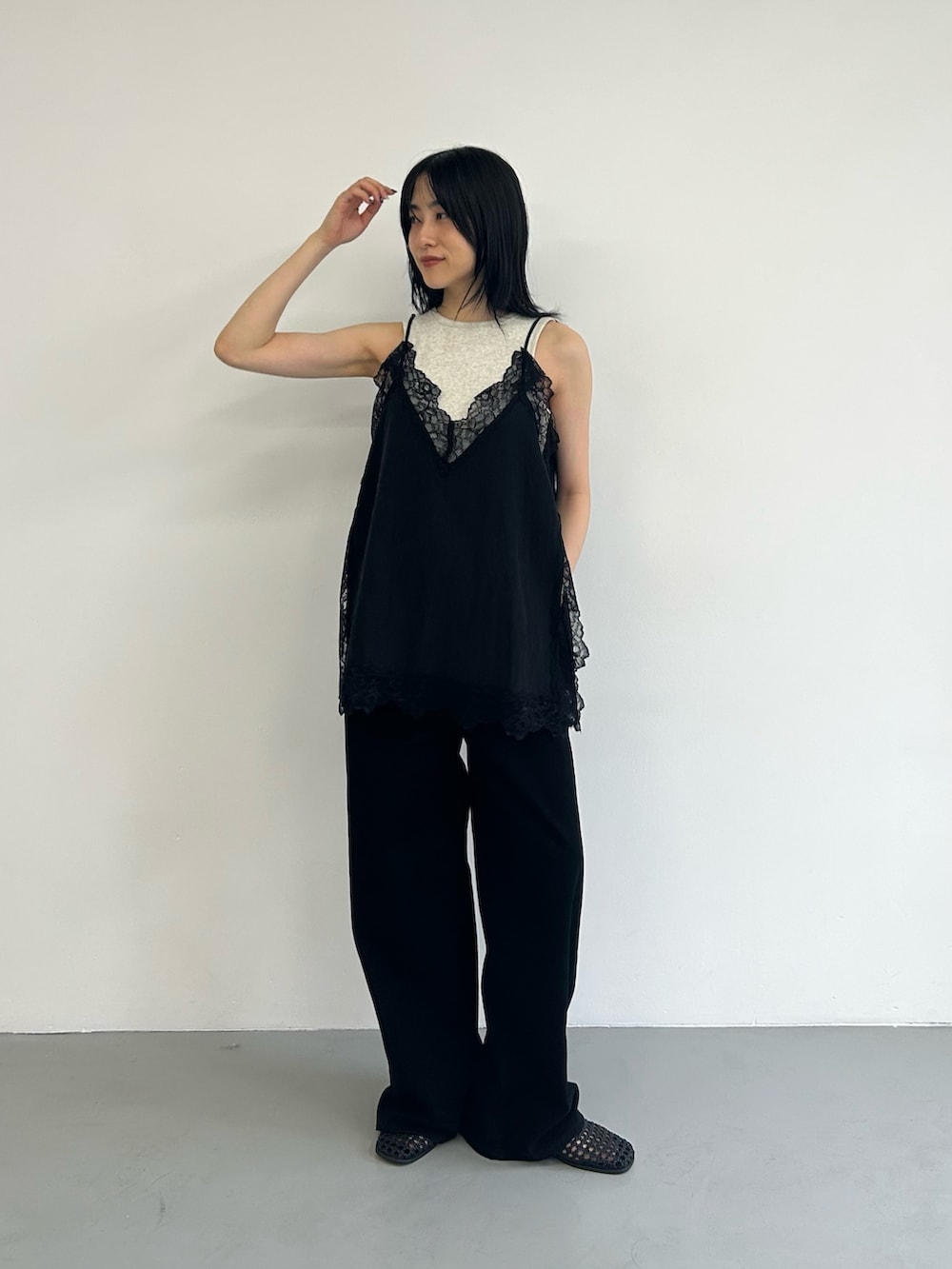 ヴィンテージライクレースキャミソールをメインに、タンクトップとブラックのパンツと合わせて着てみました。