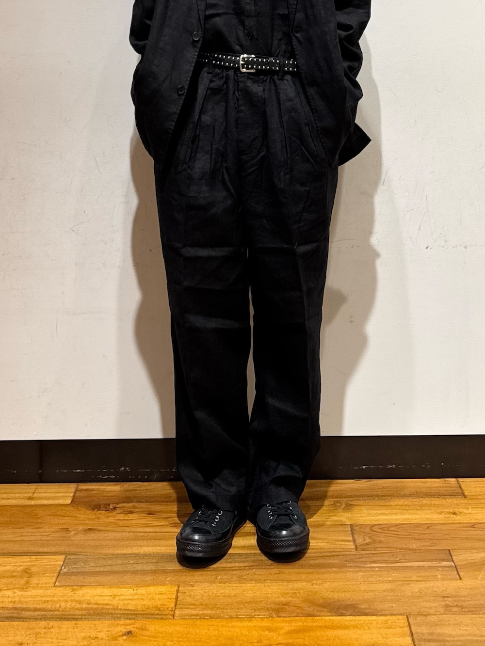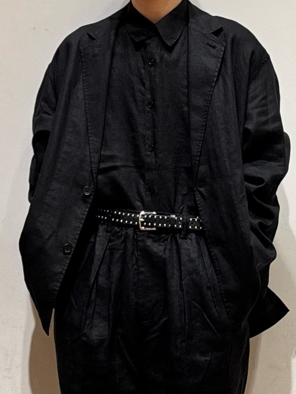 リネン素材のセットアップを着用。