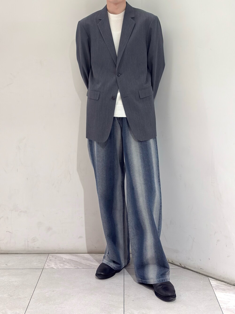 パンツはデニム合わせ、インナーにはニットT。フォーマルなテーラードジャケットには、このぐらいカジュアルな合わせが丁度いい。決めすぎない休日スタイリングって感じですかね。