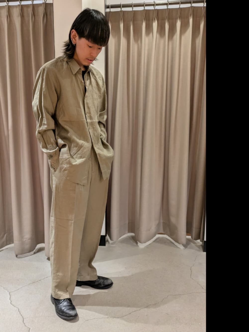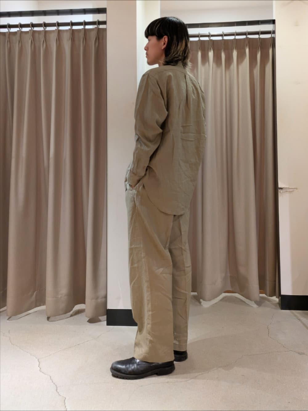 ベージュのリネンシャツとリネンパンツで色も生地感も春らしいコーデを組んでみました!