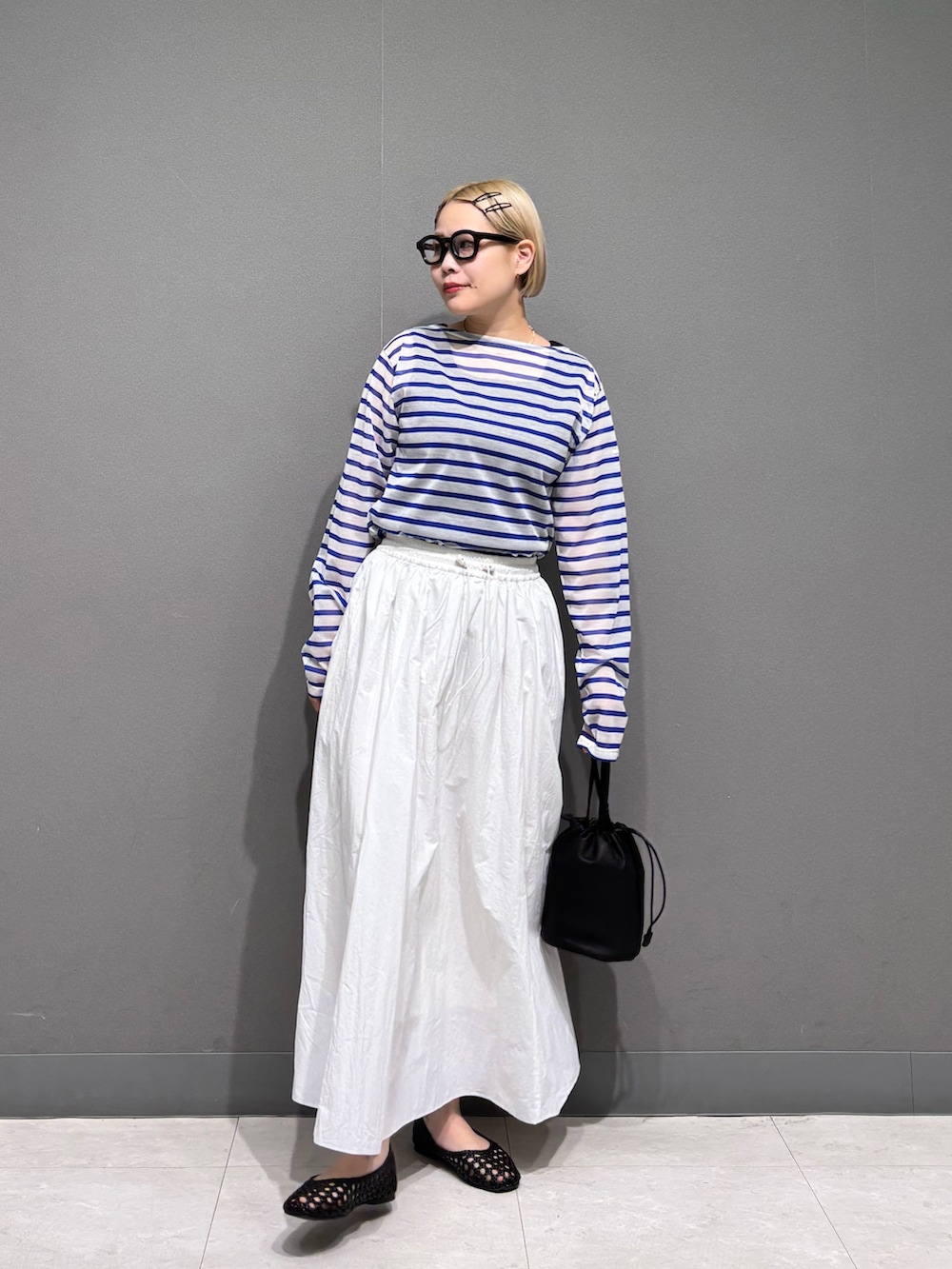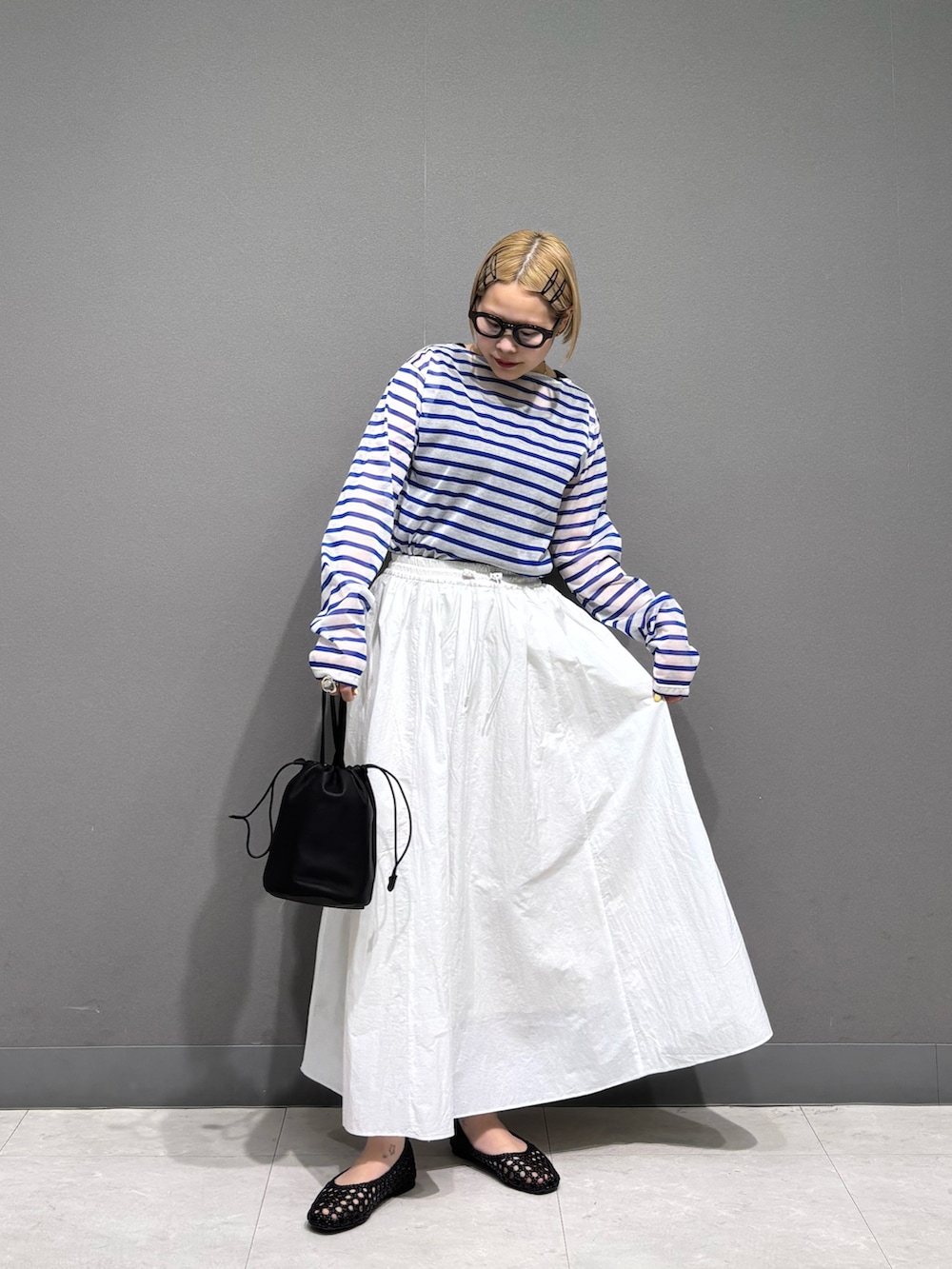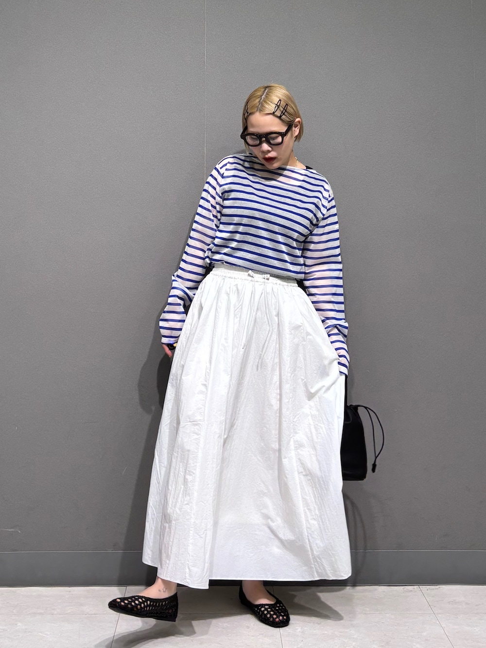 シアーボーダーに白のナイロンスカート、