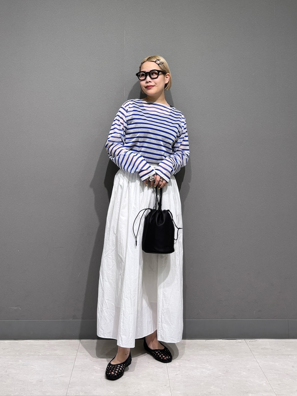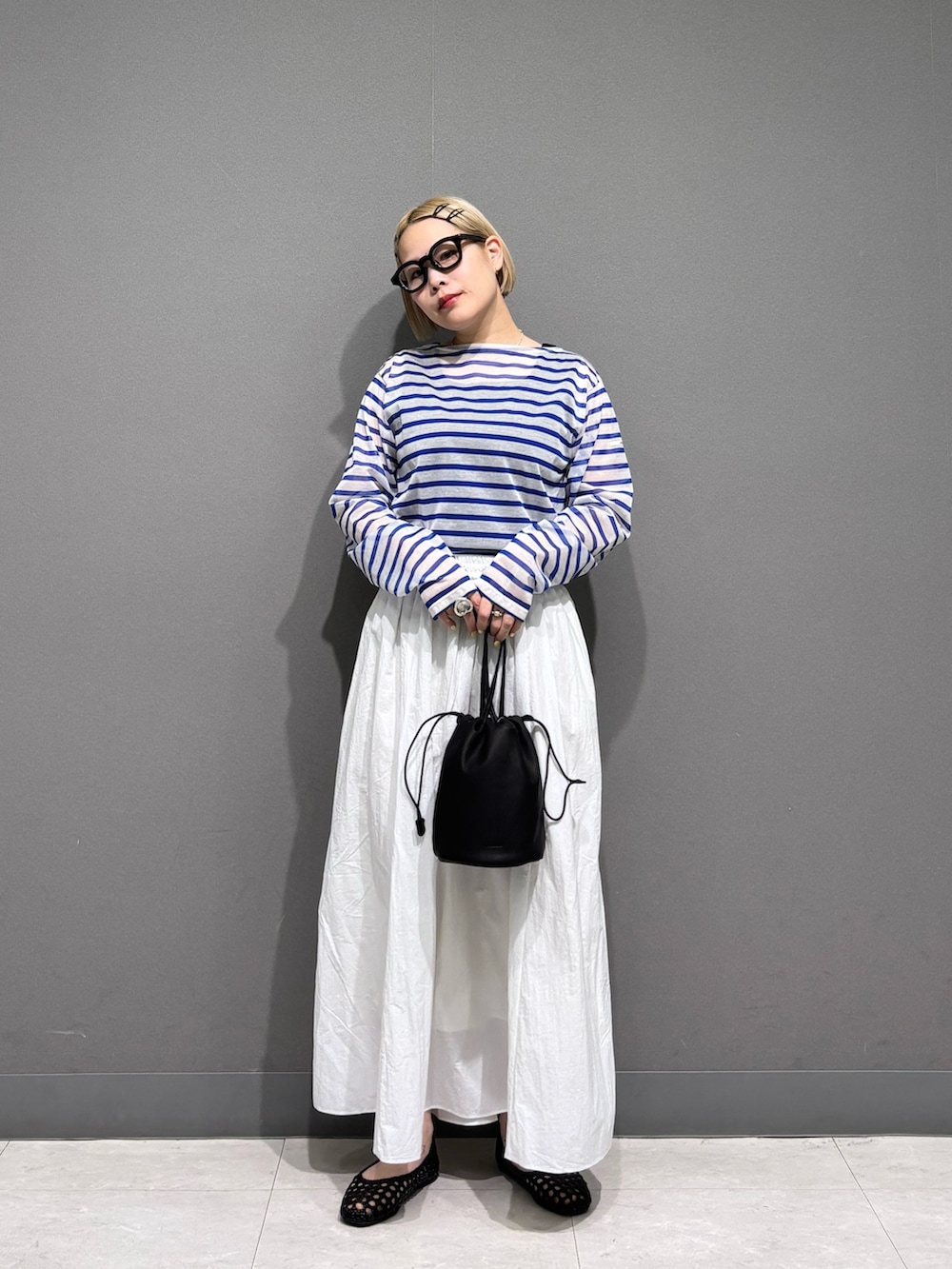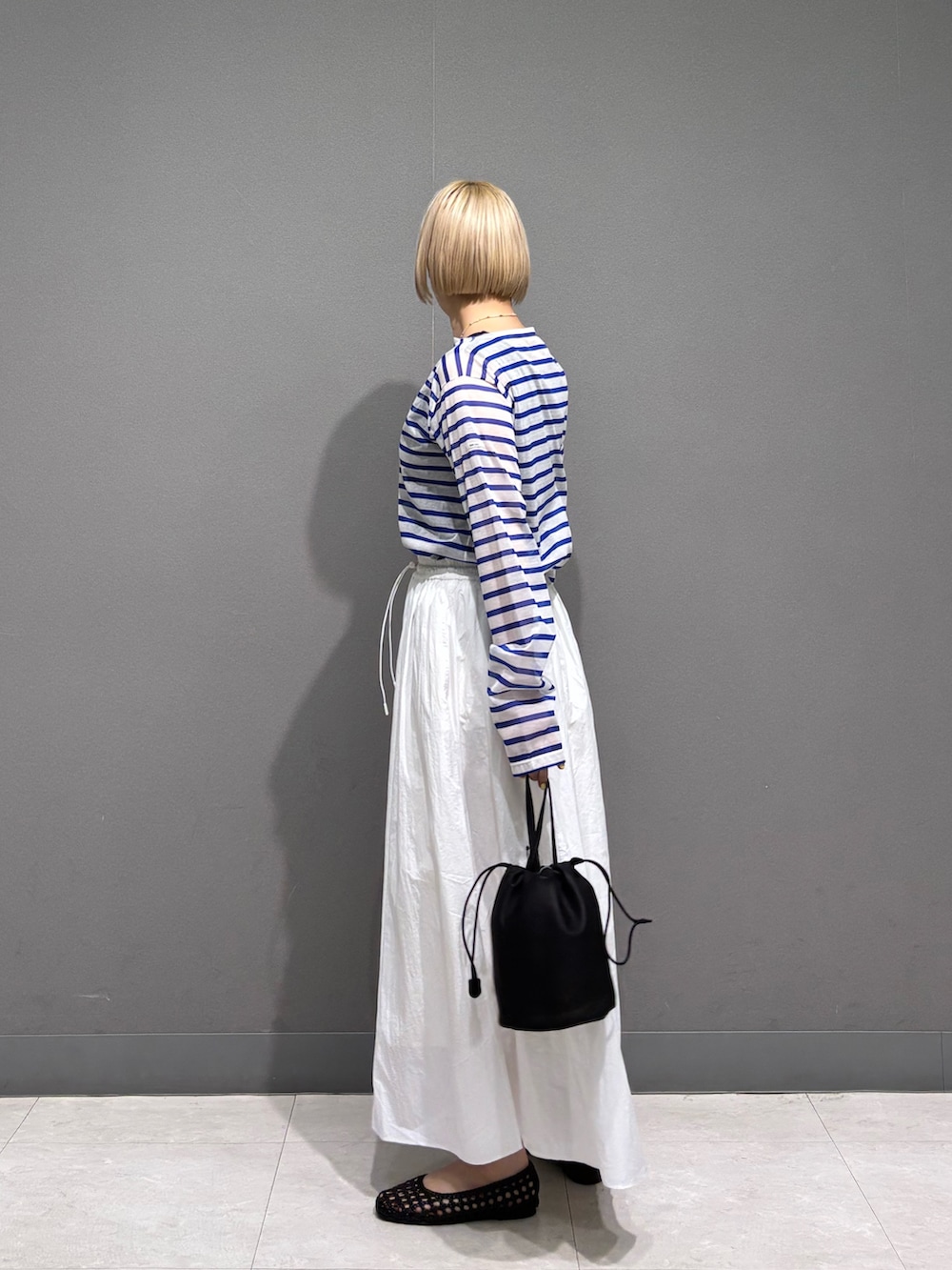 シアーボーダーに白のナイロンスカート、