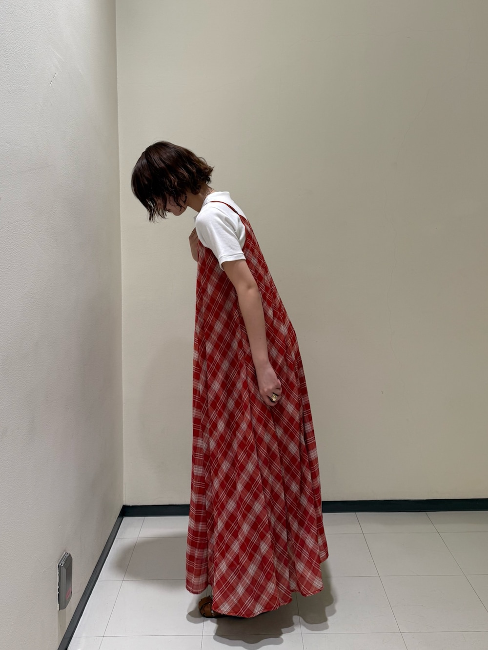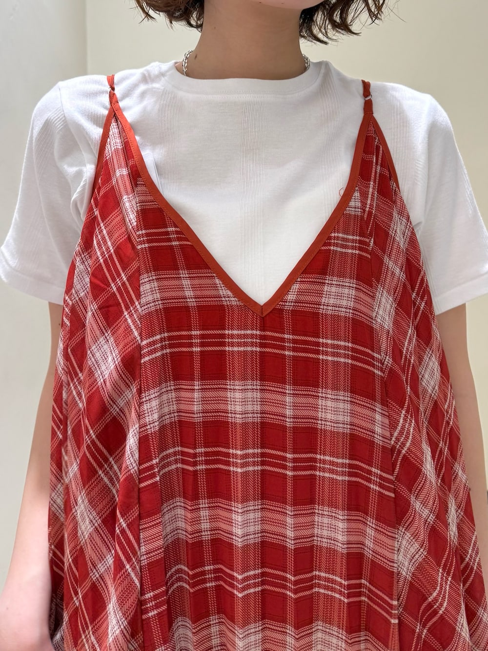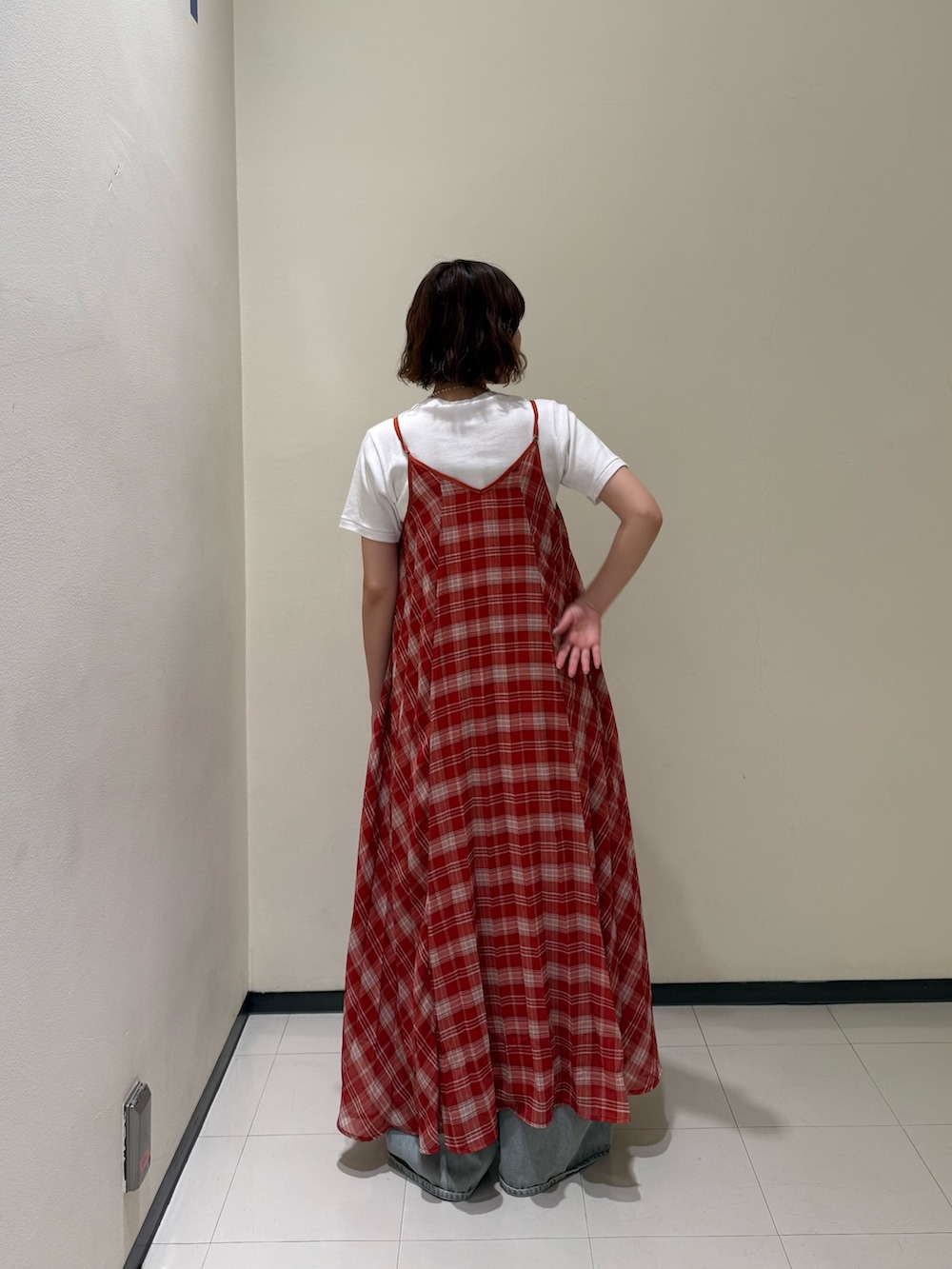 赤が夏を感じさせるチェックキャミワンピースを主役に、カジュアルレイヤードコーデを組んでみました✨