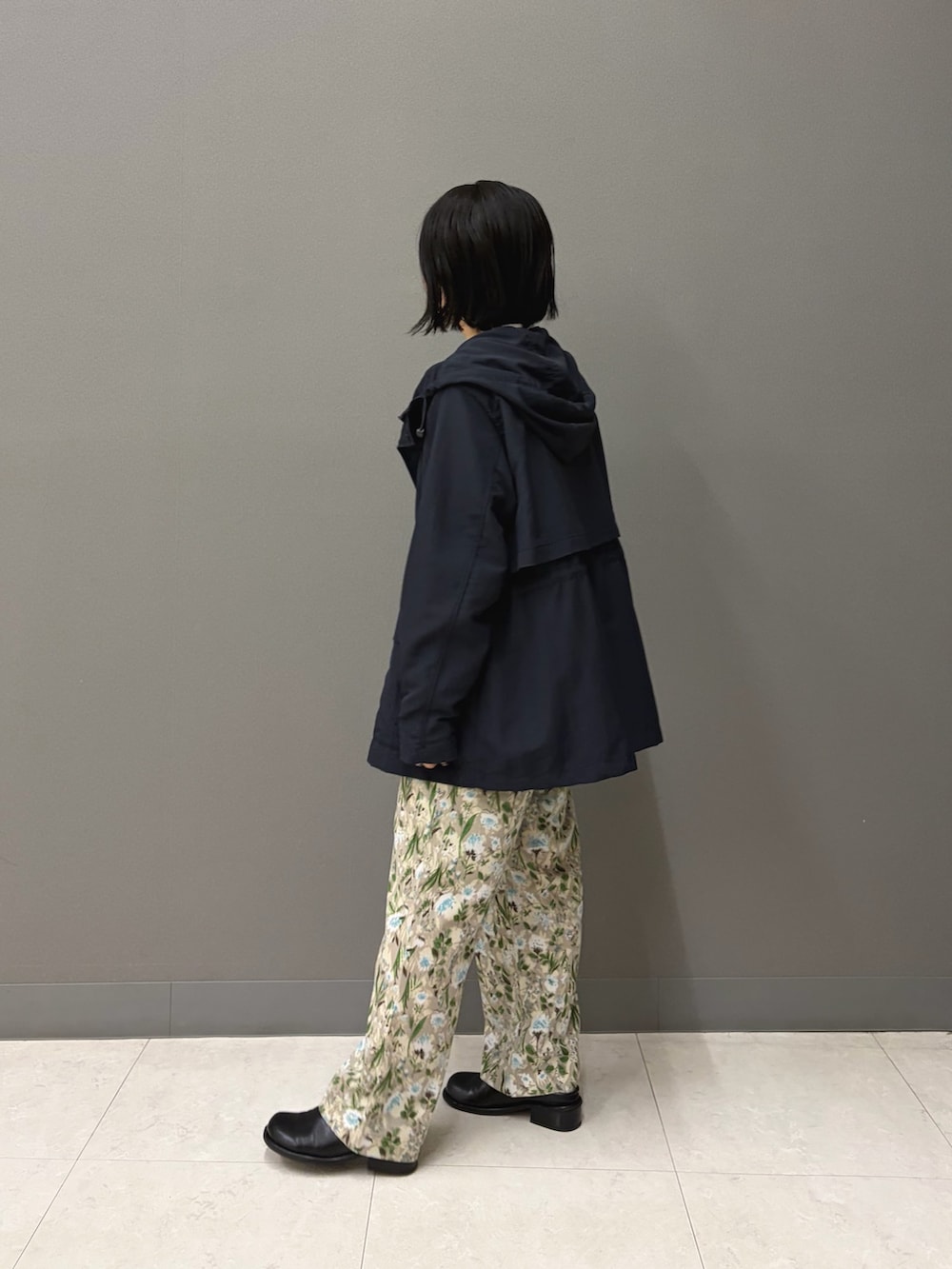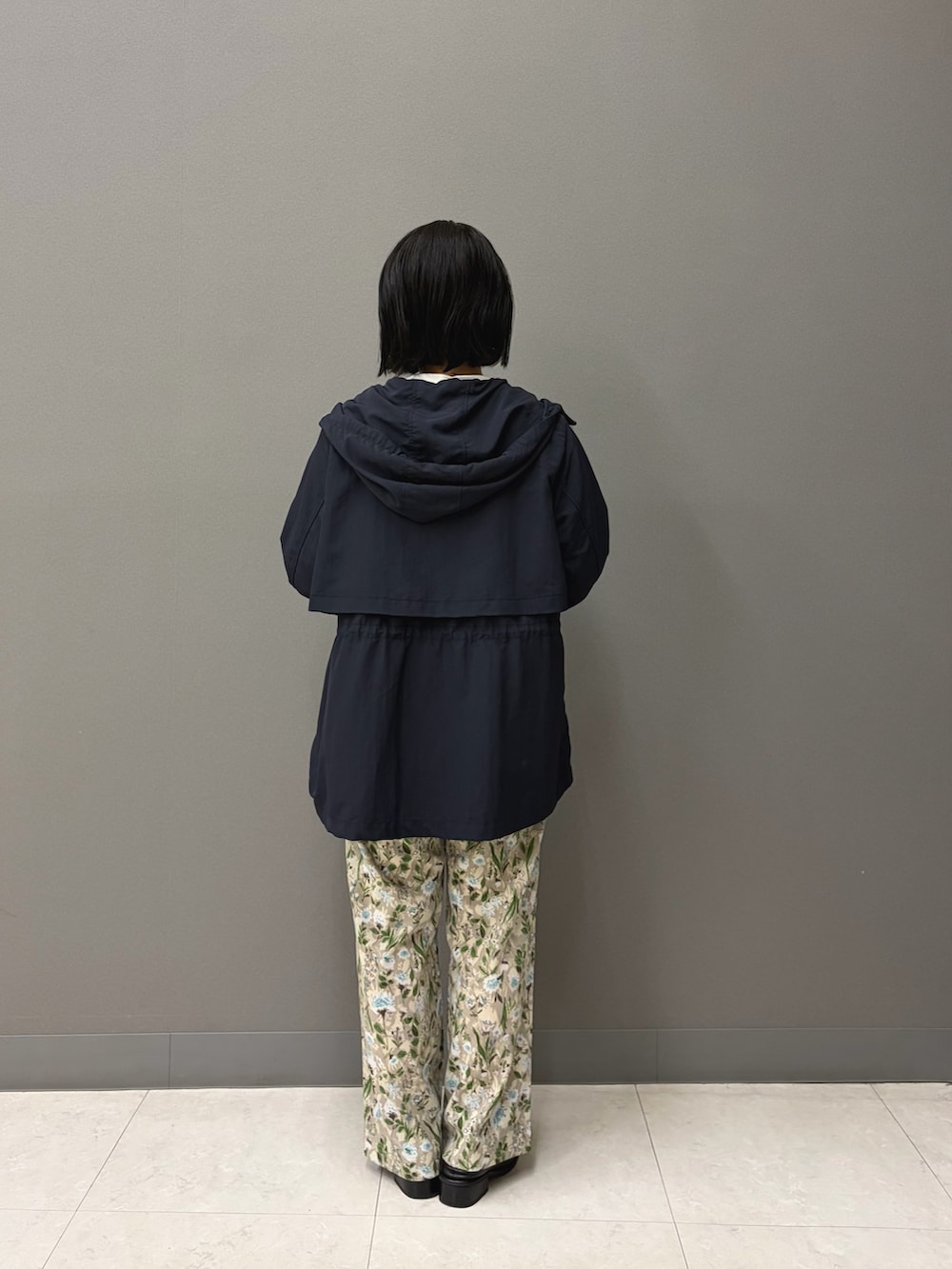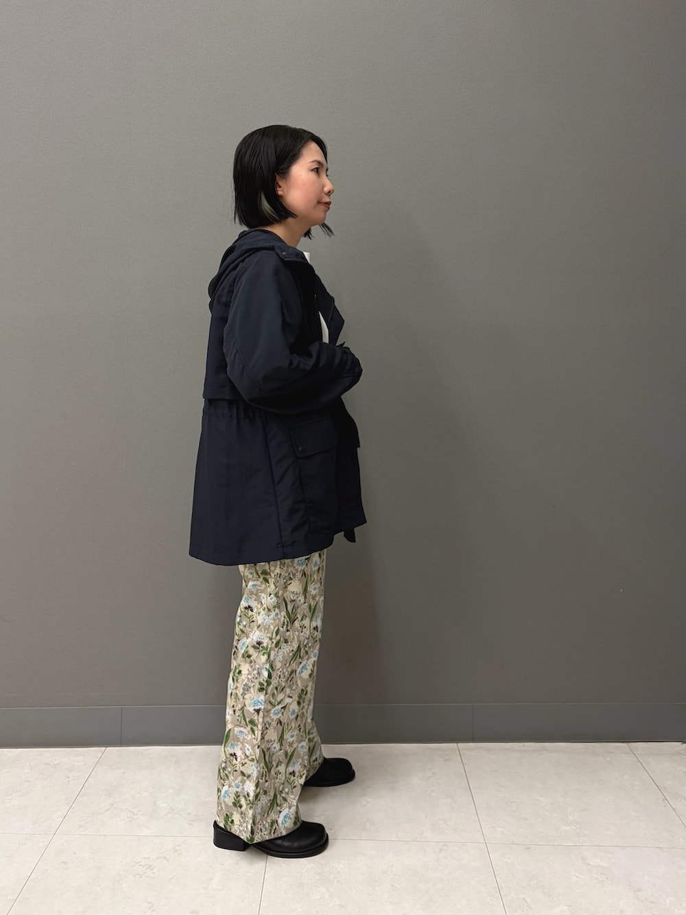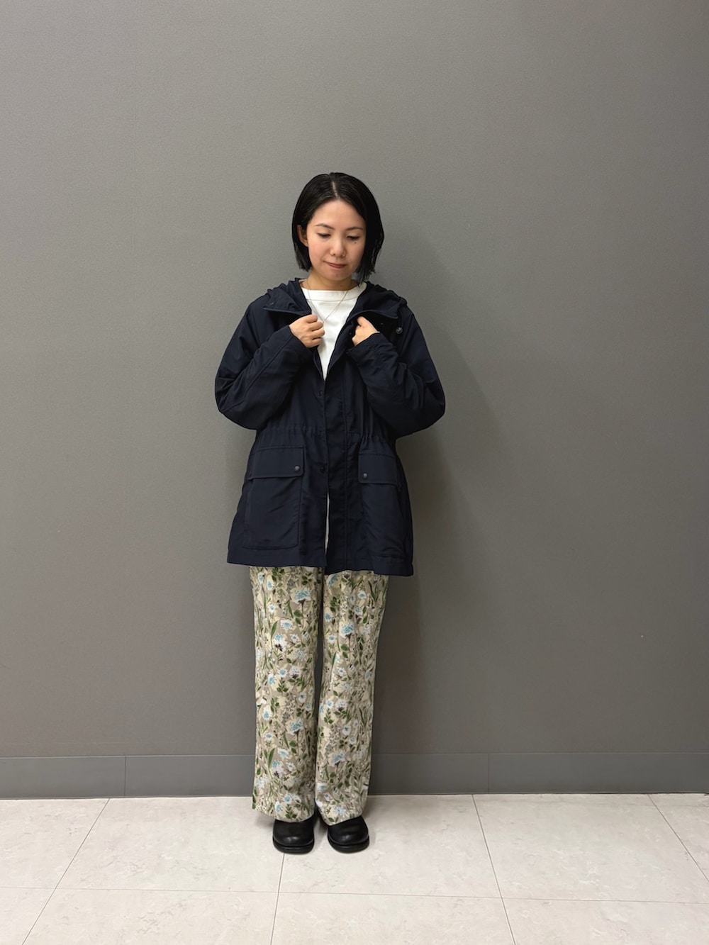 アウターは落ち着いたトーンが好みの方も、中トップスを白、ボトムスに柄ものを持ってくれば春の陽気を感じられます。