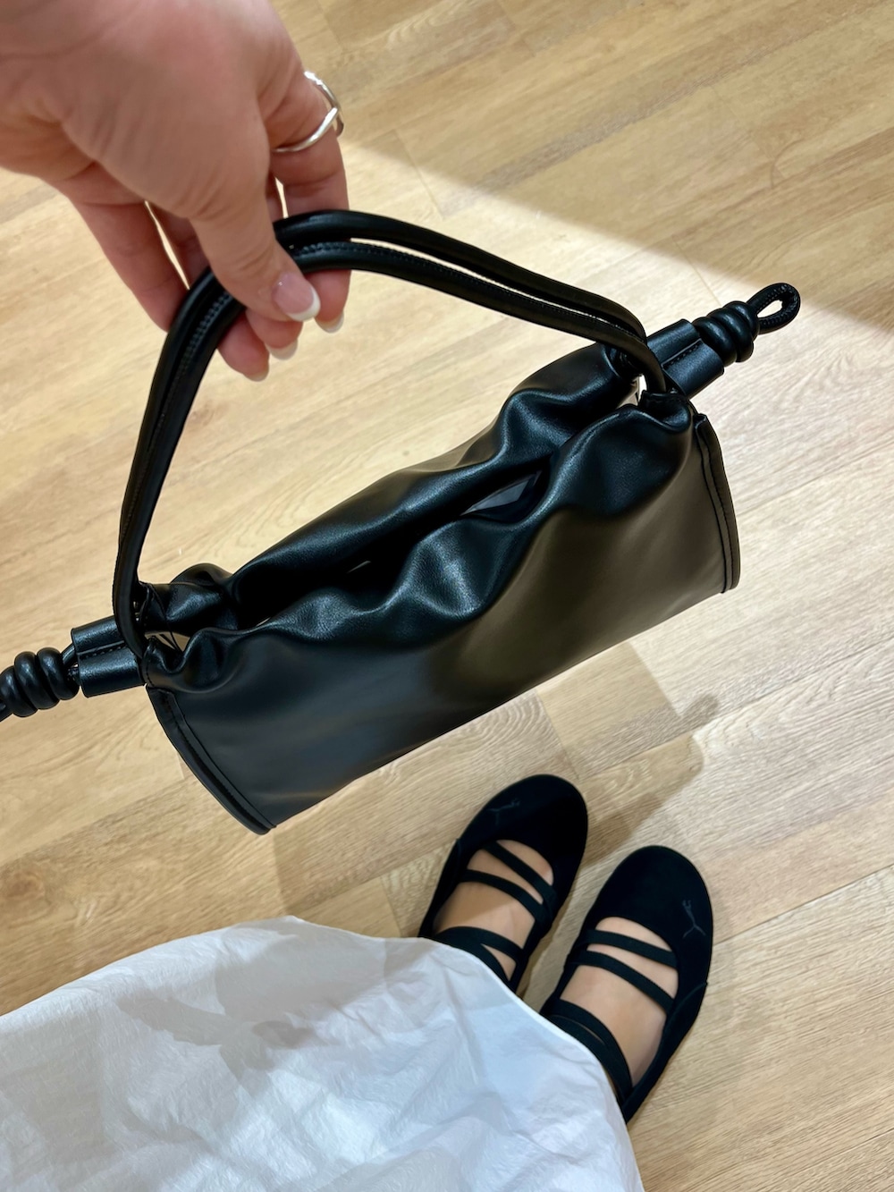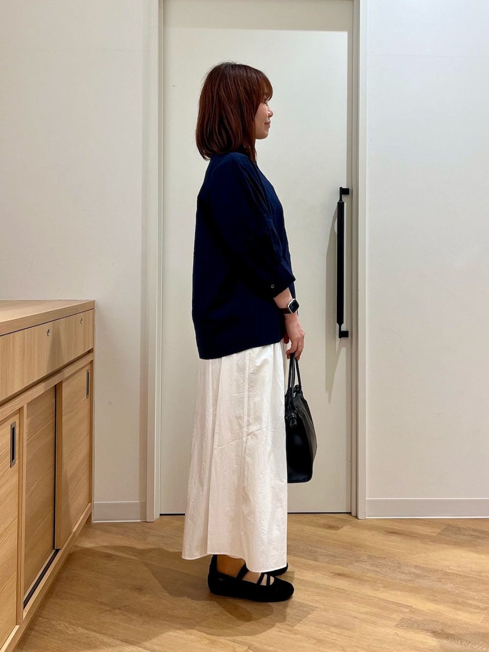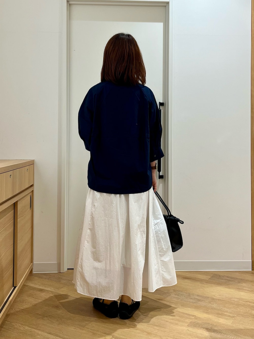 小さめの襟のブラウスとボリュームのあるスカートに別注スニーカーできれいめカジュアルにまとめました✨
