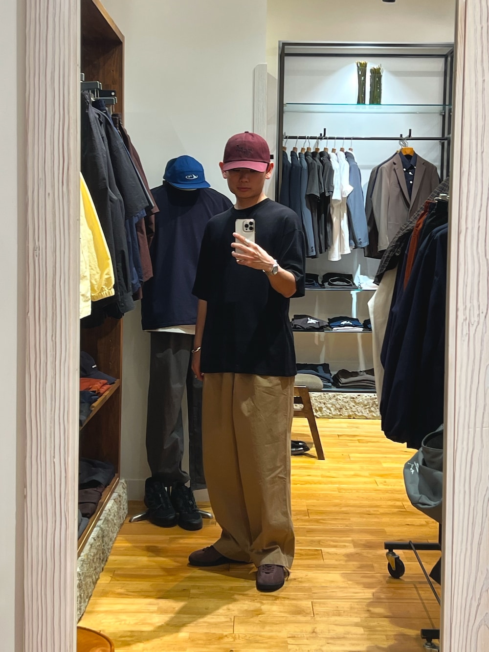 全体的に色味に野暮ったさがあるので、キャップとスニーカーでバランスを取っています。