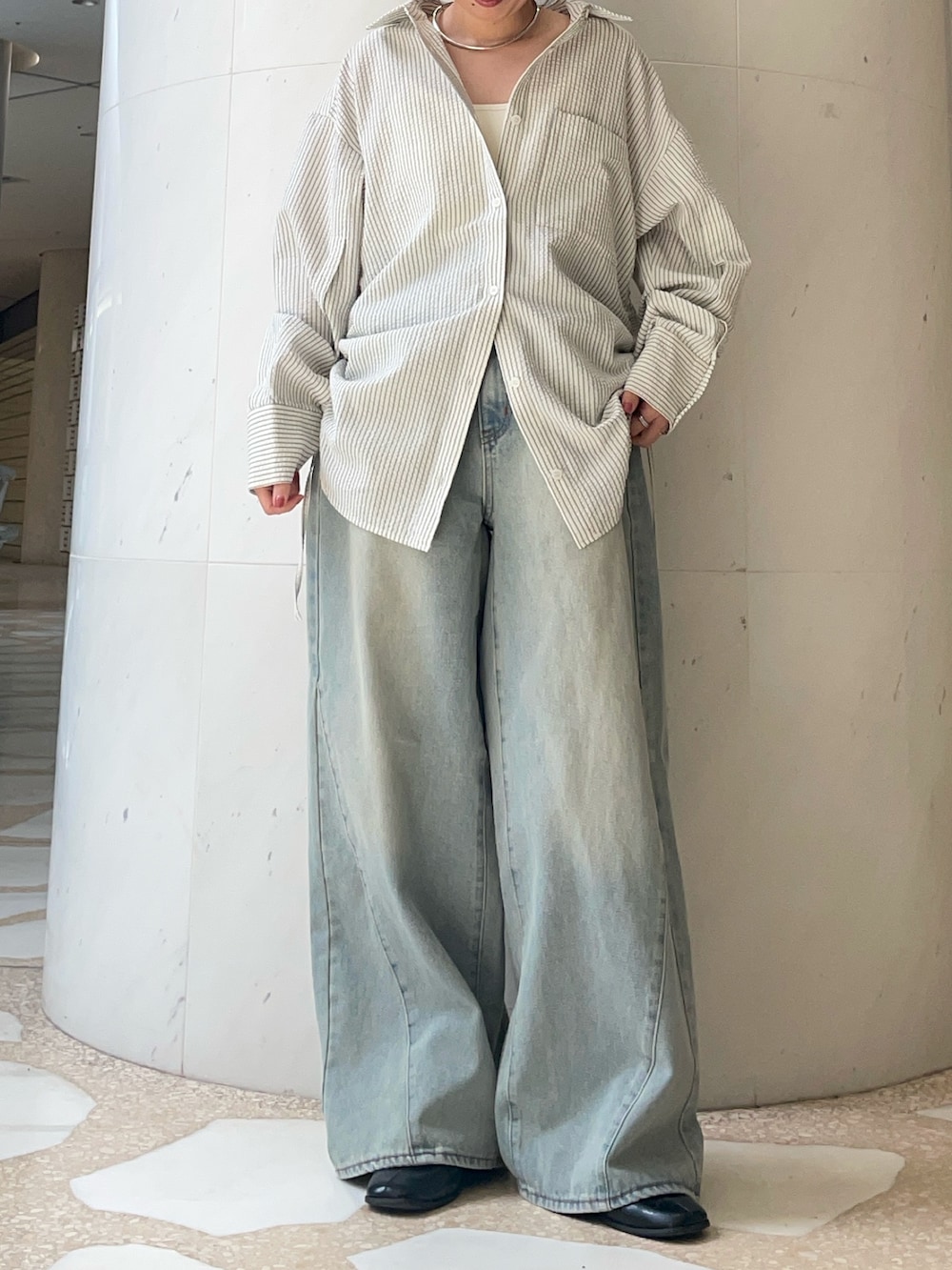 シャツはボタンを開けて緩く着ると抜け感がでるのでおすすめです◎