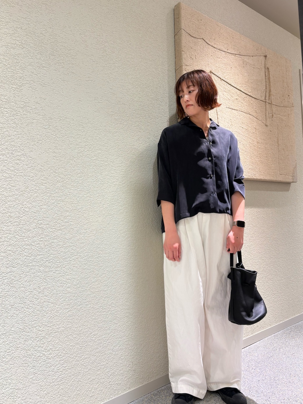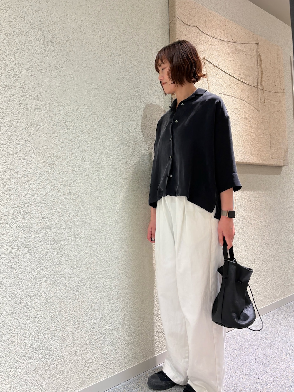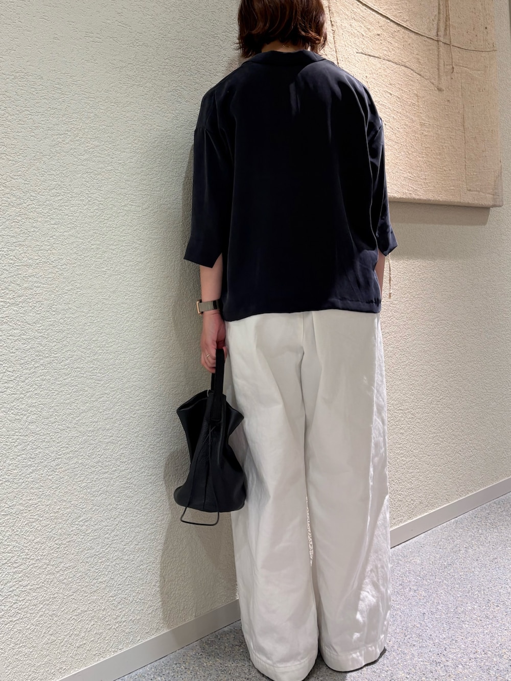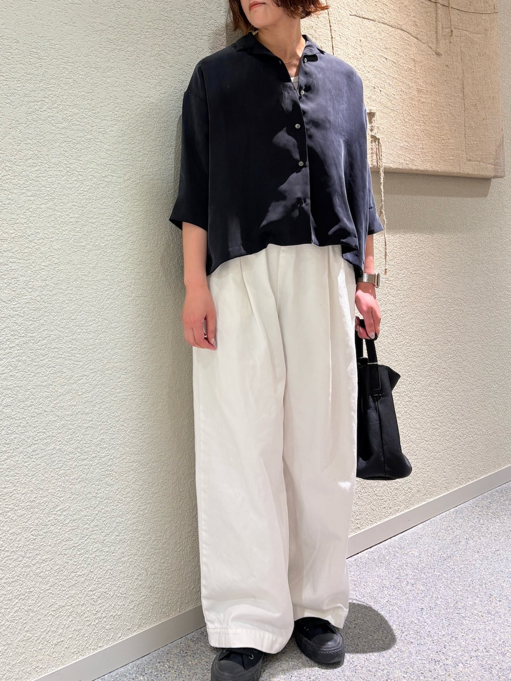 トップスのキュプラオープンカラーシャツはバランスの取りやすい丈感で、ワイドパンツにも◎