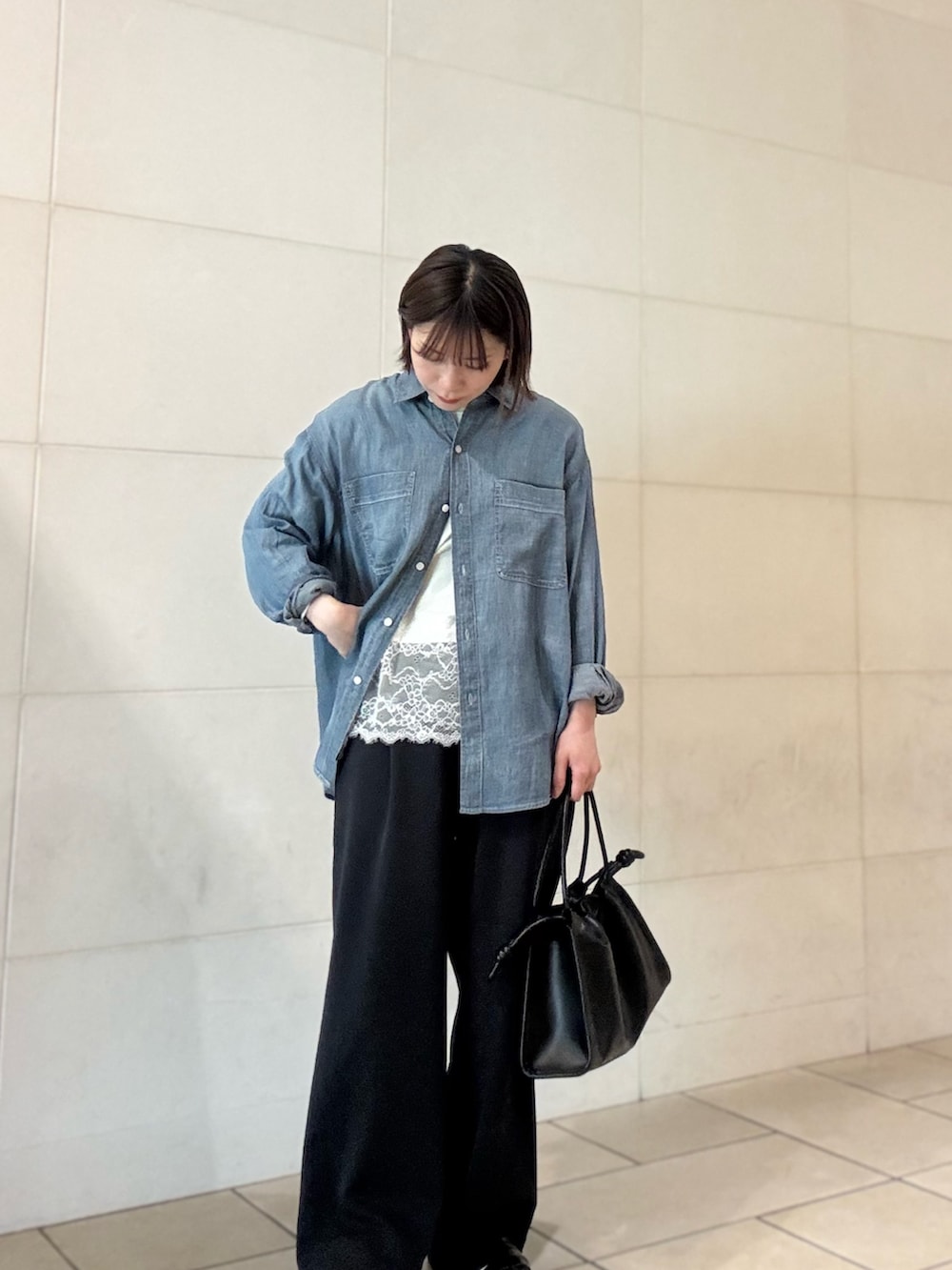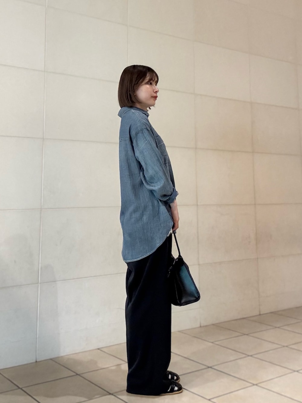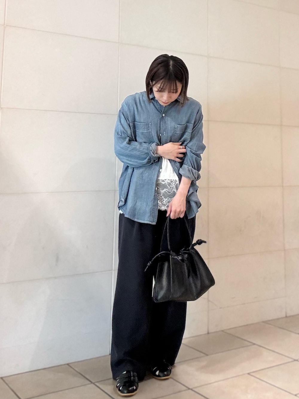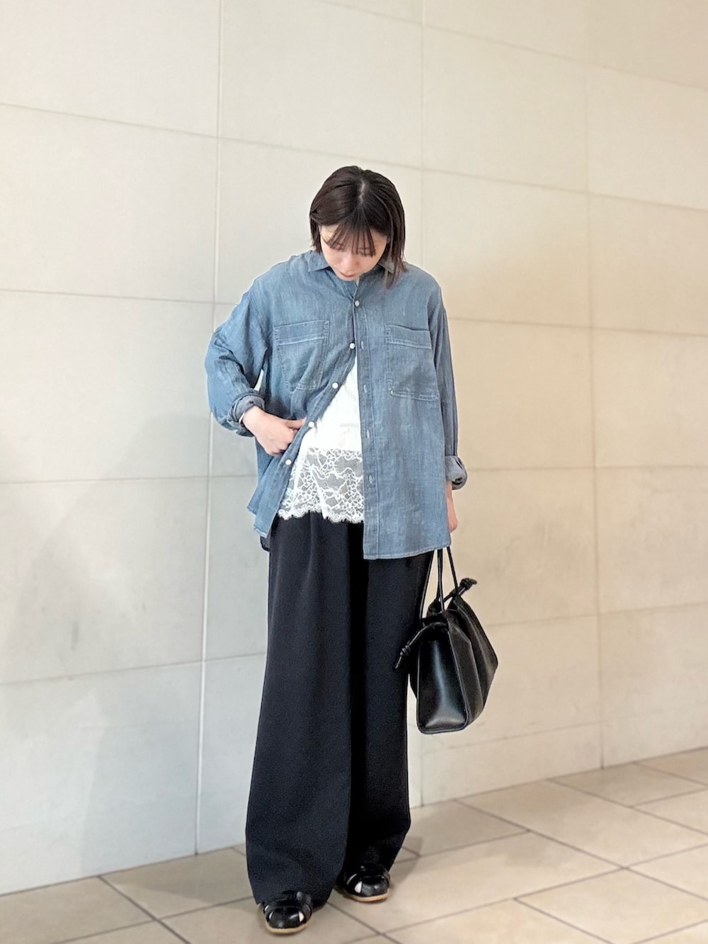 デニムシャツはカジュアルなイメージが強いですが、シアー素材なので女性らしく上品に着こなせます◎