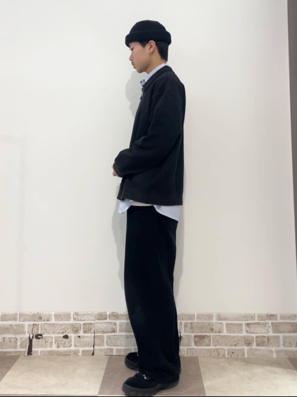ハーフジップのスウェットにシャツをレイヤードしたコーディネートになります!