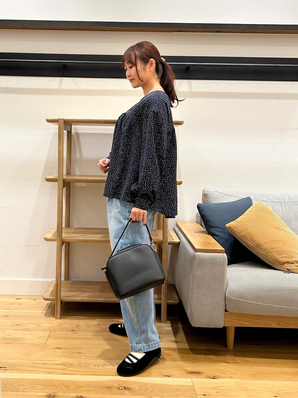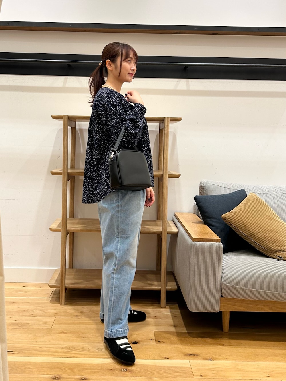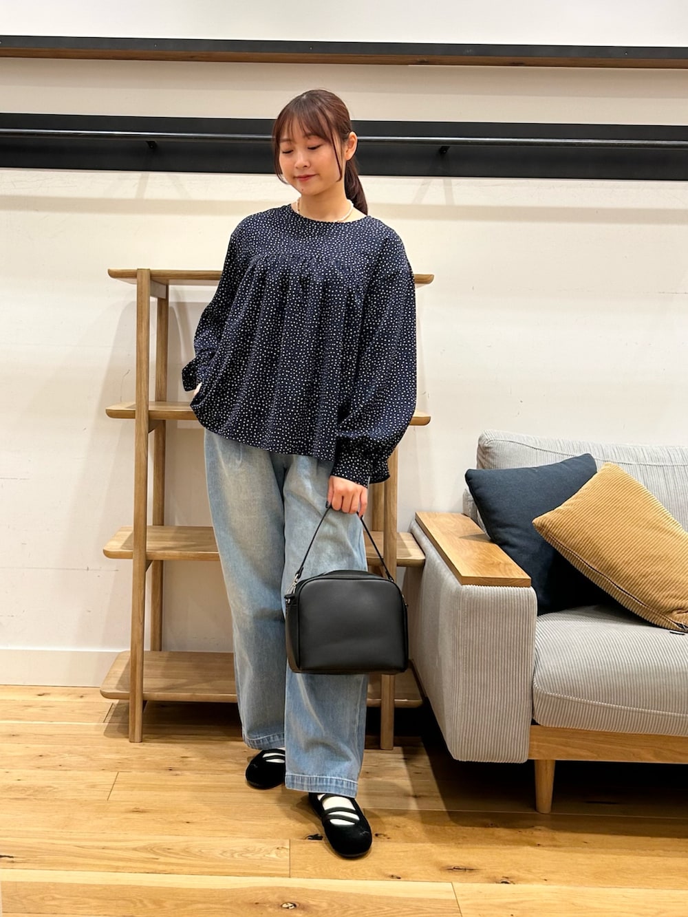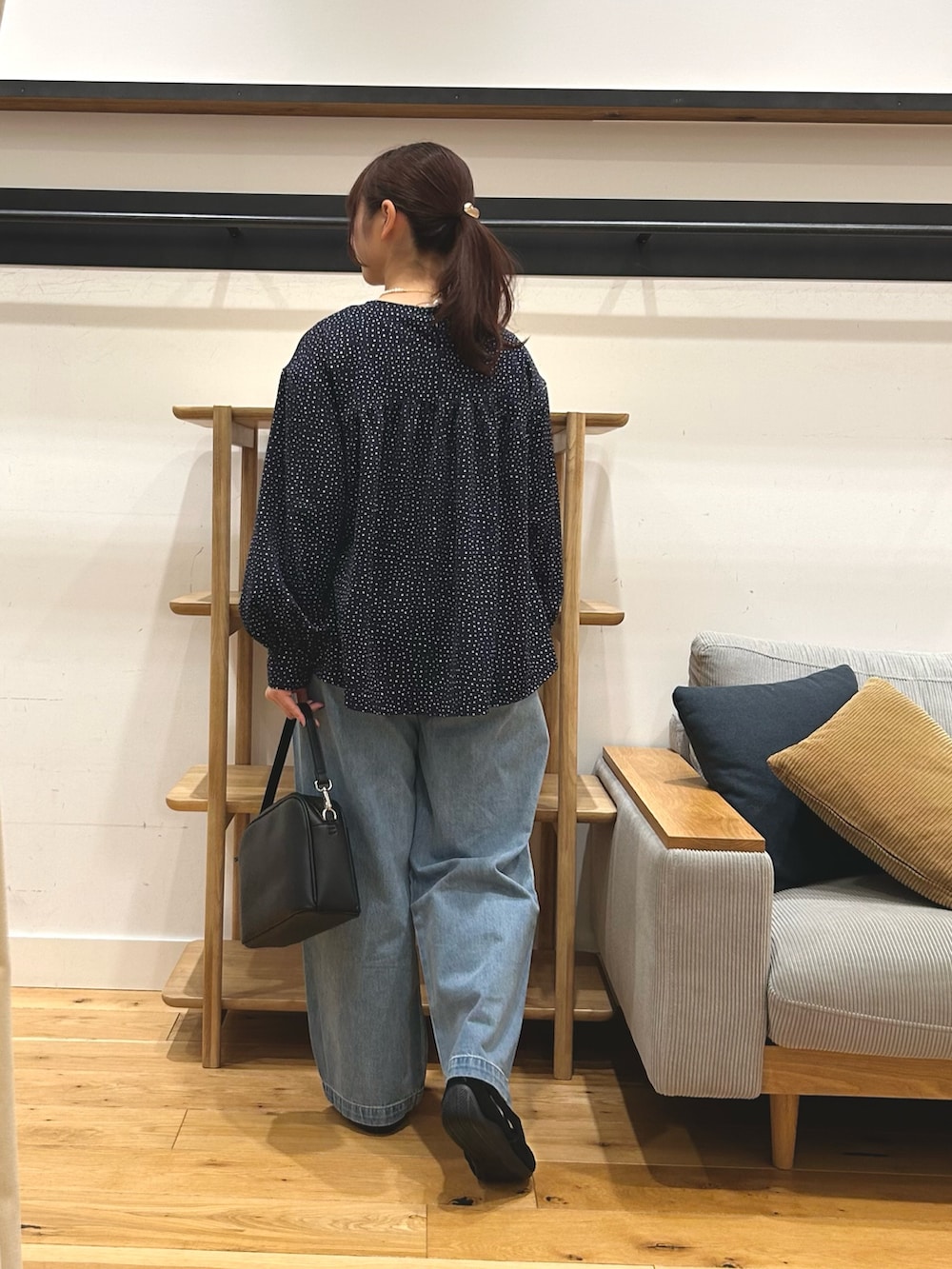 ゆったりシルエットなのでキレイめだけでなくカジュアルにも使いやすいブラウスです。不揃いなドット模様が大人かわいくドットを取り入れやすくしてくれて、コーデに甘さをプラスできます。
