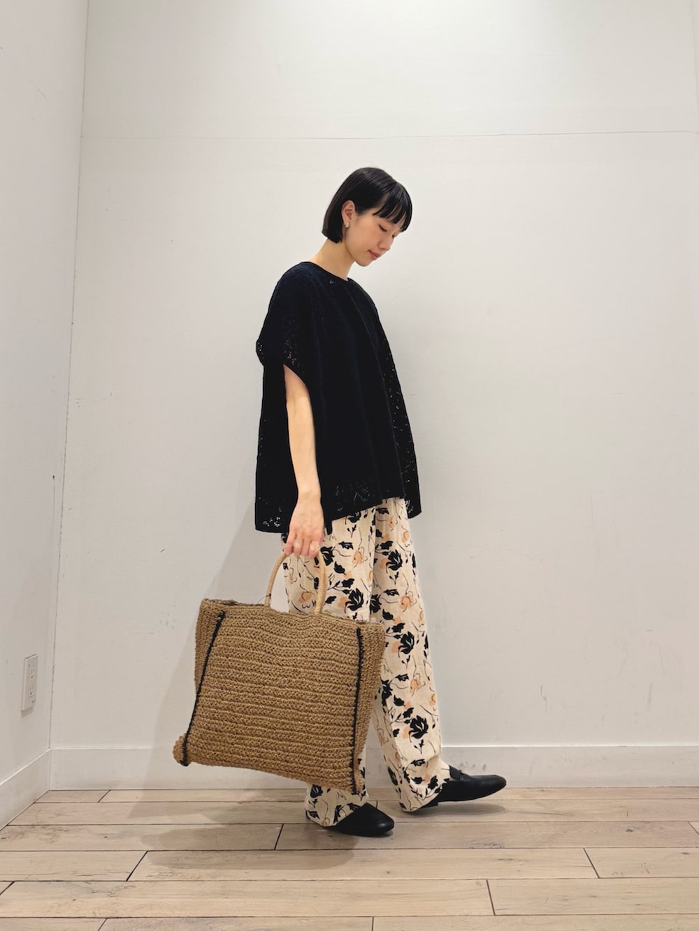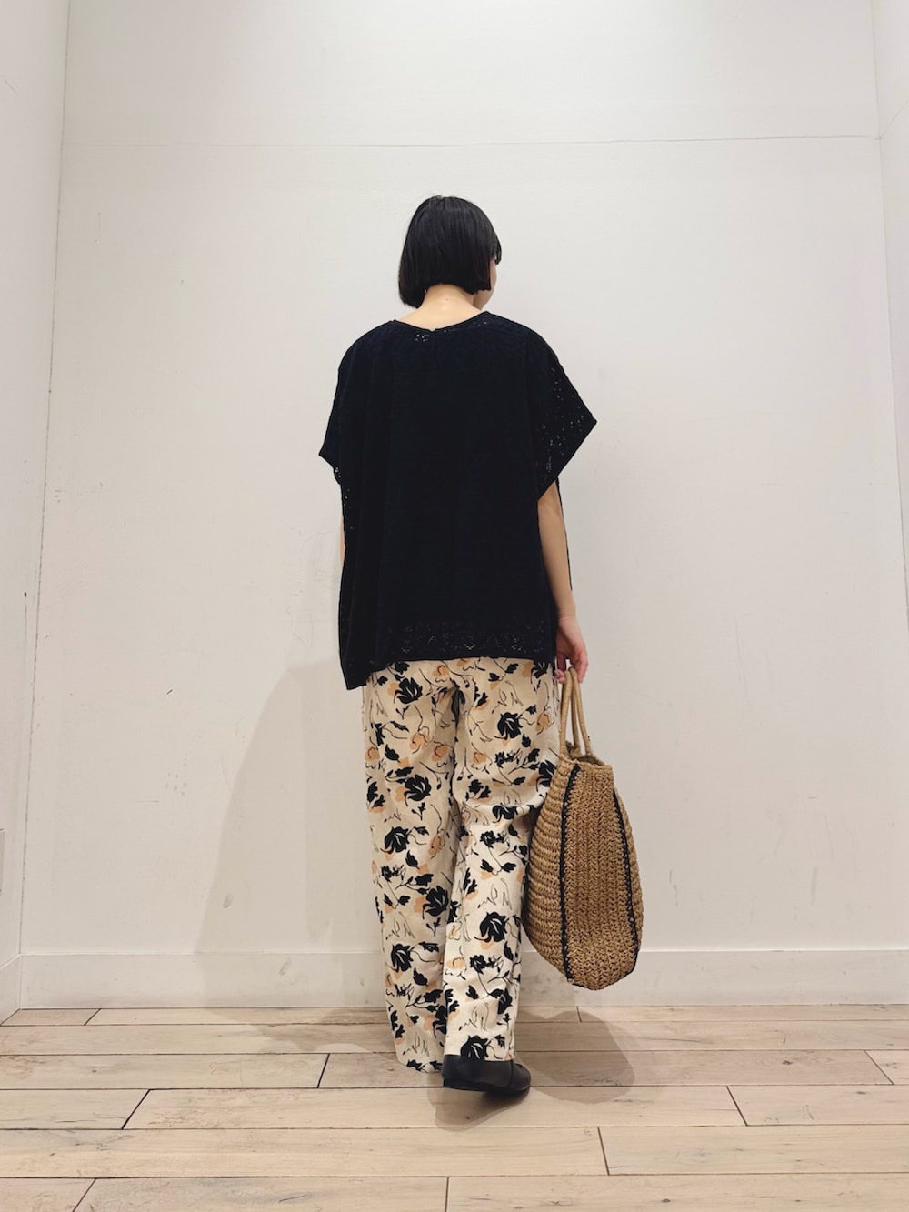 シックな花柄リネンパンツ、モノトーン調で派手さはないながらもコーデの主役になってくれます◎