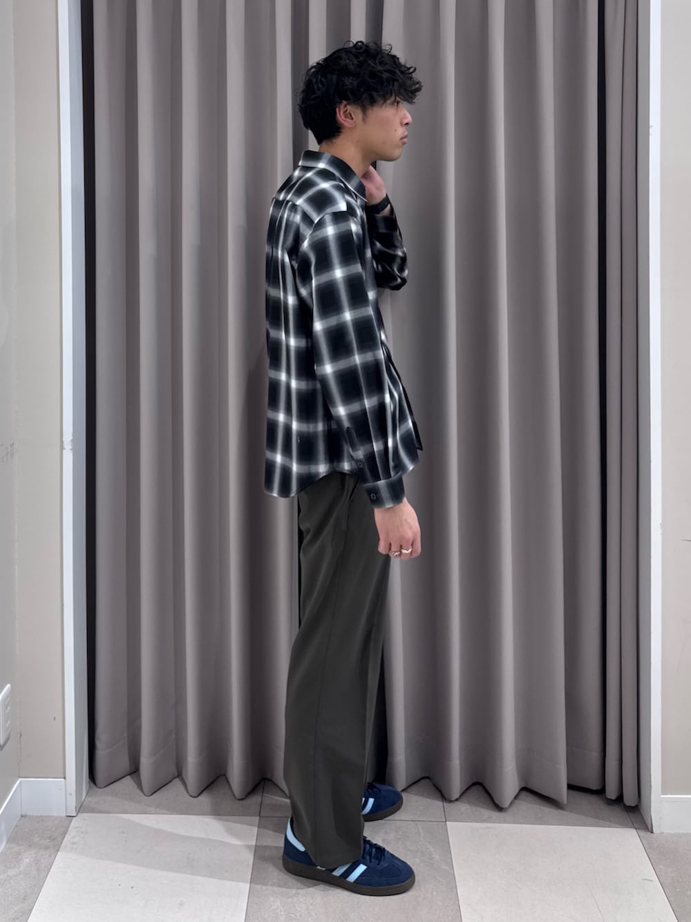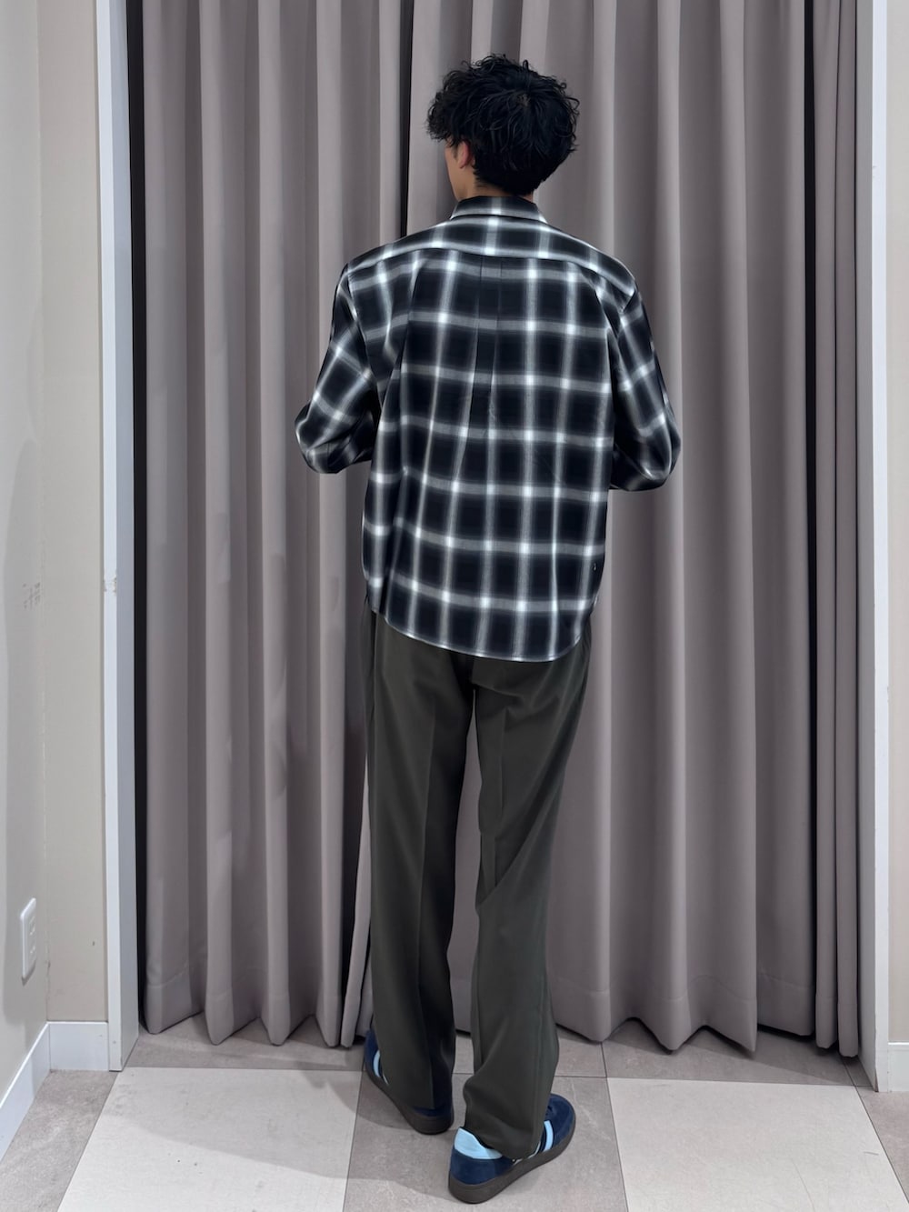 パンツはヨウリュウ生地のスラックス。シワ感が肌触りよく、通気性◎。