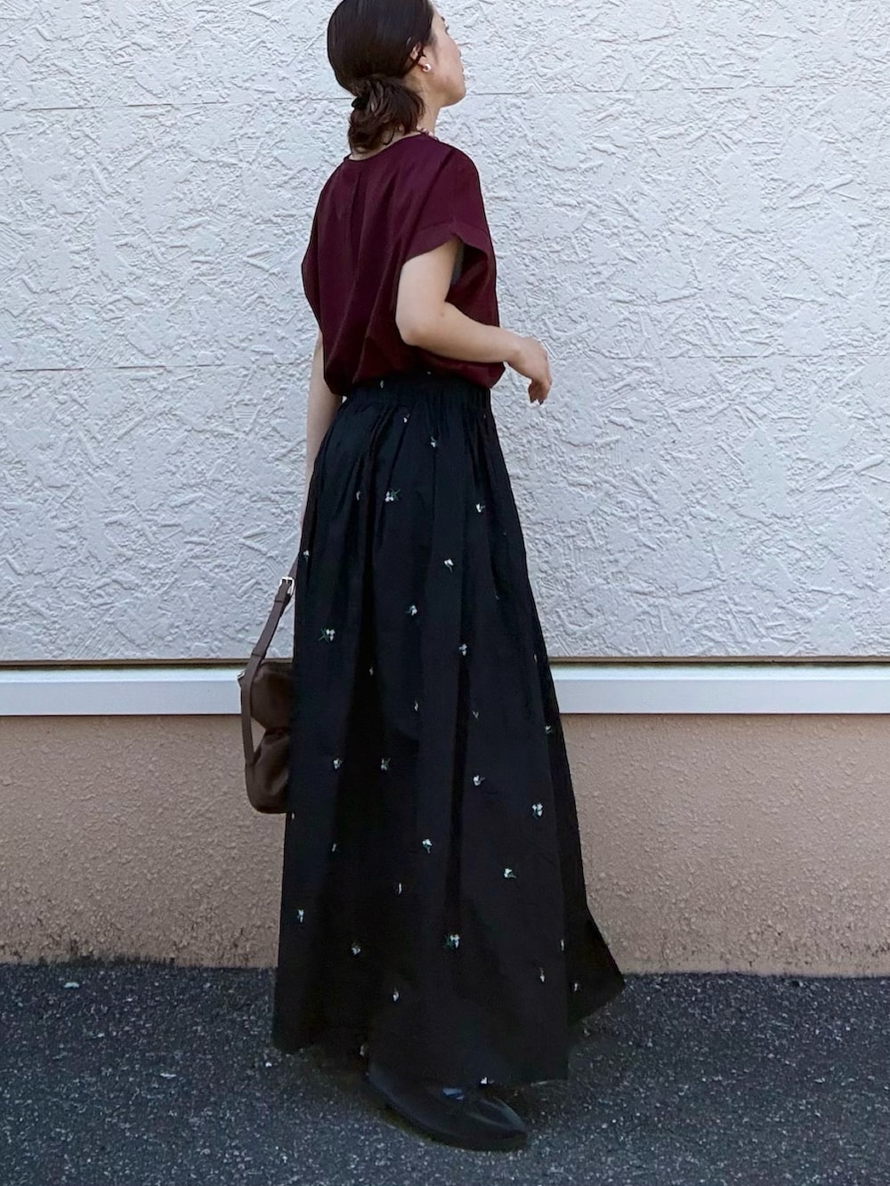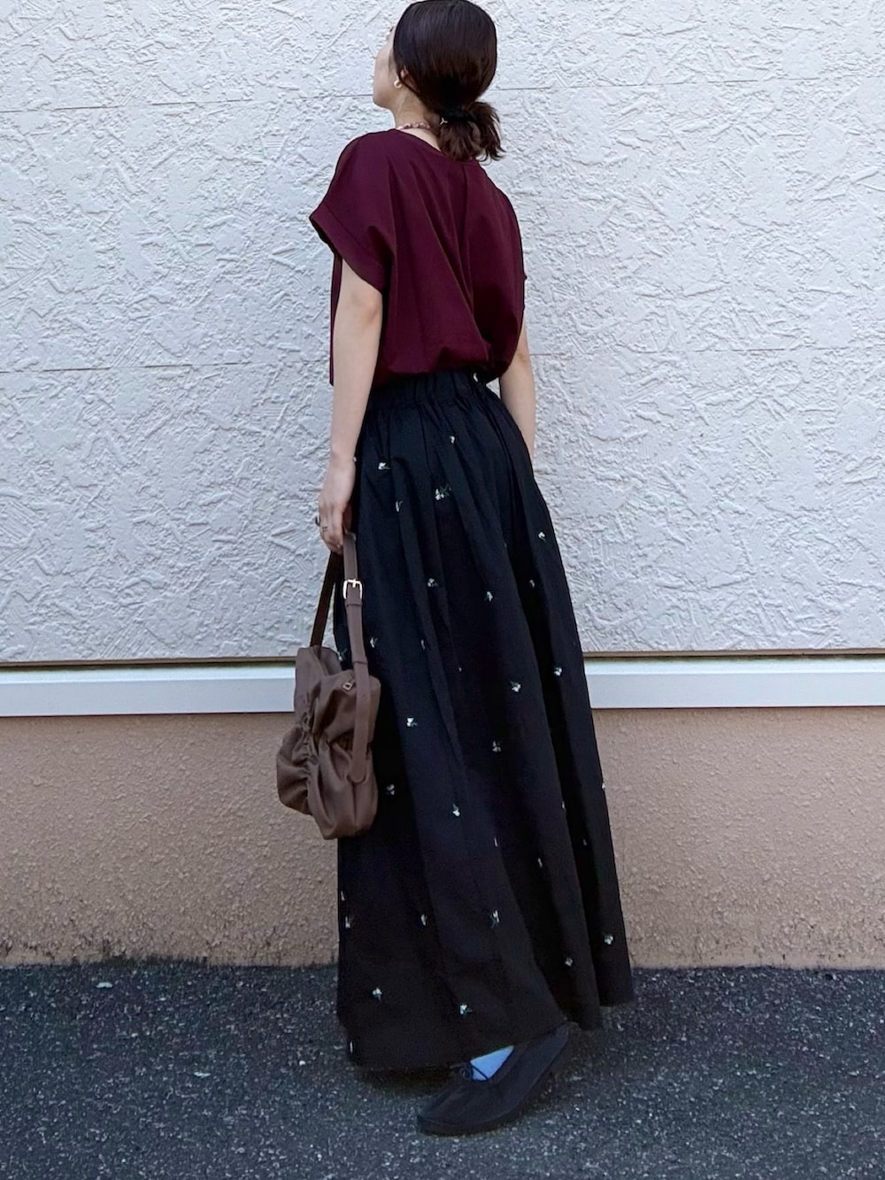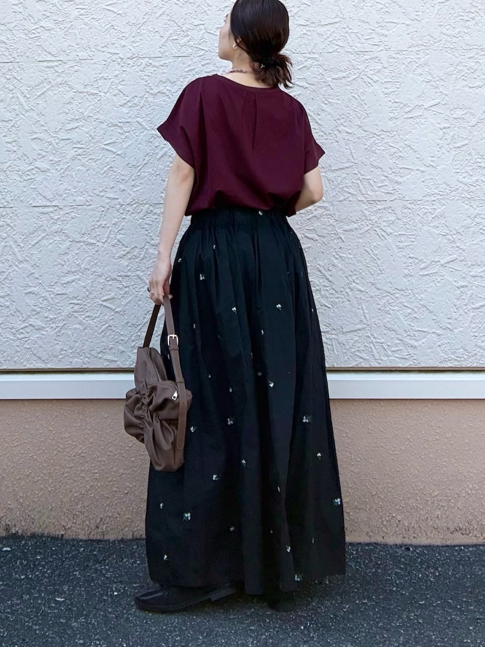 スカートには花の刺繍があしらわれ、華やかさと普段使いの両立に◎