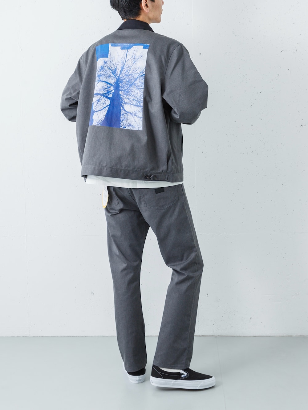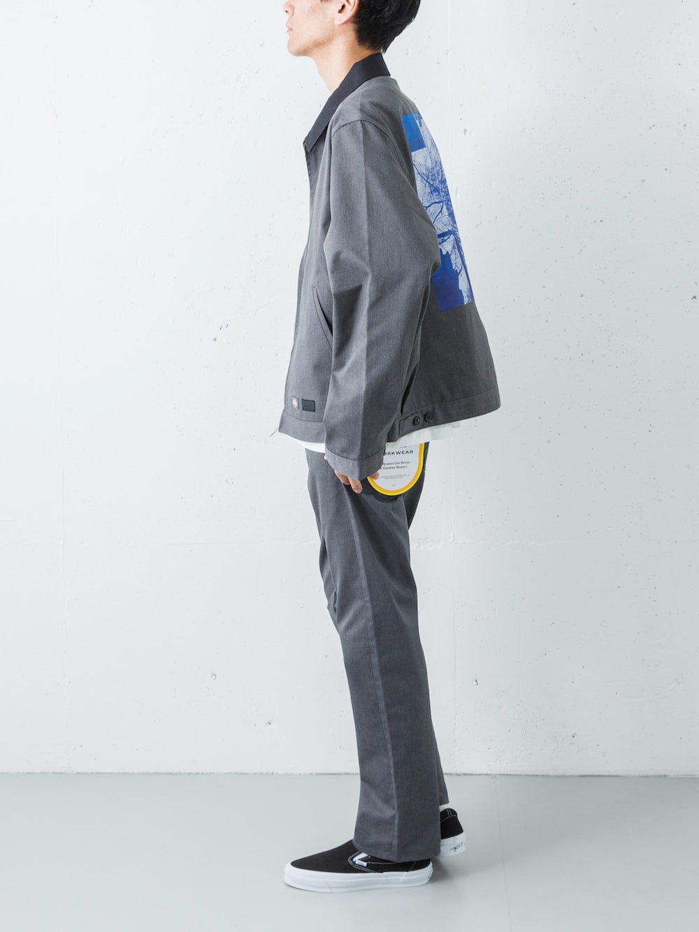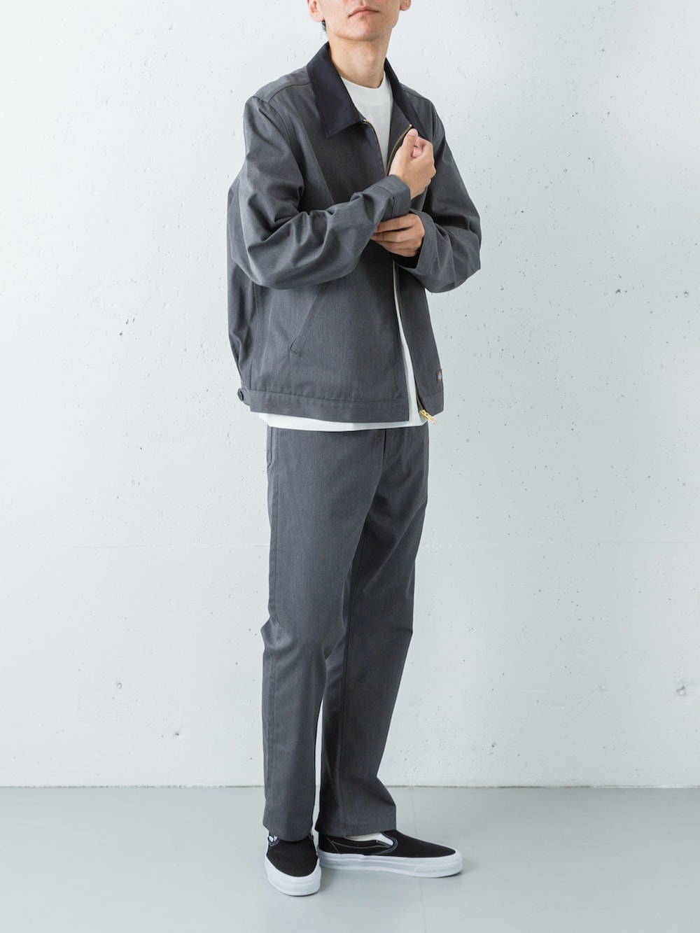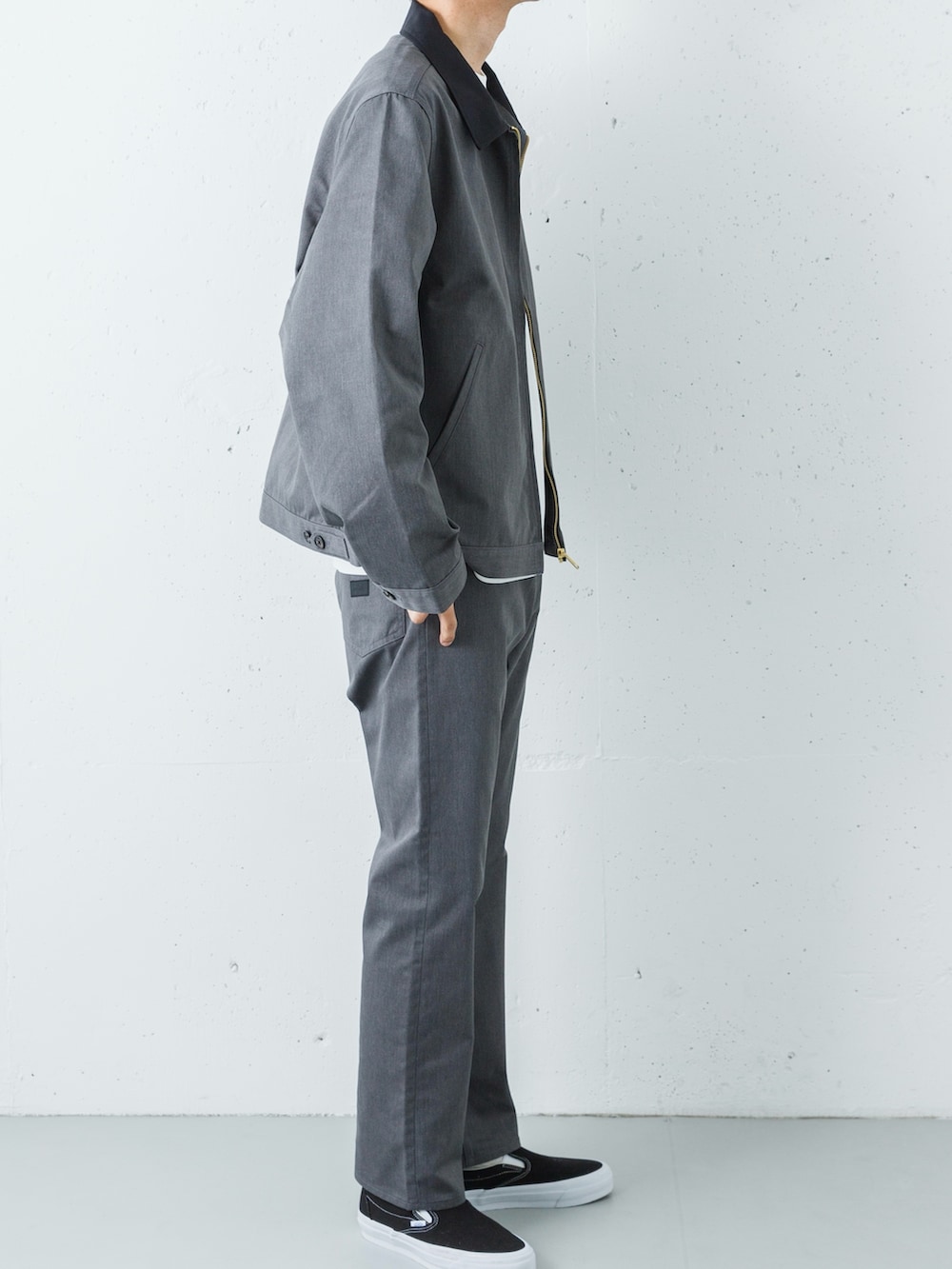 足元には、VANSのプレミアムラインからブラックのスリッポンを投入。キャンバスやスエードの質感が、端正なセットアップスタイルに程よい「ストリートの体温」を吹き込み、気負わないけれど品格を失わない、大人のデイリースタイルを完成させます。