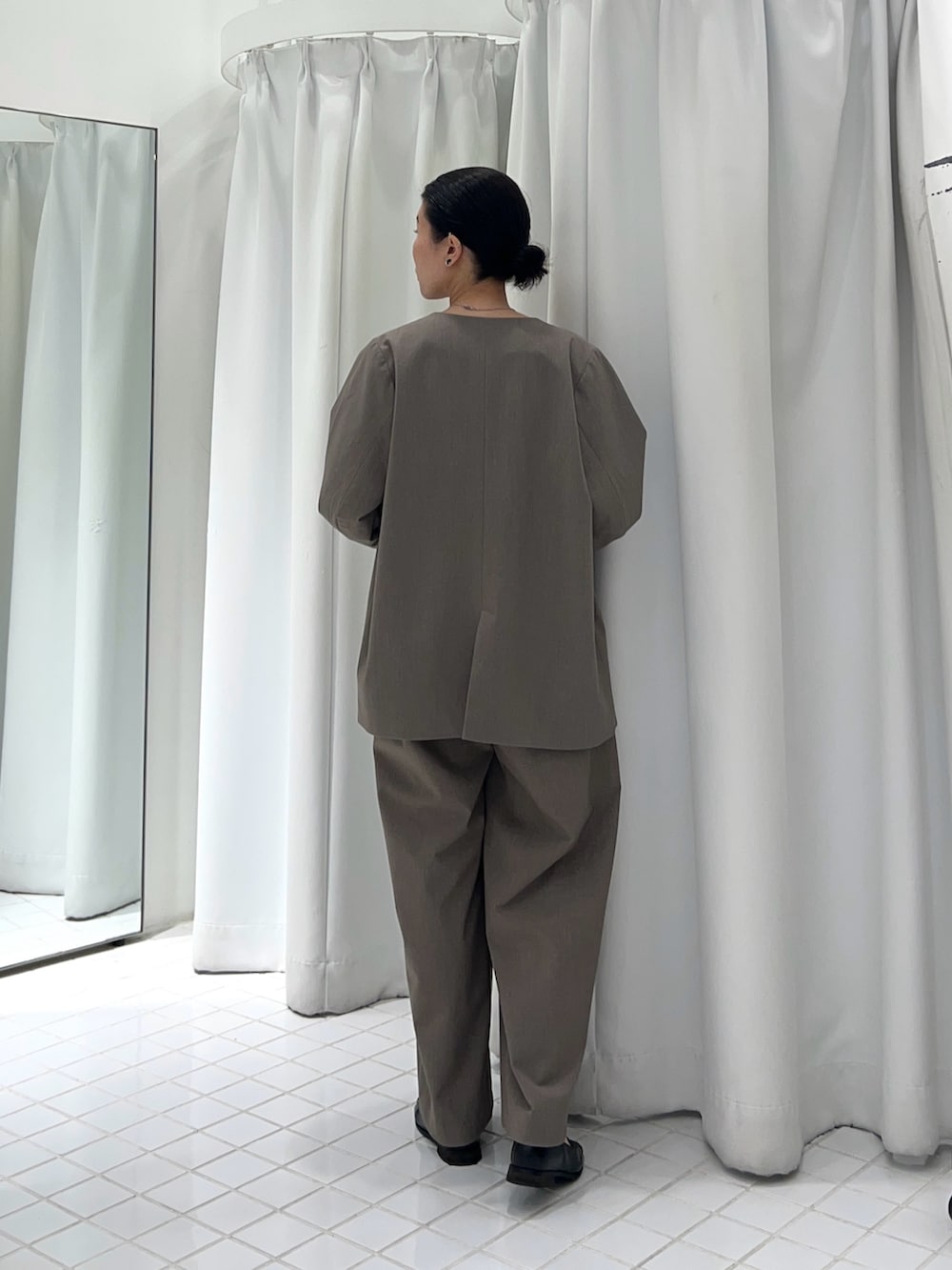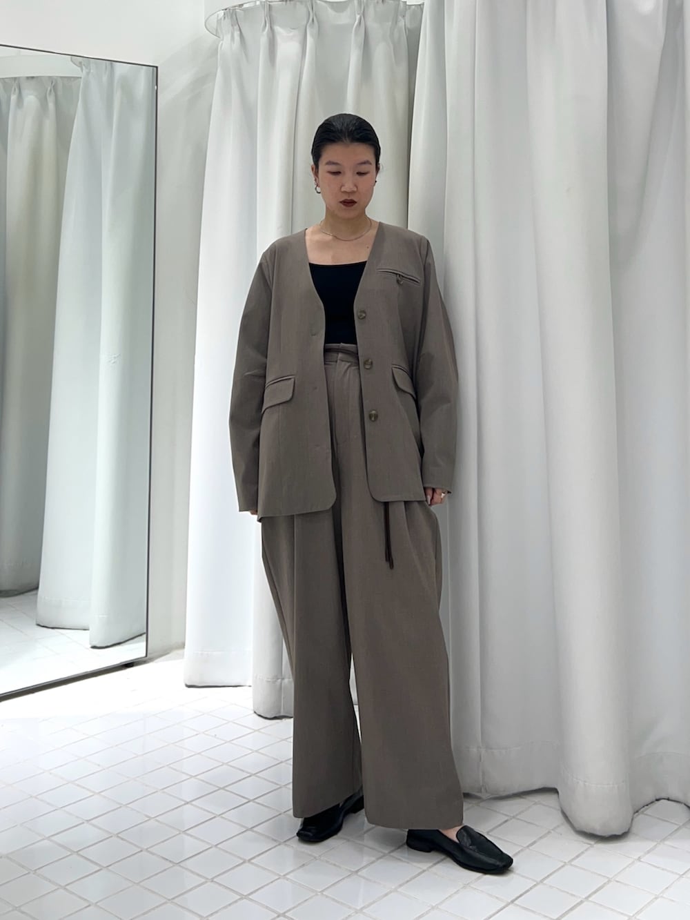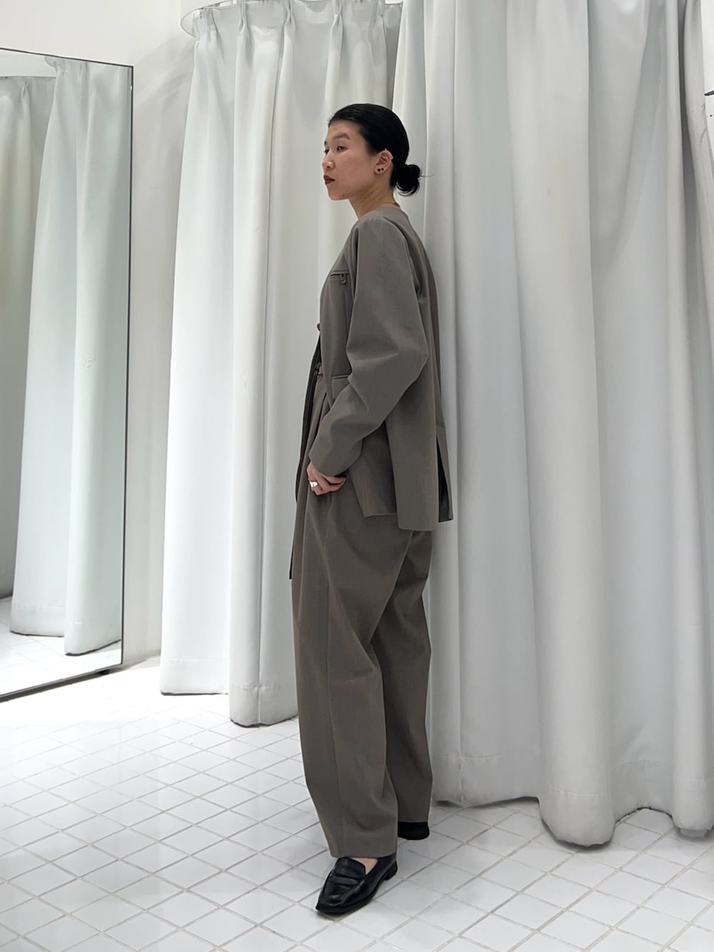 ジャケットは前を留めるとボタンが見えなくなるので、よりカチッと見えします✨