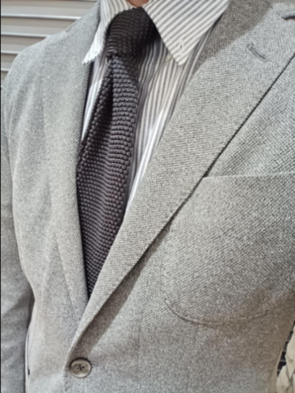 グレーのジャケット、グレーストライプのシャツ、グレーのニットタイ、チャコールのコットンパンツを使用しています。