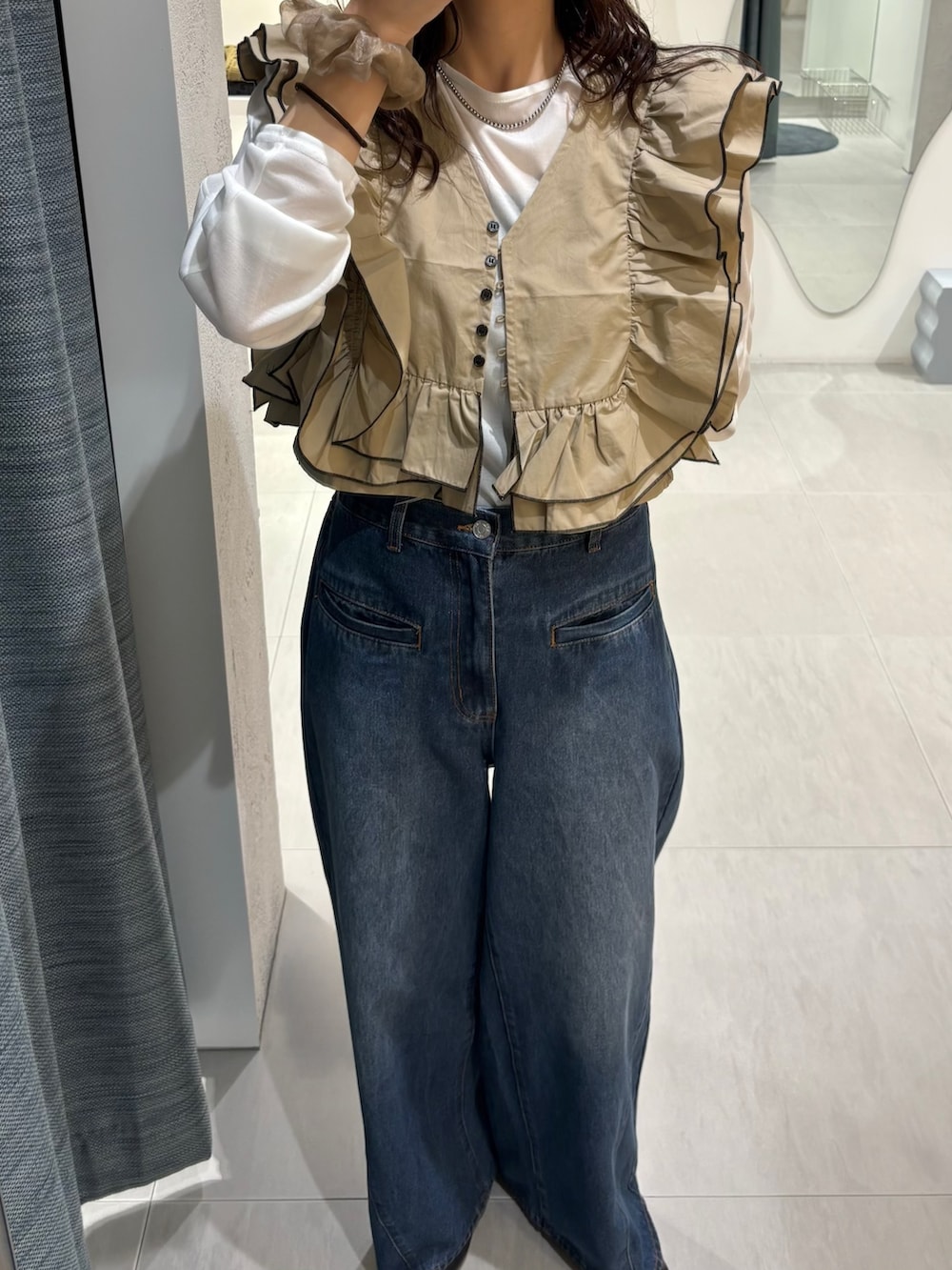 フリルの存在感が可愛い2WAYバイカラーフリルブラウス!今の季節は薄手のカットソーなどで合わせて夏はカップインキャミソール合わせで長く着ていただけます✨