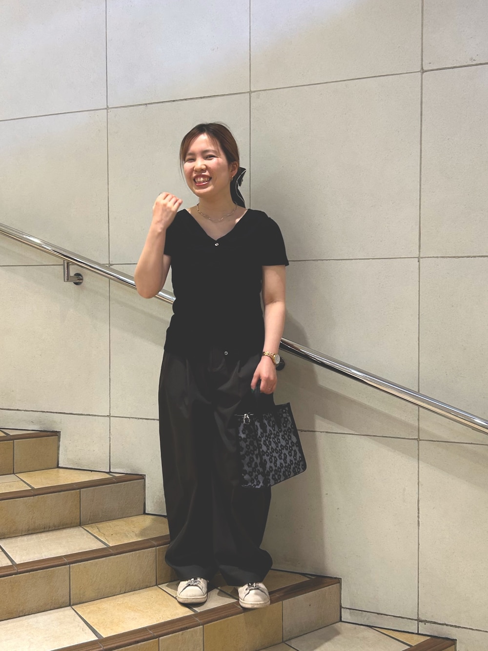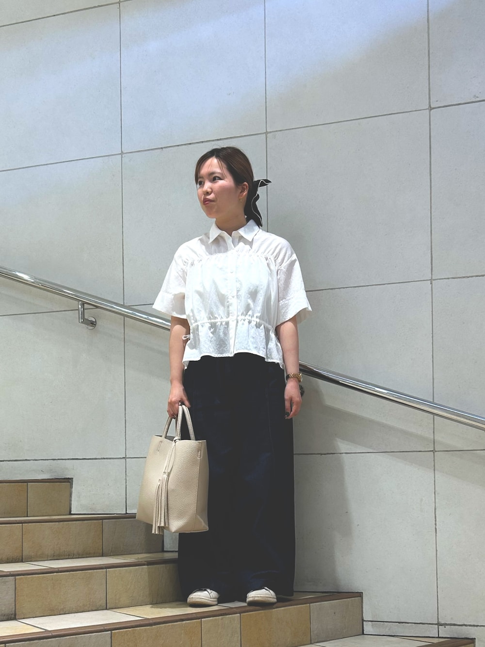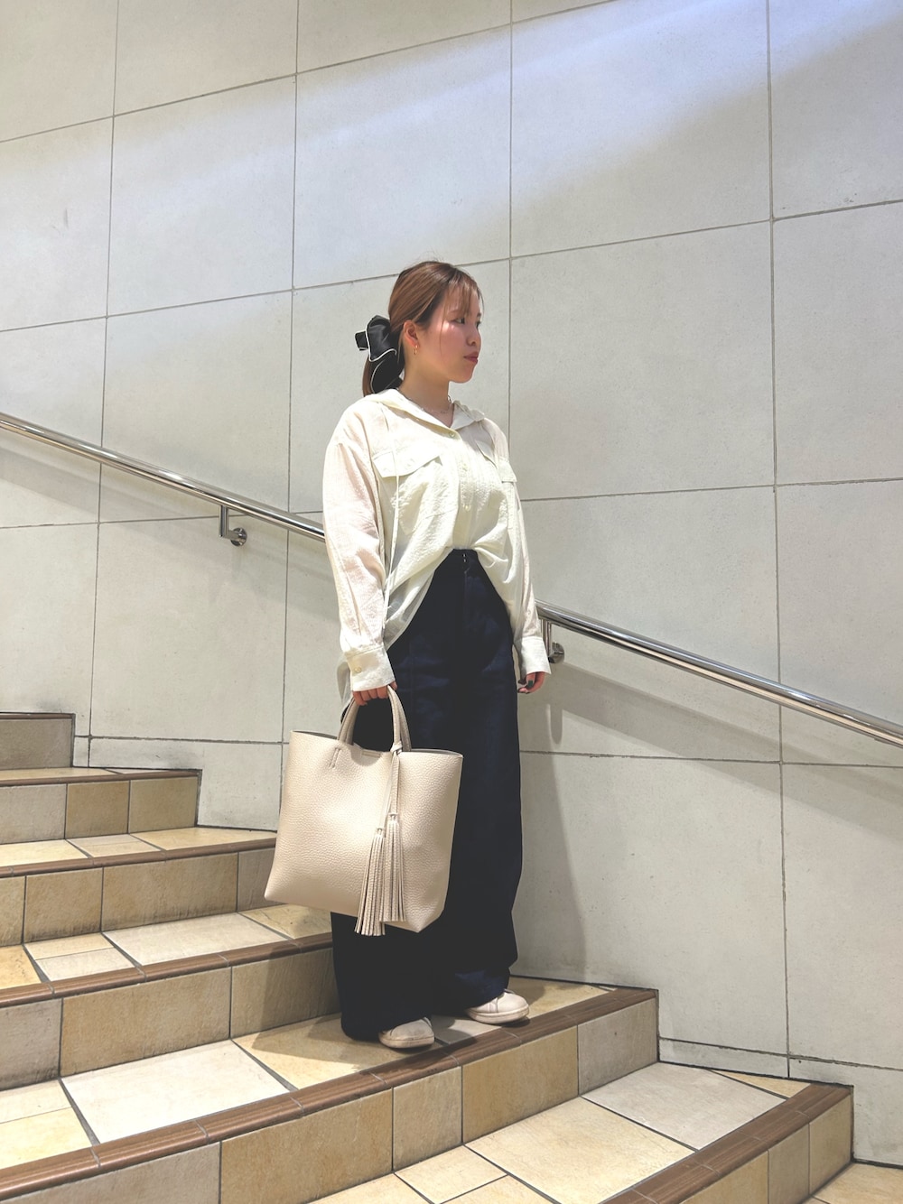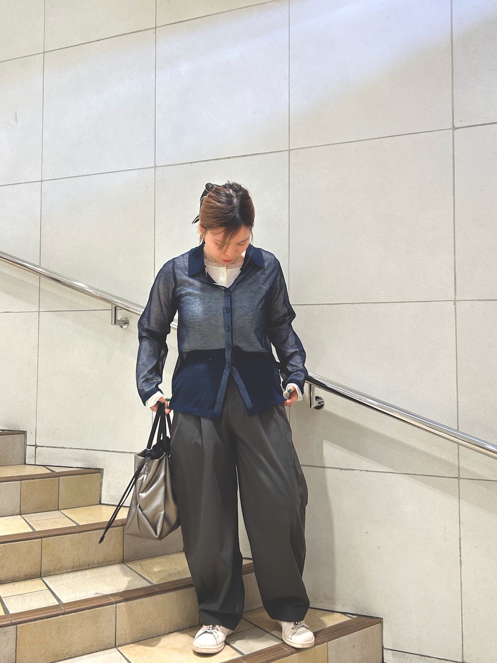 インナーの白を透かして軽やかさを出し、チャコールグレーのワイドパンツで全体を引き締めました🎶