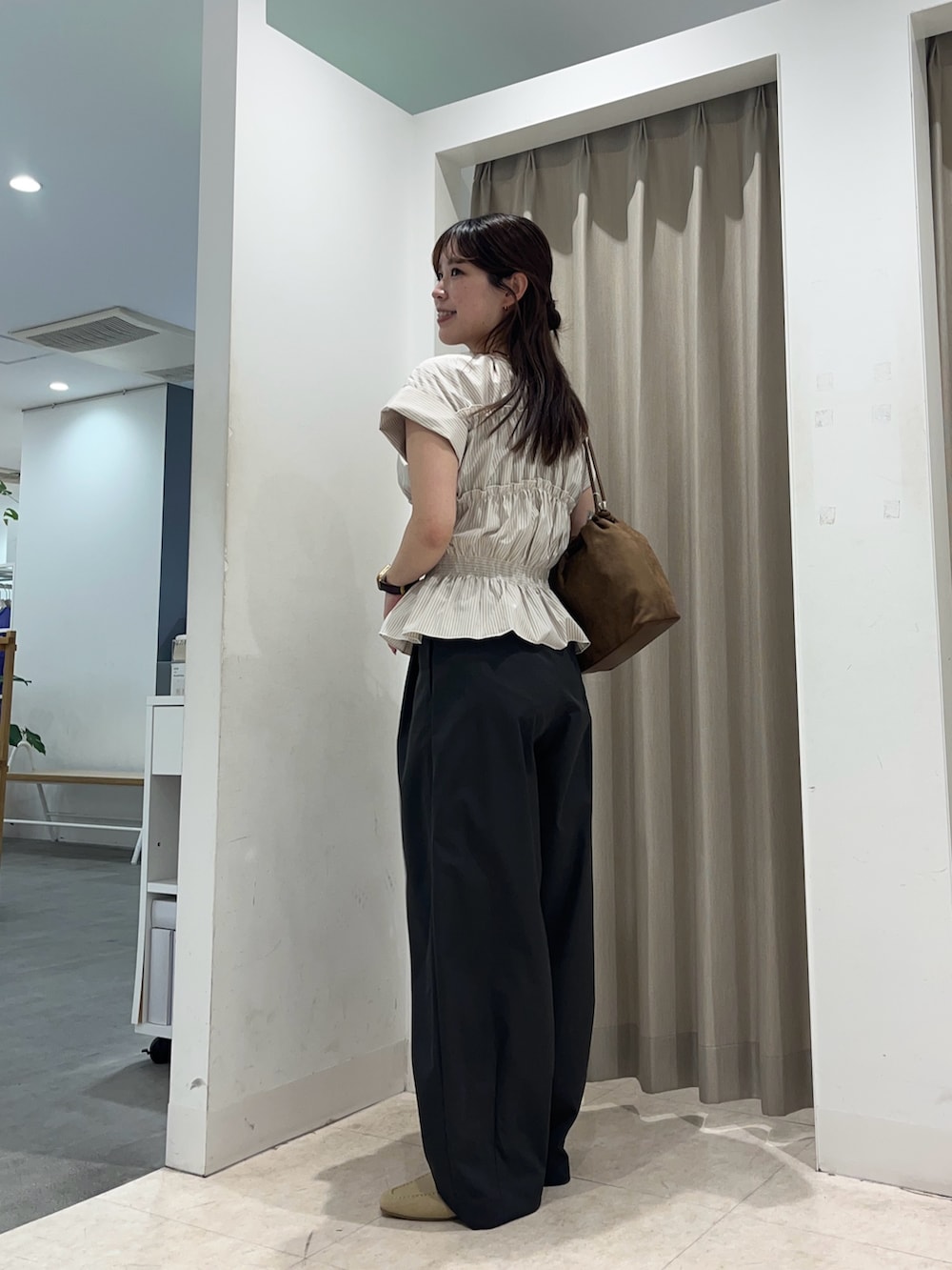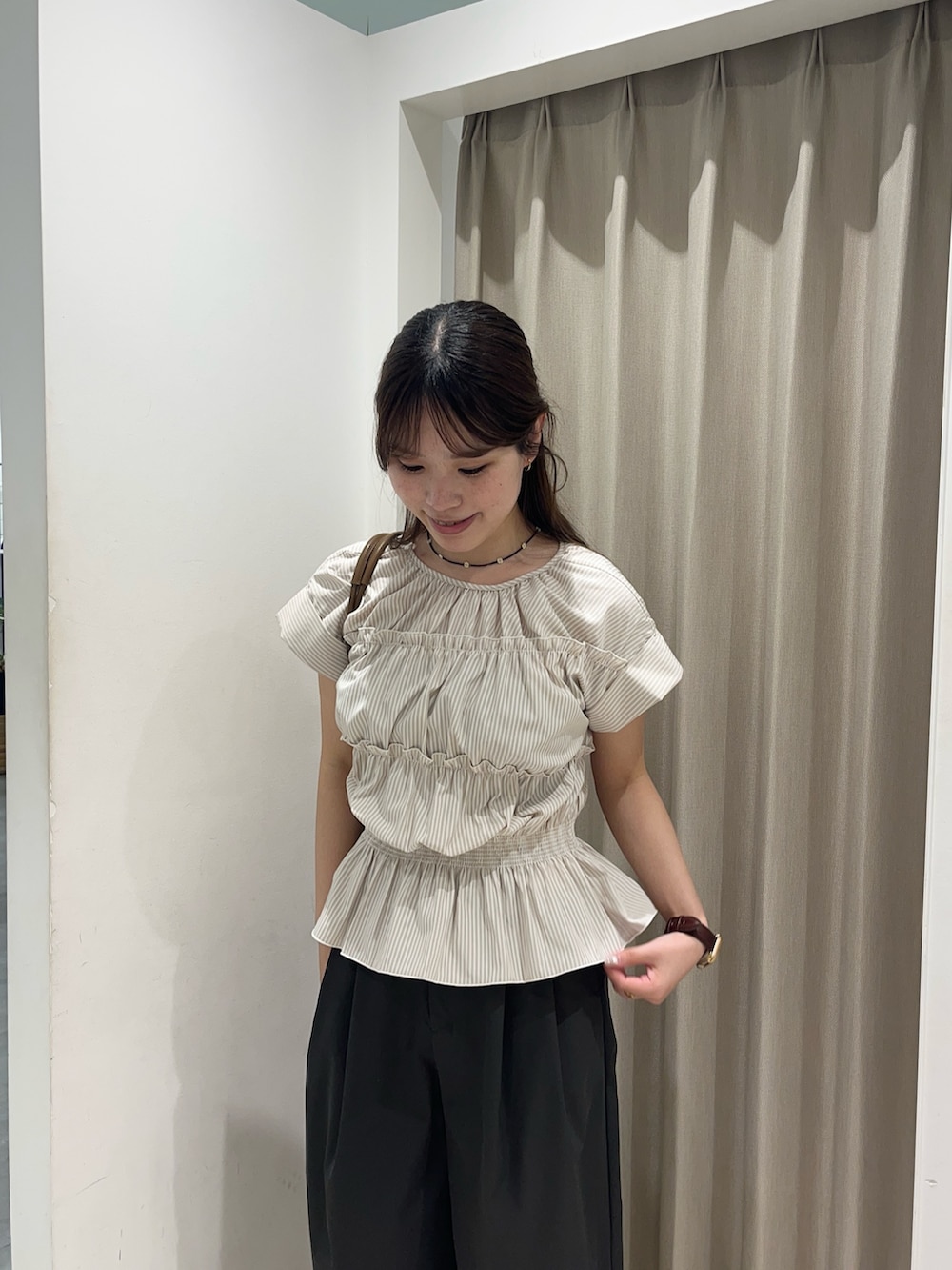 トップスのシャツはウエスト、バスト部分のシャーリングがゴムになっていて不思議なほど細見えします◎肩周りも華奢見えさせてくれるのでぜひ店頭でお試しいただきたいアイテム。