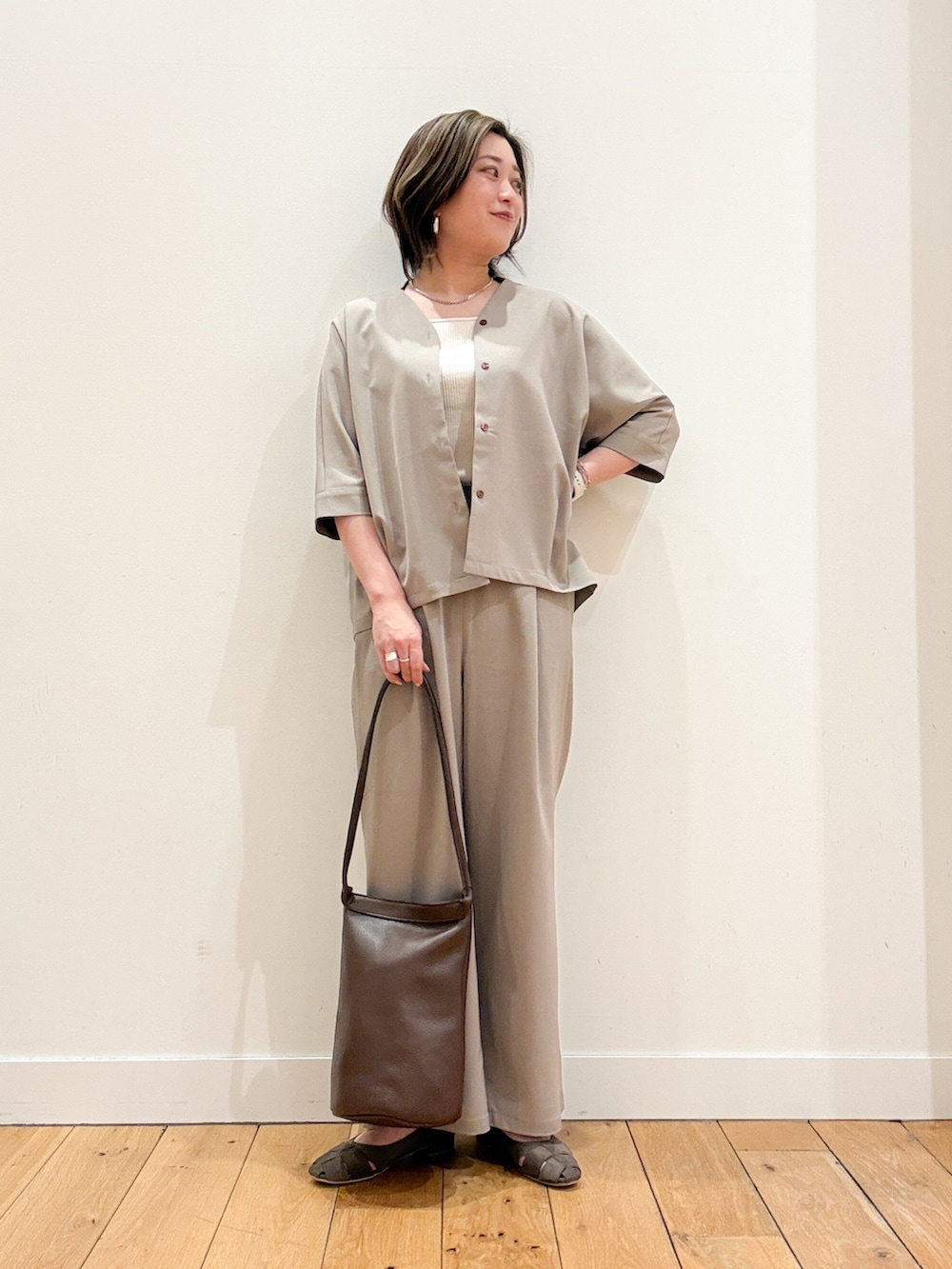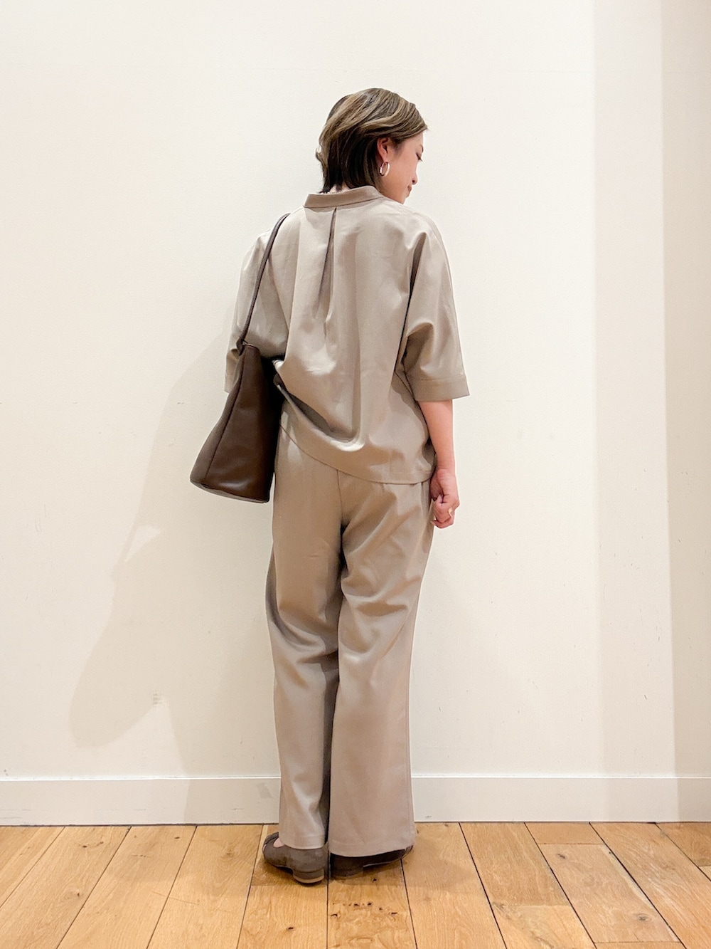 シャツは肘の隠れるハーフスリーブで身幅はゆったりしているので羽織にもおすすめ。