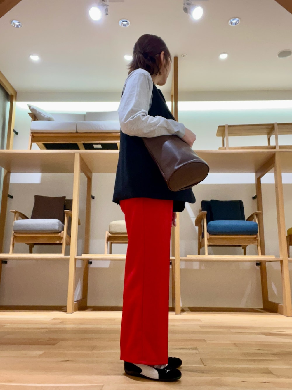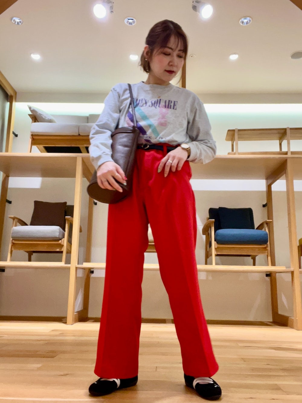 ボトムは別注のメンズアイテムを使用しました‼︎REDカラーが可愛く主役級なアイテムです‼︎