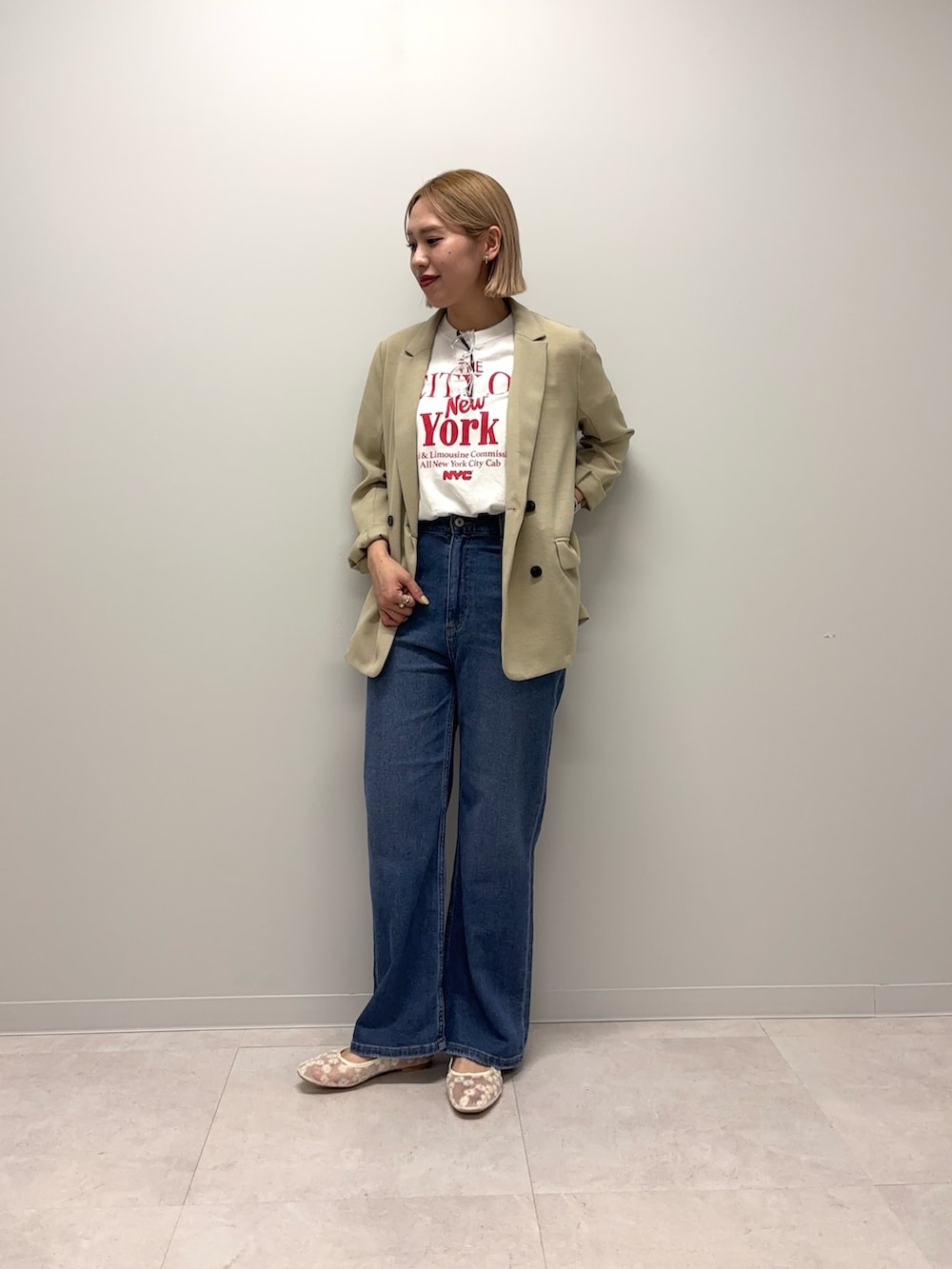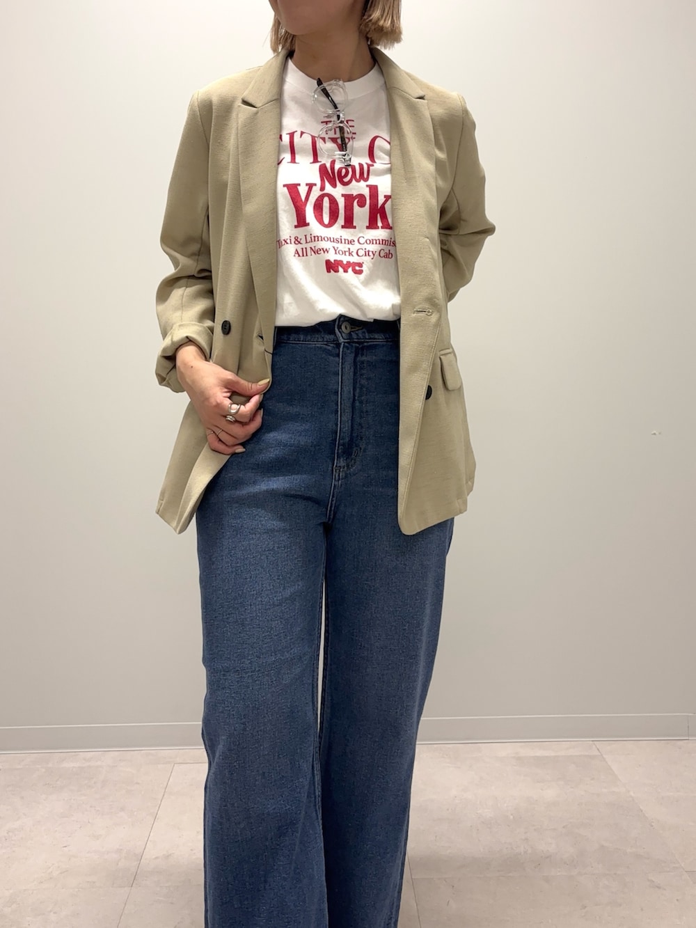 インナーは赤ロゴが映えるTシャツでカジュアルに合わせております!