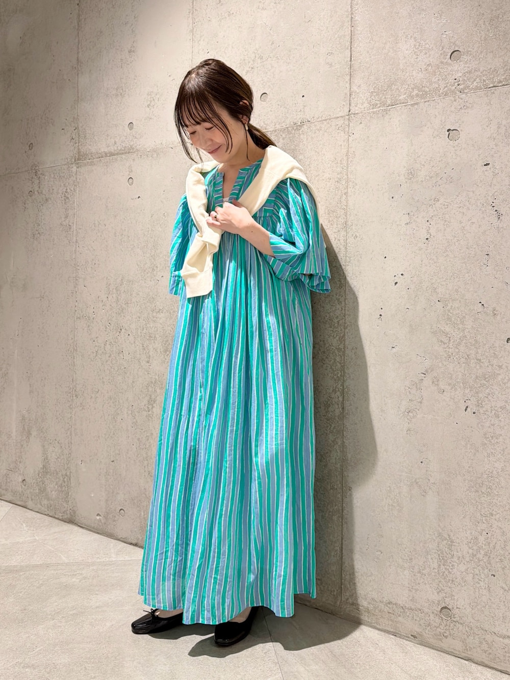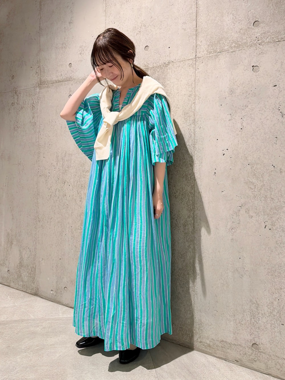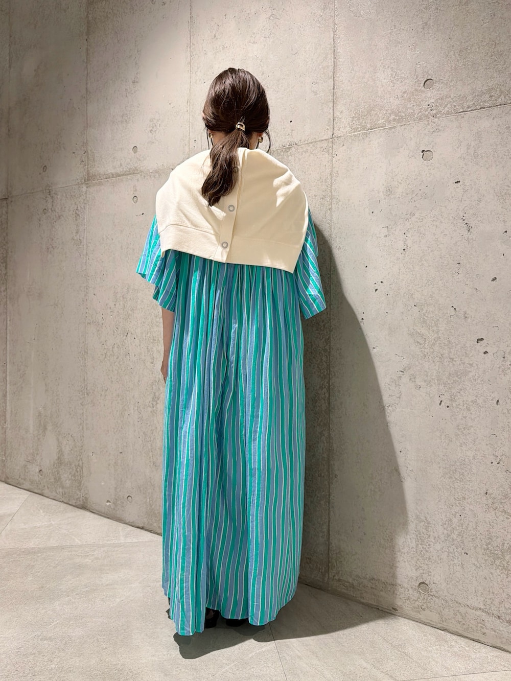 今回は、気温に合わせて羽織れる、便利なカーディガンを肩掛けにしてアクセントにしてみました。