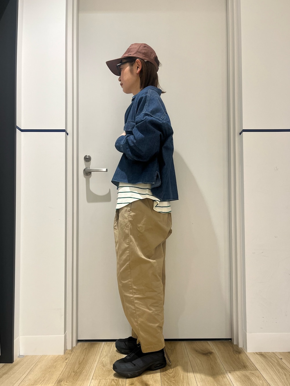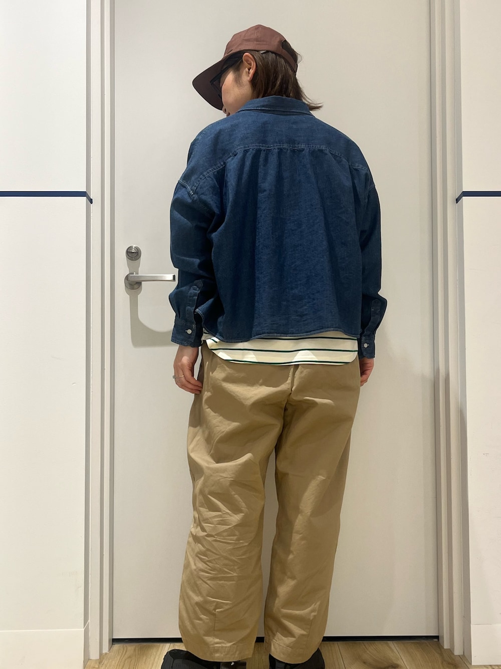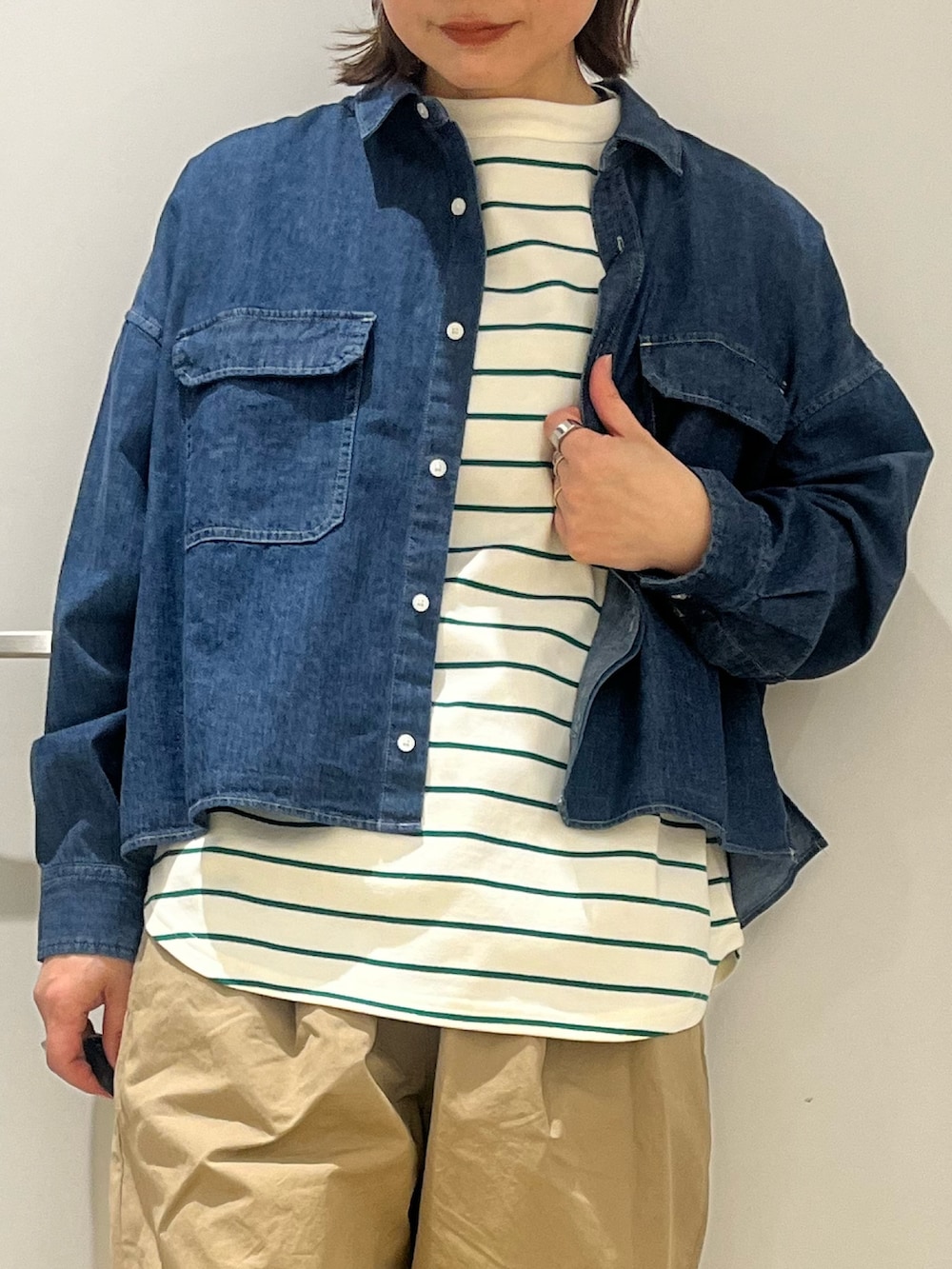 ショート丈のデニムシャツを羽織った