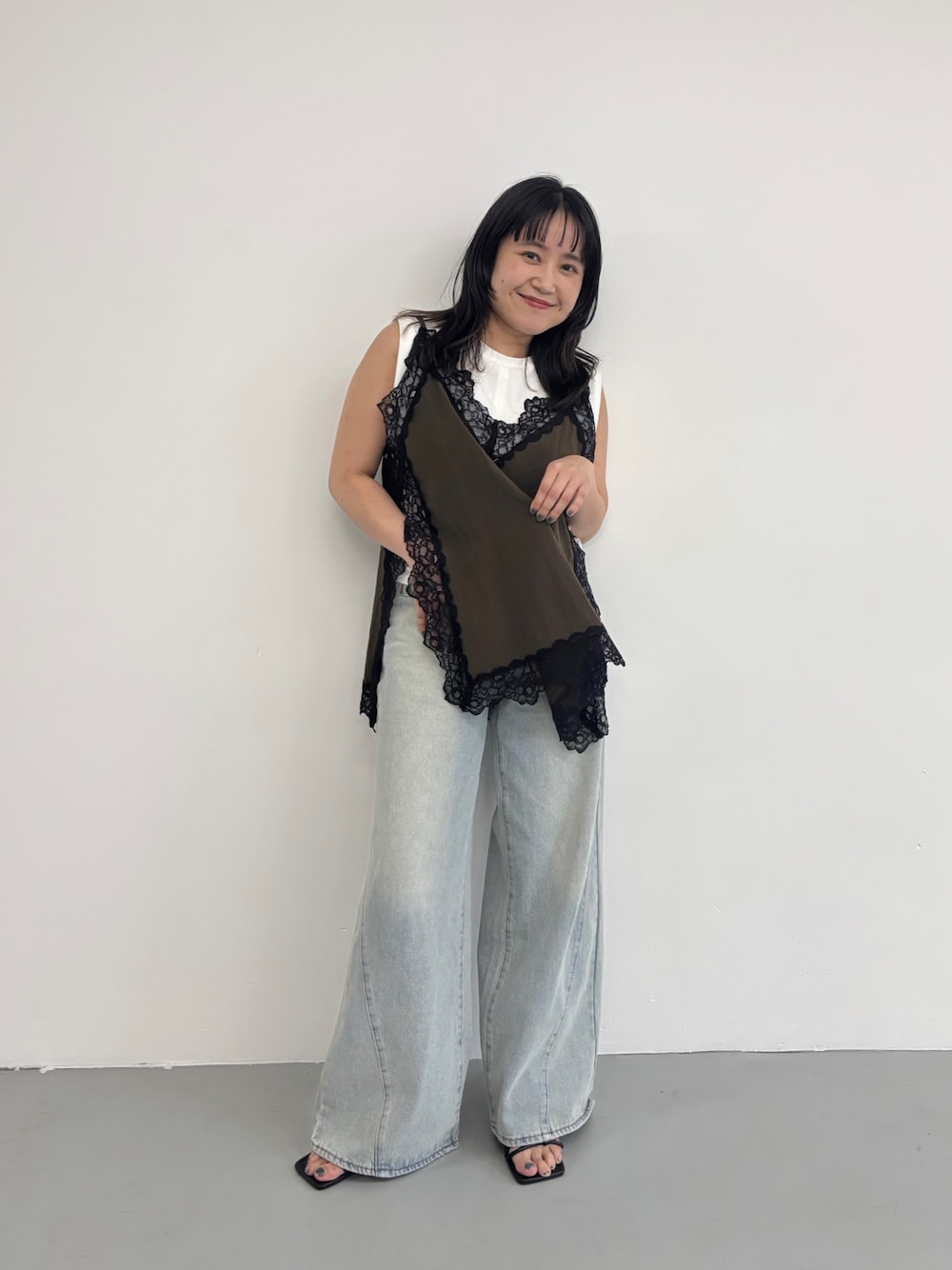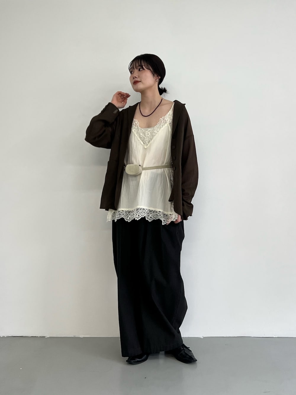 ブラックのレースキャミを主役に、甘さの中に大人っぽさをプラス。