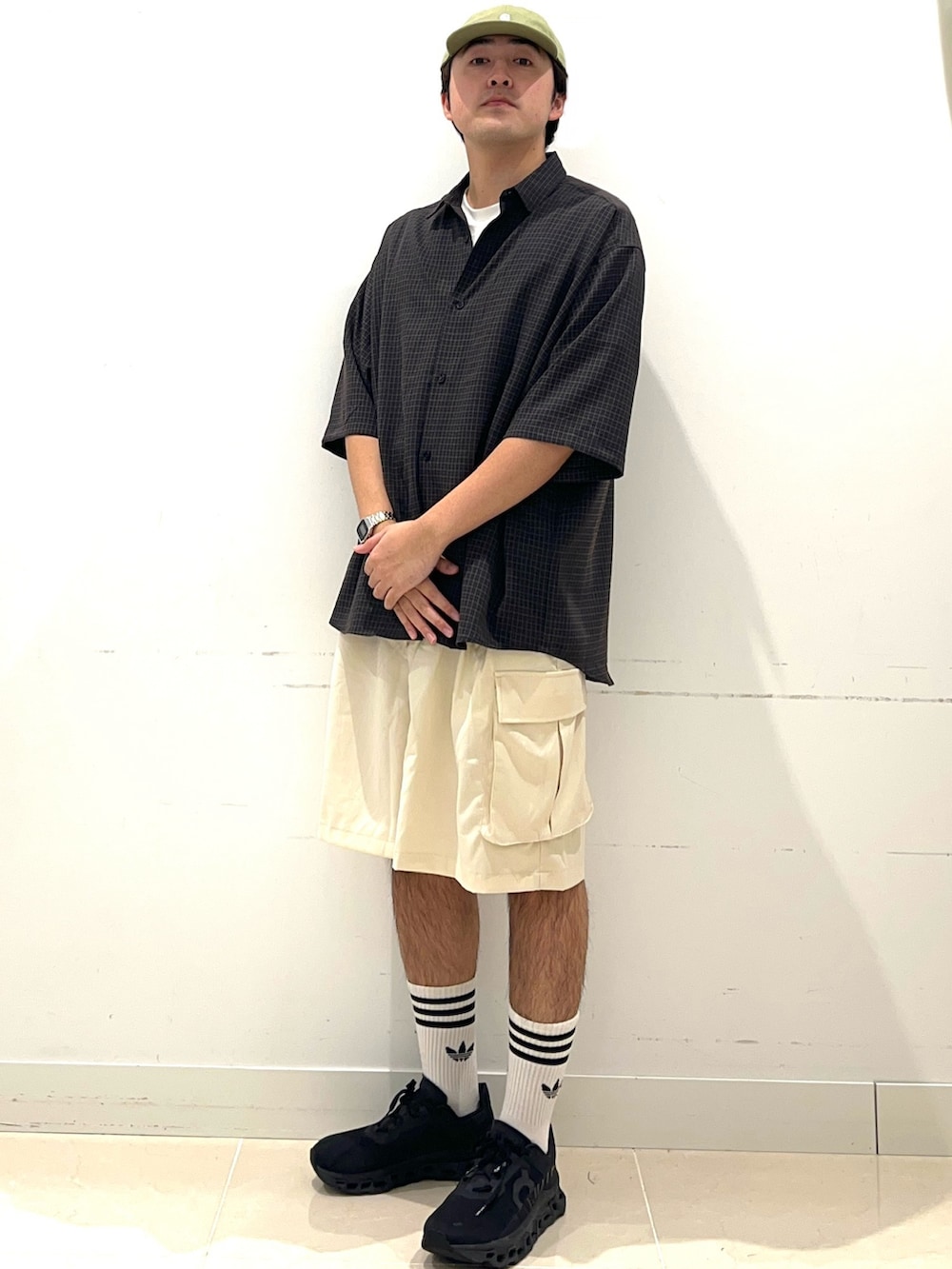 今回はネイビーでワイドシルエットのチェックシャツを夏らしいワイドカーゴショーツで合わせてみました。アクセントにカーハートのキャップをかぶってアウトドアでも過ごせるスタイルです!