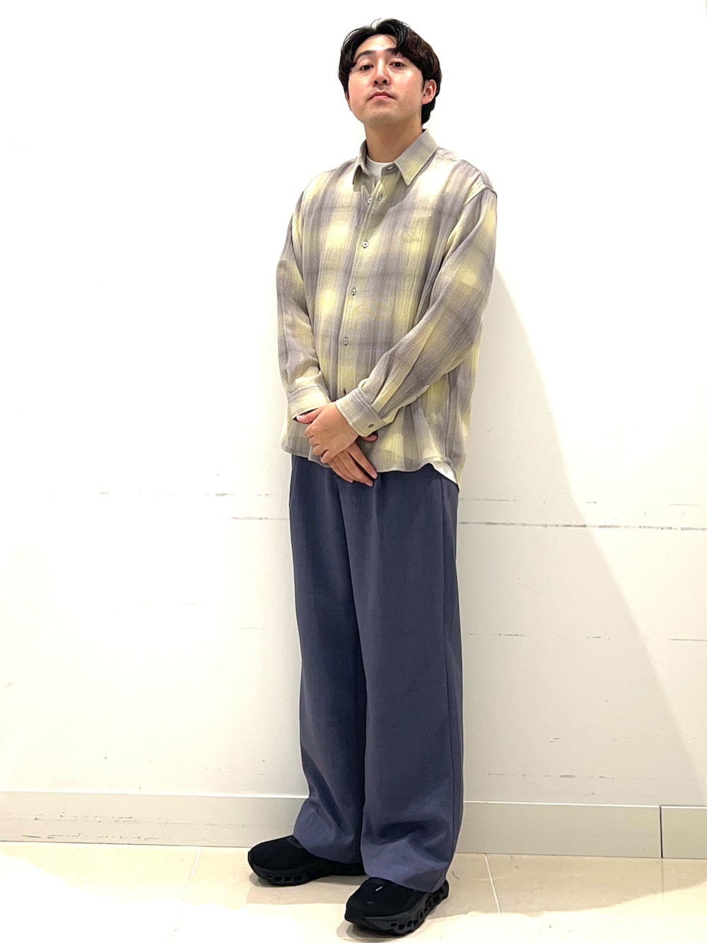 シャツはこれからの季節に最適なシアーシャツ、ボトムはUVカットや接触冷感など多機能アイテムUR TECHのスラックスで合わせてみました!