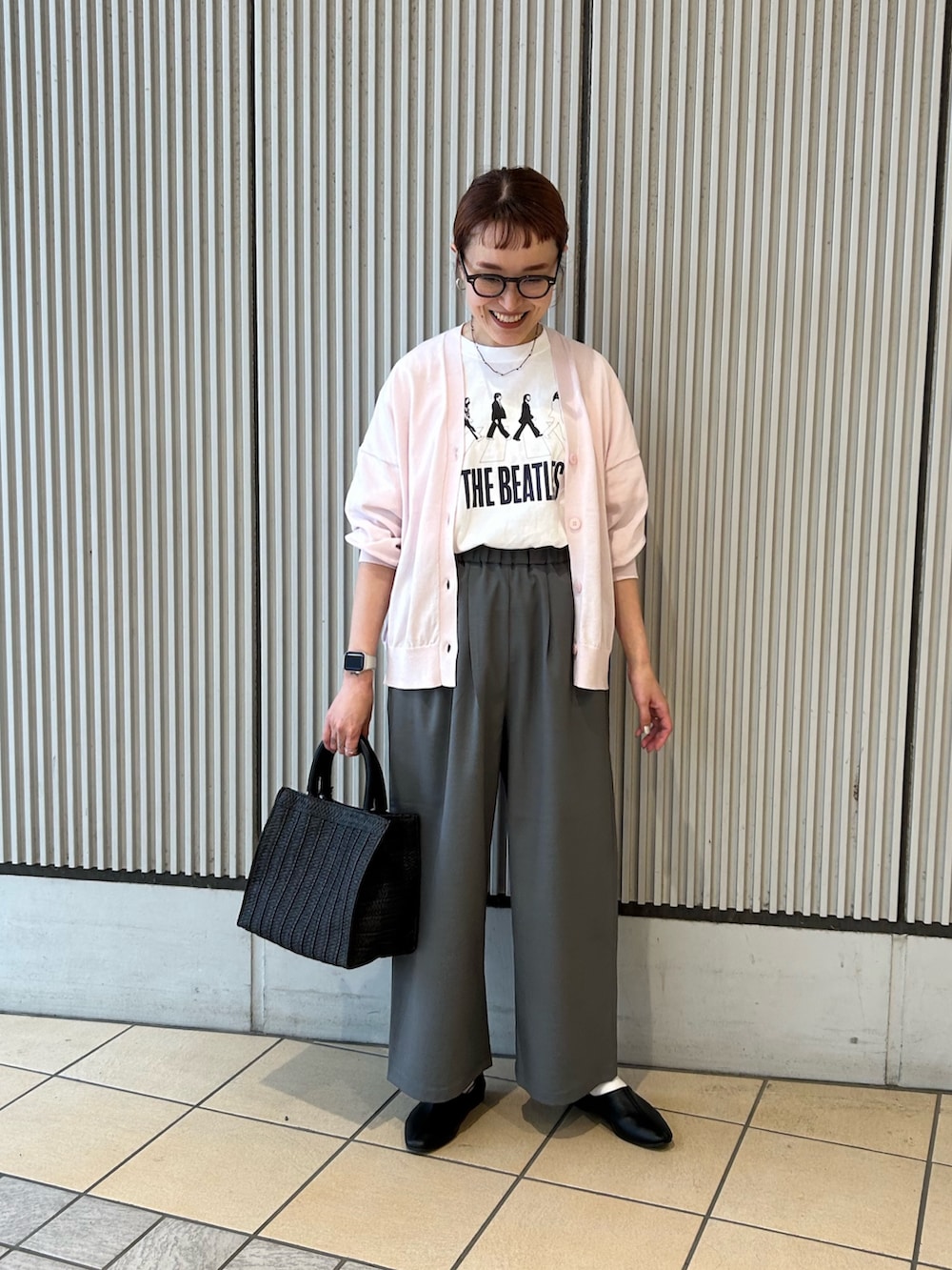 インナーはビートルズのTシャツで、カジュアルお出掛けコーデです。