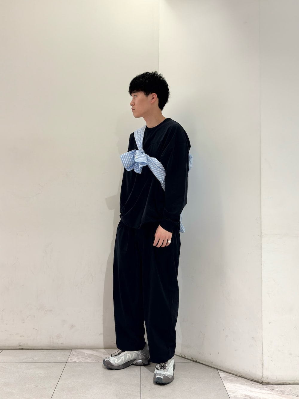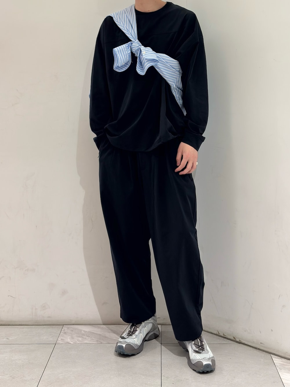 WIDE DADはなんと言っても色がいいですよね。ダークネイビー。全体が引き締まる感じはするけど、重たくはならない。絶妙な光沢感と生地の軽さがスタイリングに軽さを出す。