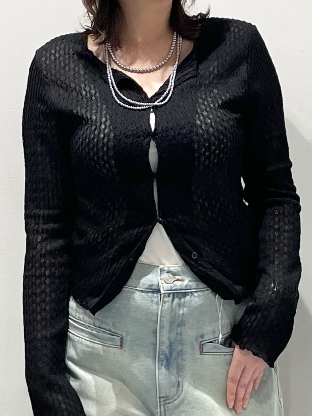 前開き仕様なため、羽織としても活用いただけます。キーネックのデザインでデコルテ部分がすっきり見えるのがポイントです!