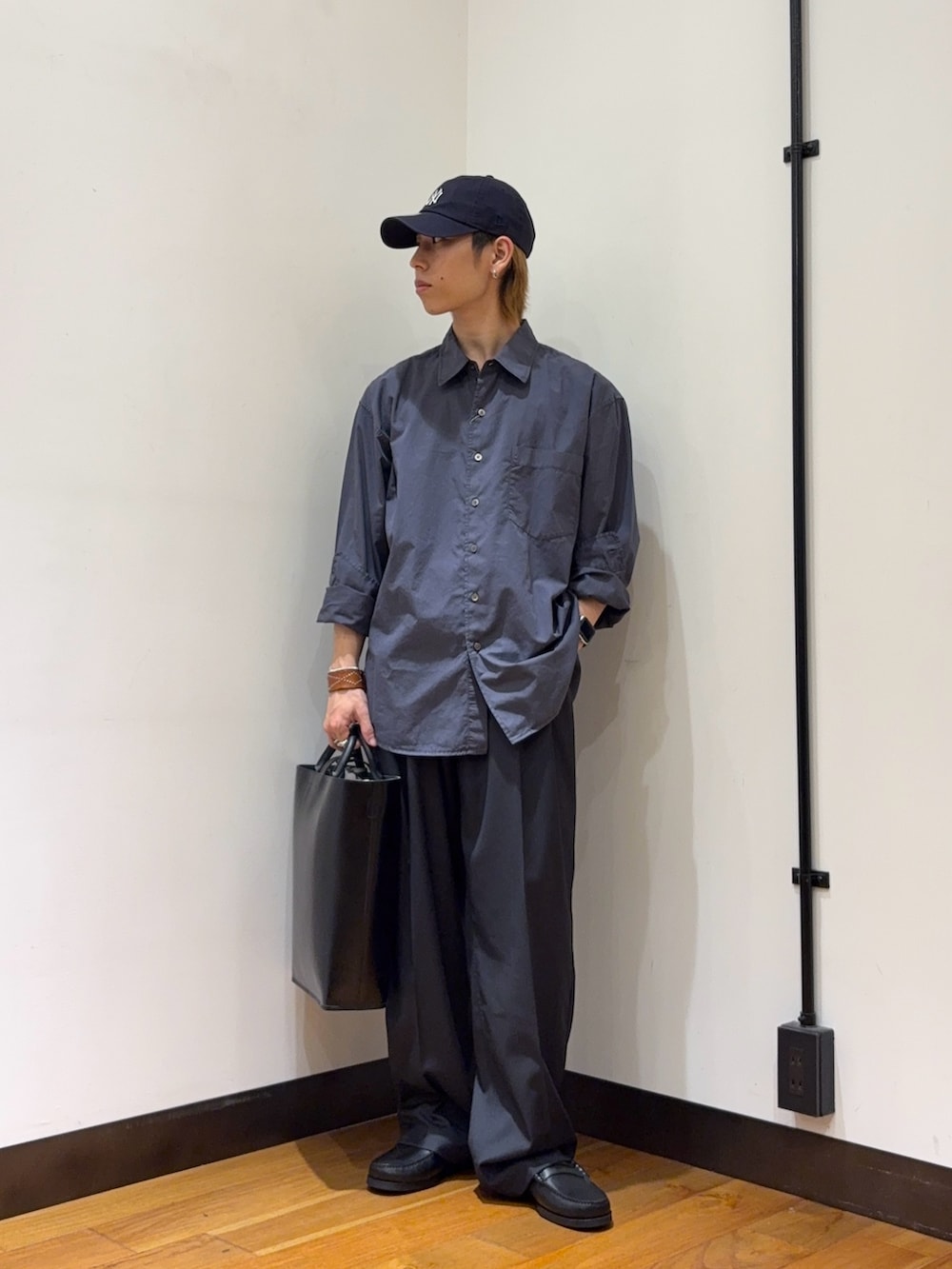 シャツは程よいこなれ感の出るワークシャツです。ハリ感と色味の深さが魅力の長袖シャツで春から初夏の羽織りに最適です。サイズ感も本当に絶妙で大きすぎず小さすぎない完璧ななサイズ感です。
