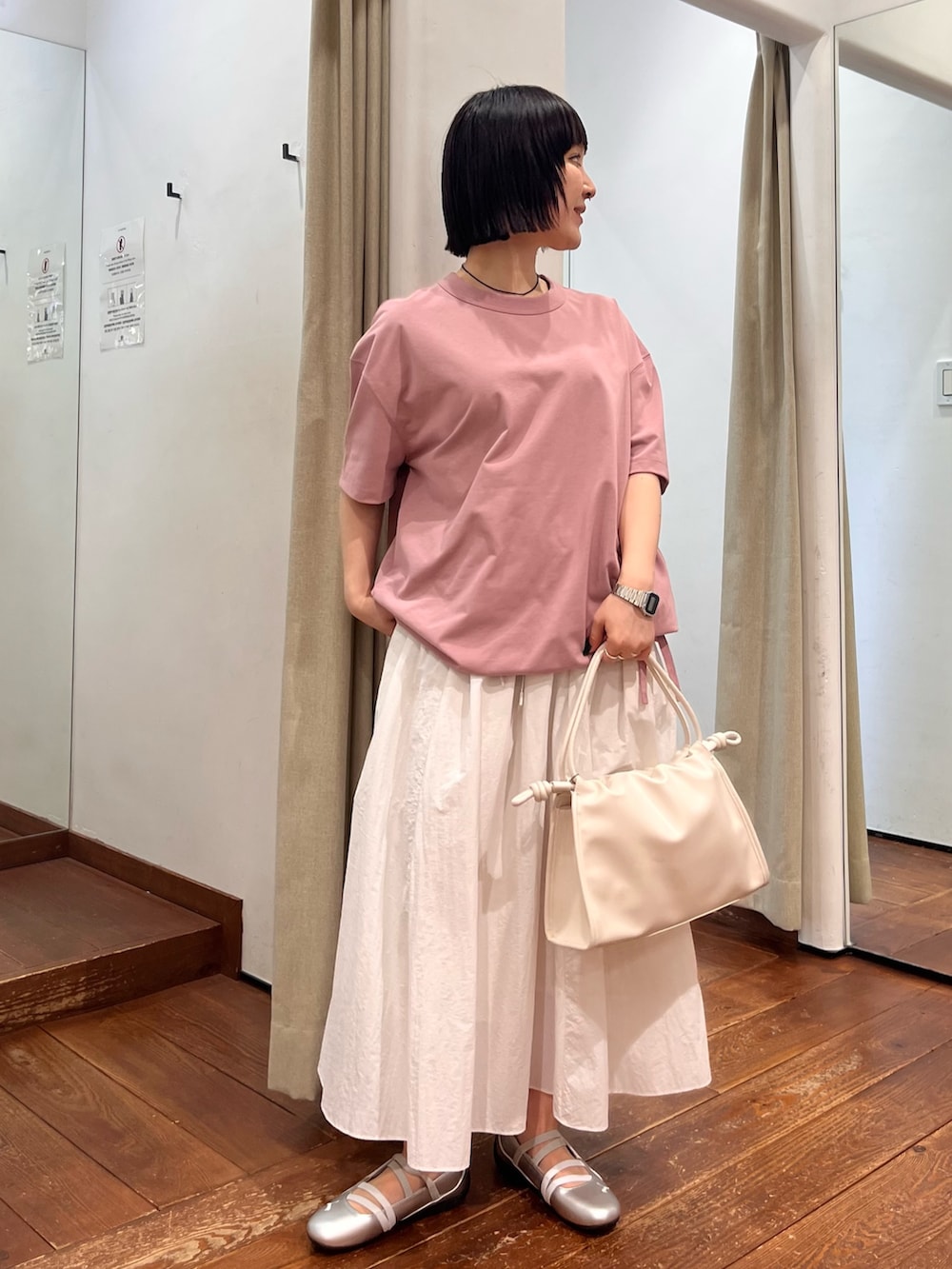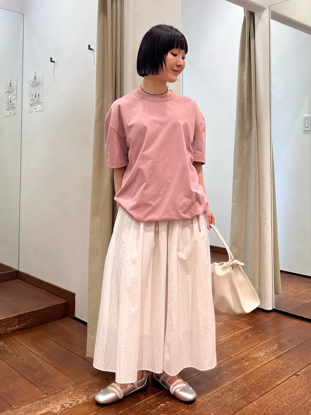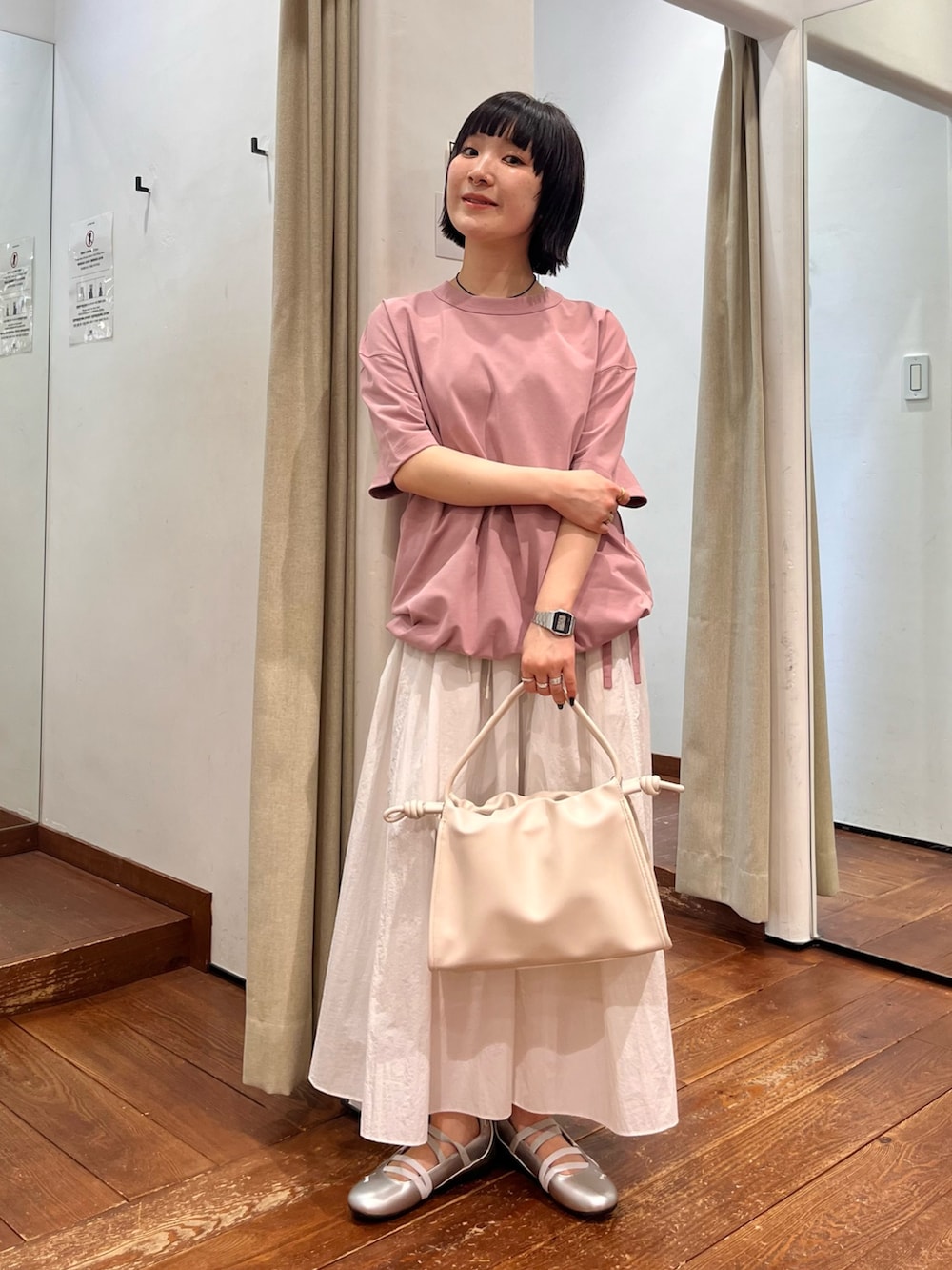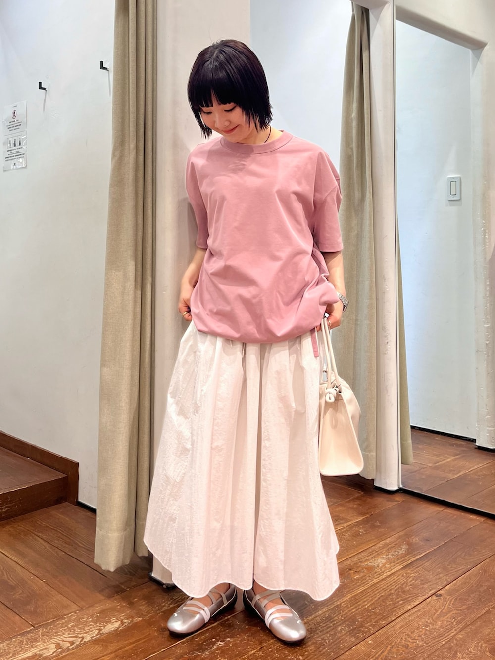 裾は絞れるので、ギュッとバルーン形に変えても◎速乾性のあるパリッとしたポリエステル地が、すっきりカジュアルな雰囲気に…私は“シアーナイロンギャザースカート”と組み合わせてみました