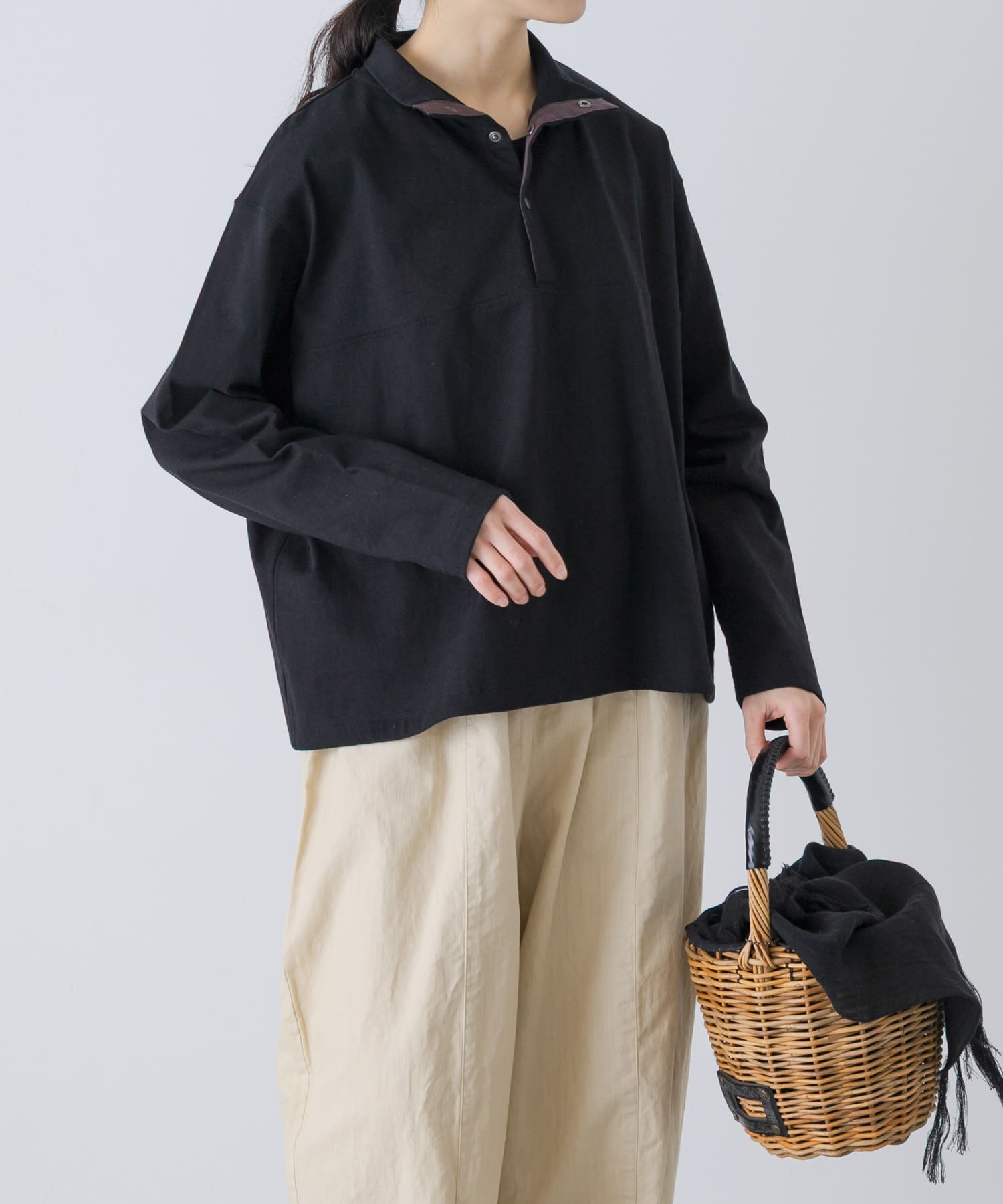 ハーフボタンがポイントのトップスは程よい厚みで着れる季節が長めです。中にシャツを入れてレイヤードスタイルもおすすめ◎