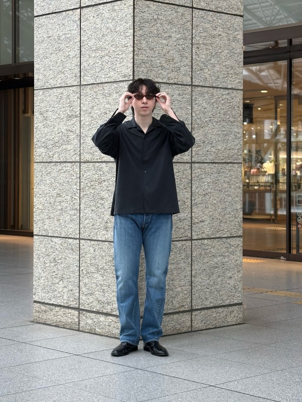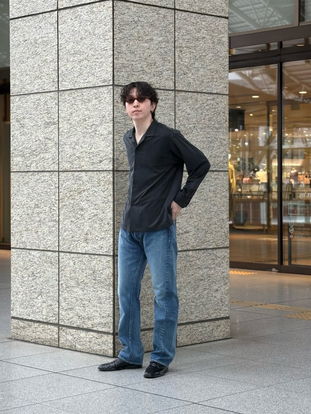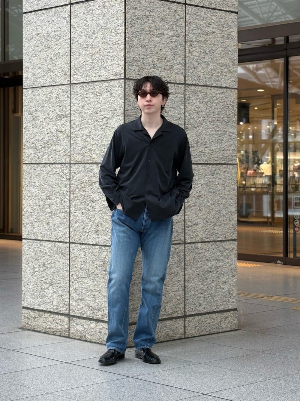個人的にはこういう綺麗めで上品なシャツだからこそ、エイジングが進んでいるブルーデニムを履きたくて、そこにスタイリッシュなサングラスをかけて、ちょい悪な感じでスタイリング組んでみました!