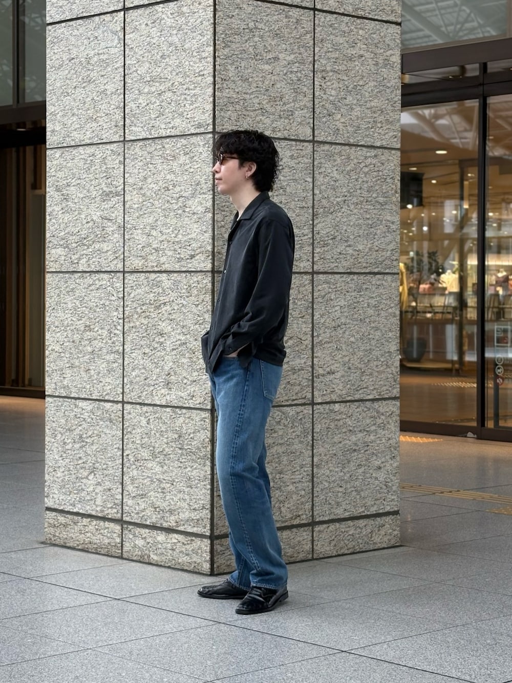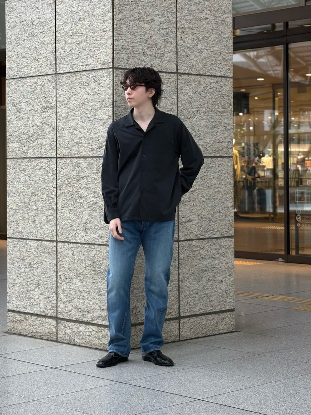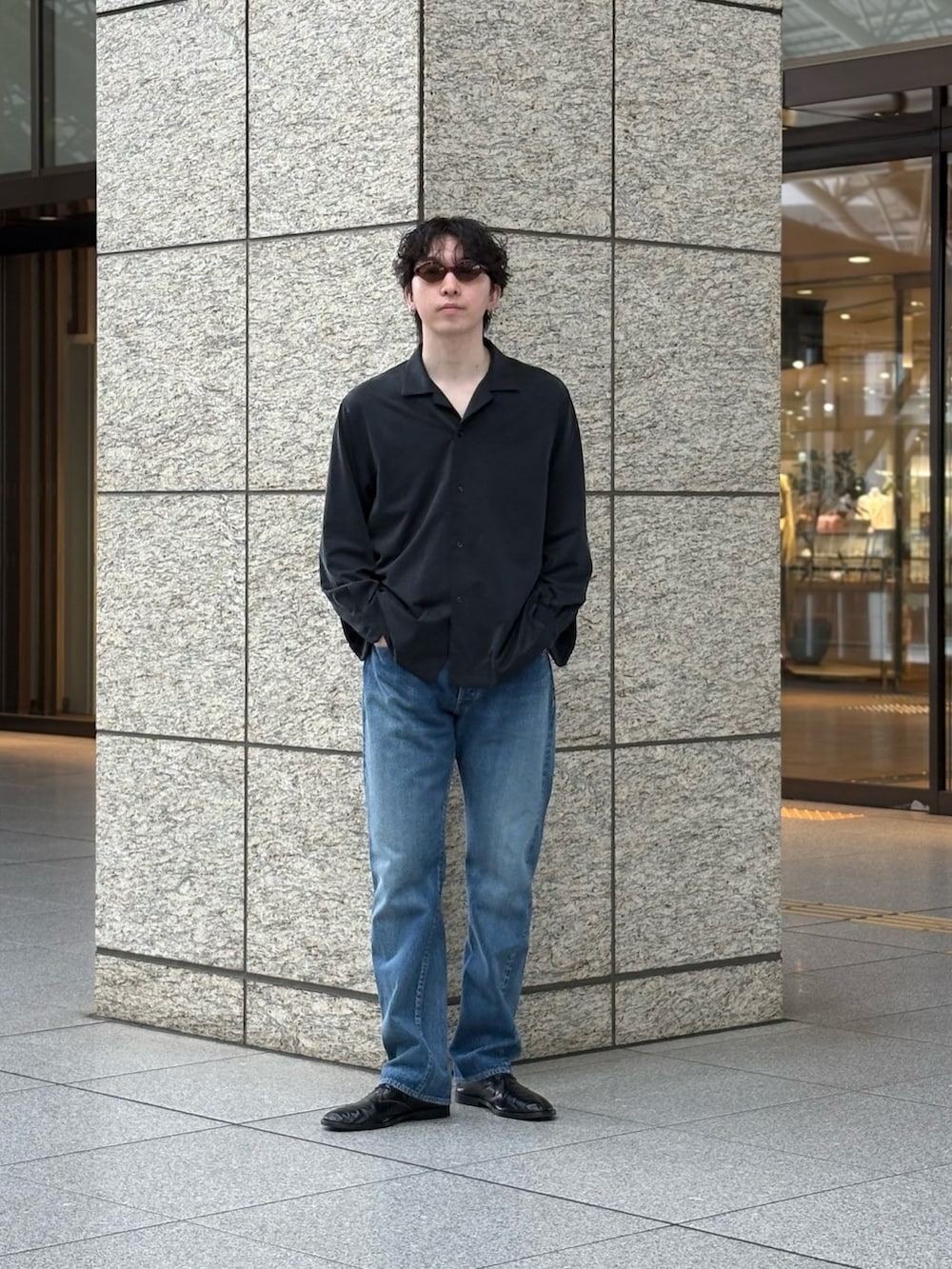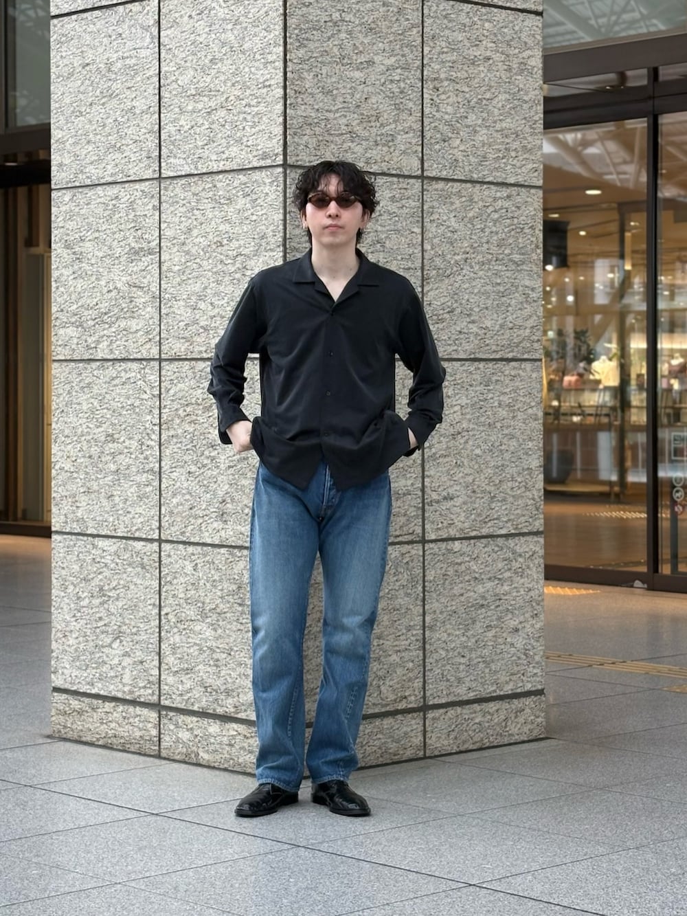 個人的にはこういう綺麗めで上品なシャツだからこそ、エイジングが進んでいるブルーデニムを履きたくて、そこにスタイリッシュなサングラスをかけて、ちょい悪な感じでスタイリング組んでみました!