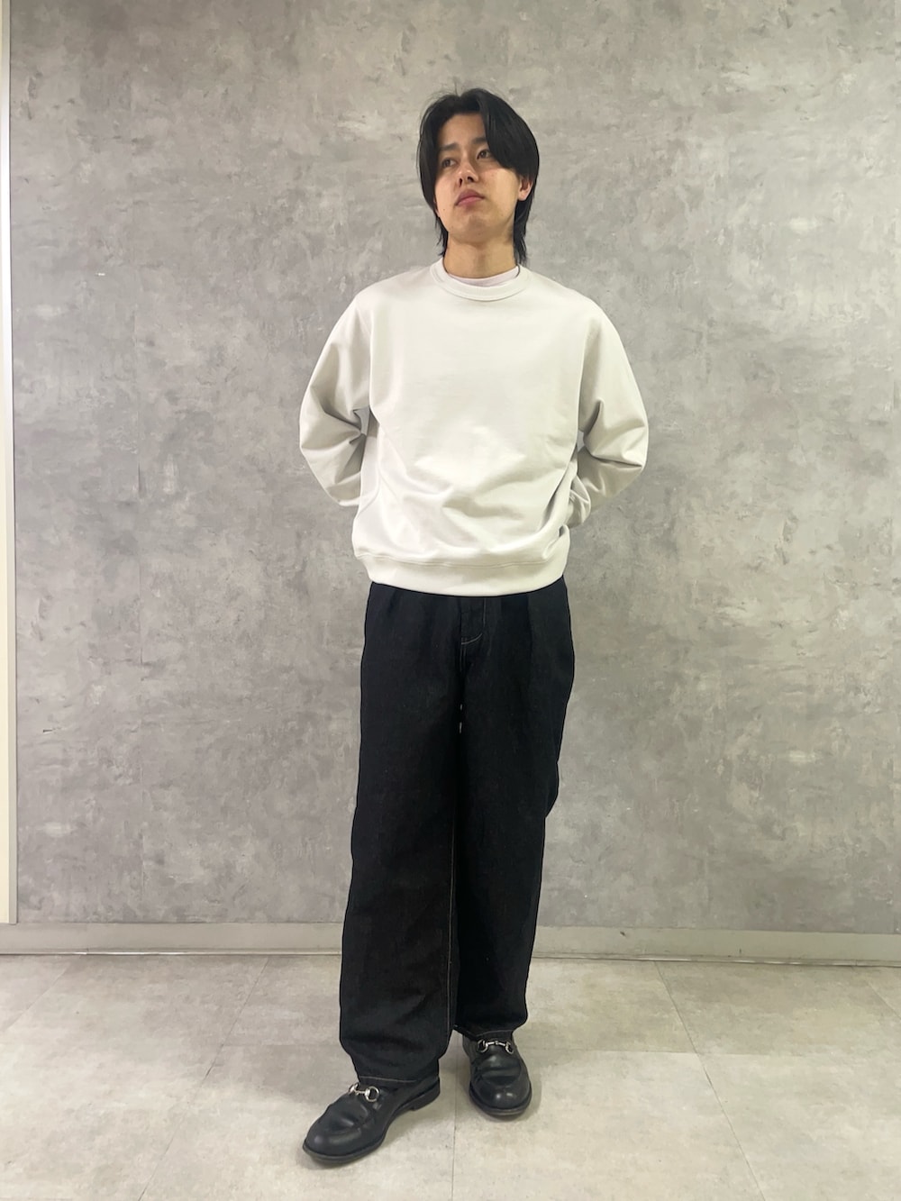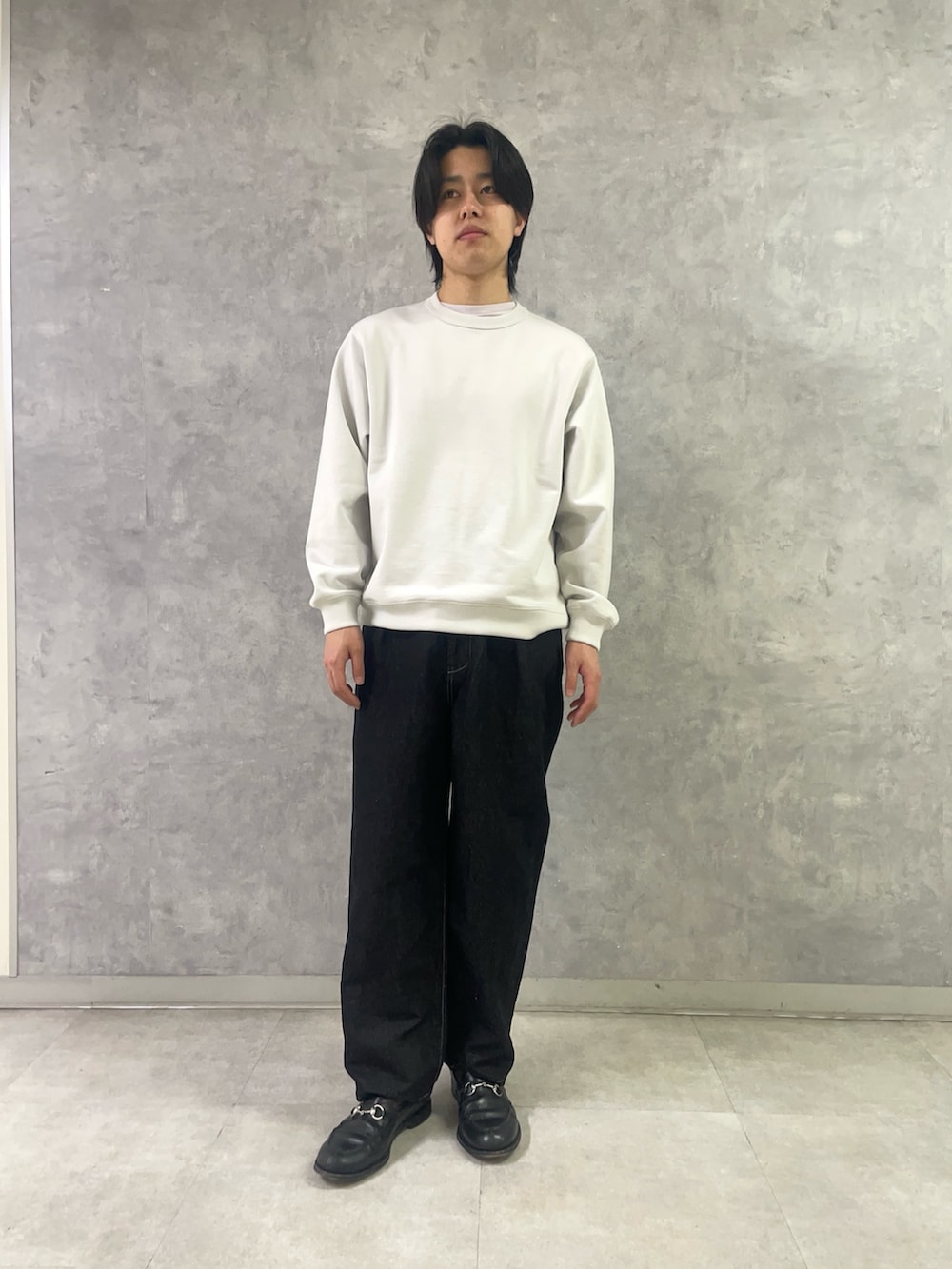 スウェット、デニム共に柔らかさのあるアイテムなので、綺麗めに落とし込みやすいです。